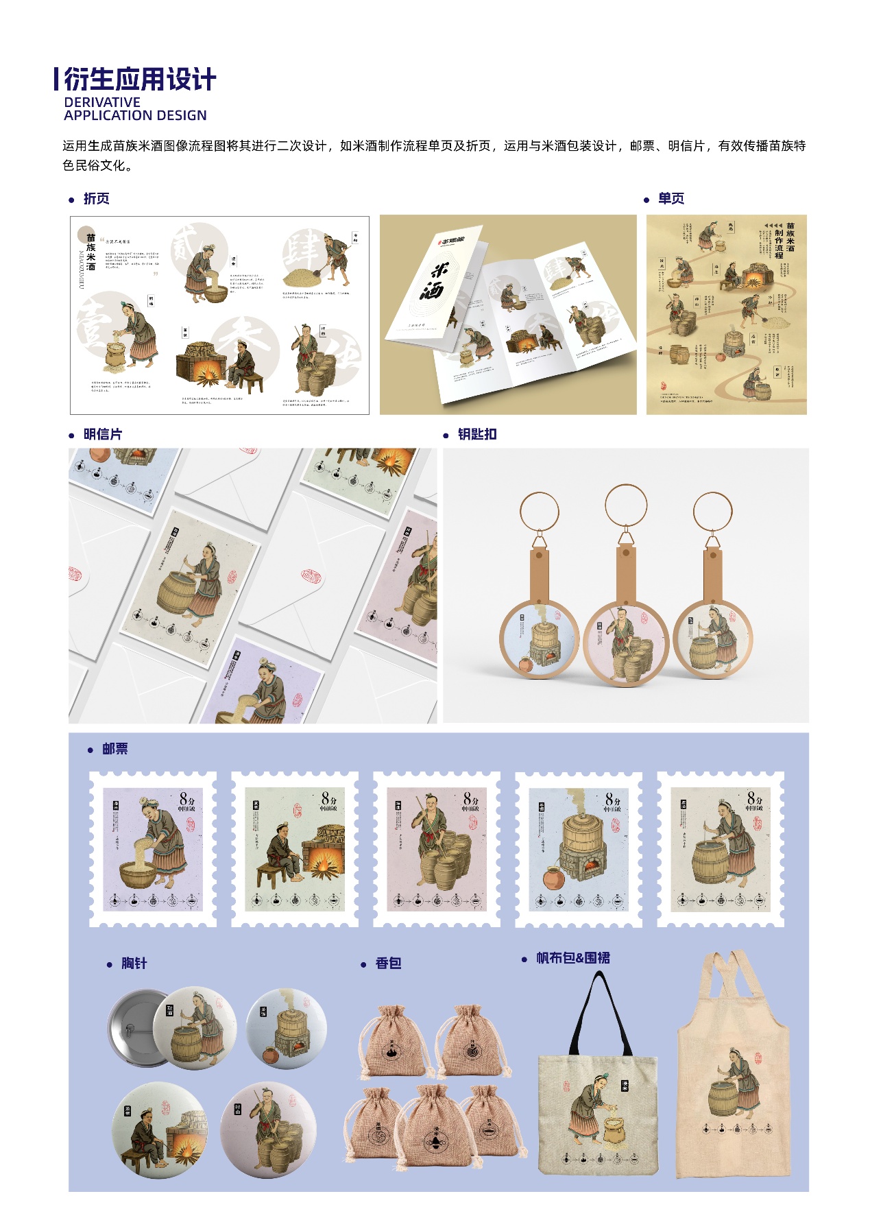 设计说明:本创作是通过 AIGC 对《百苗图》进行深度学习,构建百苗图风格特征专属LoRA模型,并运用 Stable Diffusion 中 Controlnet (Open pose 脚本)模型结合苗族米酒酿制过程,来辅助呈现具有《百苗图》风格的米酒酿造流程插图,将生成图像运用于视觉海报和包装设计、文创设计等推广物料当中,实现了《百苗图》智能辅助设计的数字化传承与创新应用,是传统文化与AIGC模型的现代化演绎。