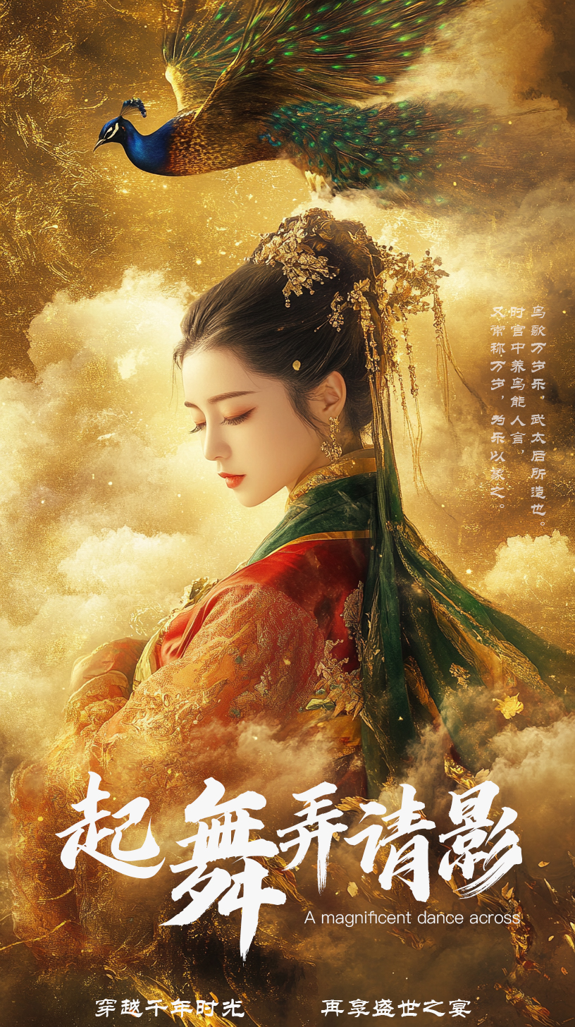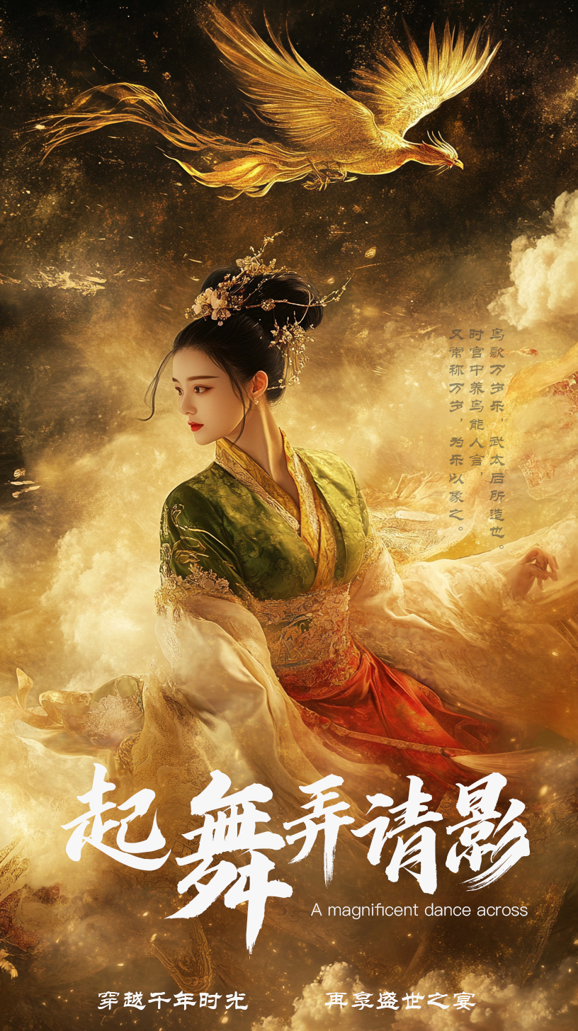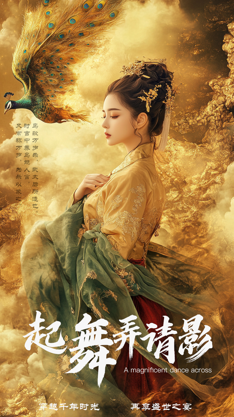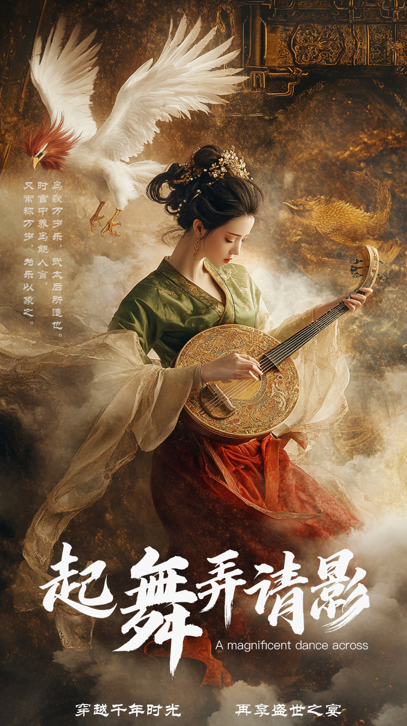设计说明:唐三彩乐舞俑,又名“鸟歌万岁乐”,为陕西唐三彩艺术博物馆的镇馆之宝,这组佣头戴鸟冠,服饰精美,姿态优雅,模仿鸟的动作,口喊“万岁”。《旧唐书》载:“鸟歌万岁乐,武太后所造也。时宫中养鸟能人言,又常称万岁,为乐以象之。舞三人,绯大袖,并画鸲鹆,冠作鸟象。”我们借助AIGC技术,通过现代残疾女孩“穿越时空,重返盛唐,再奏乐舞”的奇幻经历,将现代舞蹈艺术与乐舞俑相结合,运用新古典主义的画面风格,重现乐舞俑精妙绝伦的工艺之美,赋予其“舞动”的灵魂,在新时代呈现珍贵文物的无线生机,再享盛世之宴。