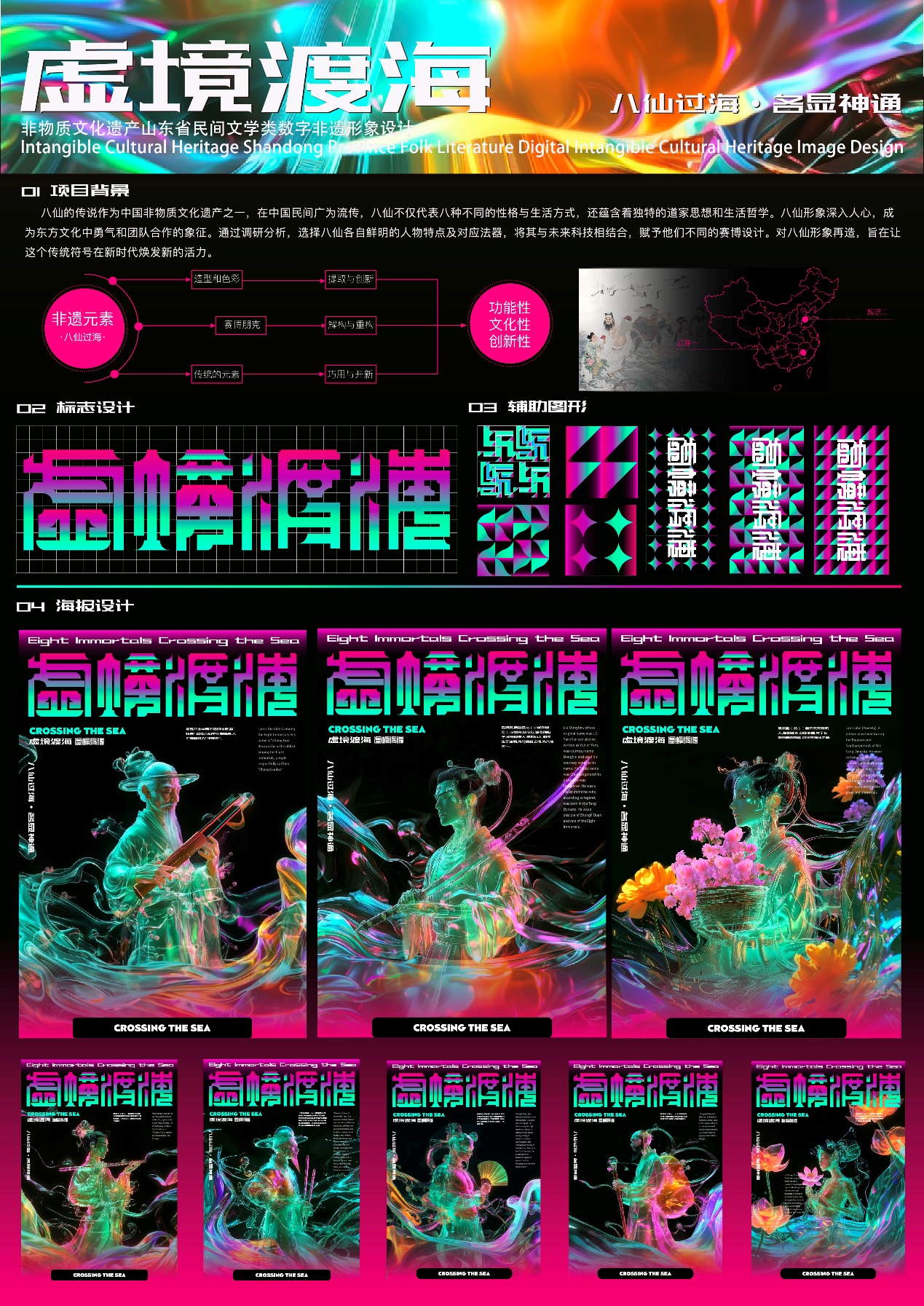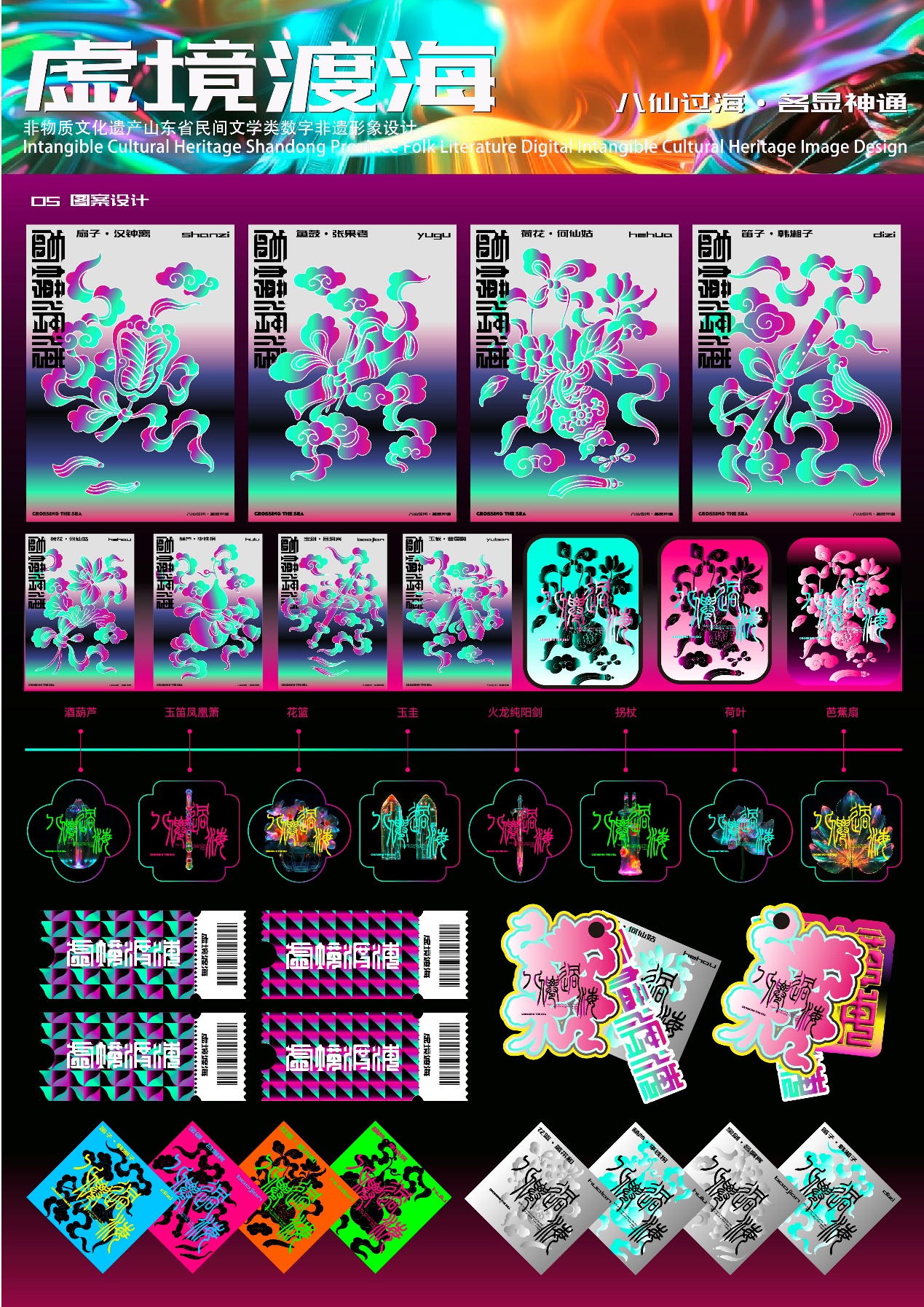 设计说明:八仙的传说作为中国非物质文化遗产之一,在中国民间广为流传,八仙不仅代表八种不同的性格与生活方式,还蕴含着独特的道家思想和生活哲学。八仙形象深入人心,成为东方文化中勇气和团队合作的象征。通过调研分析,选择八仙各自鲜明的人物特点及对应法器,将其与未来科技相结合,赋予他们不同的赛博设计。对八仙形象再造,旨在让这个传统符号在新时代焕发新的活力。