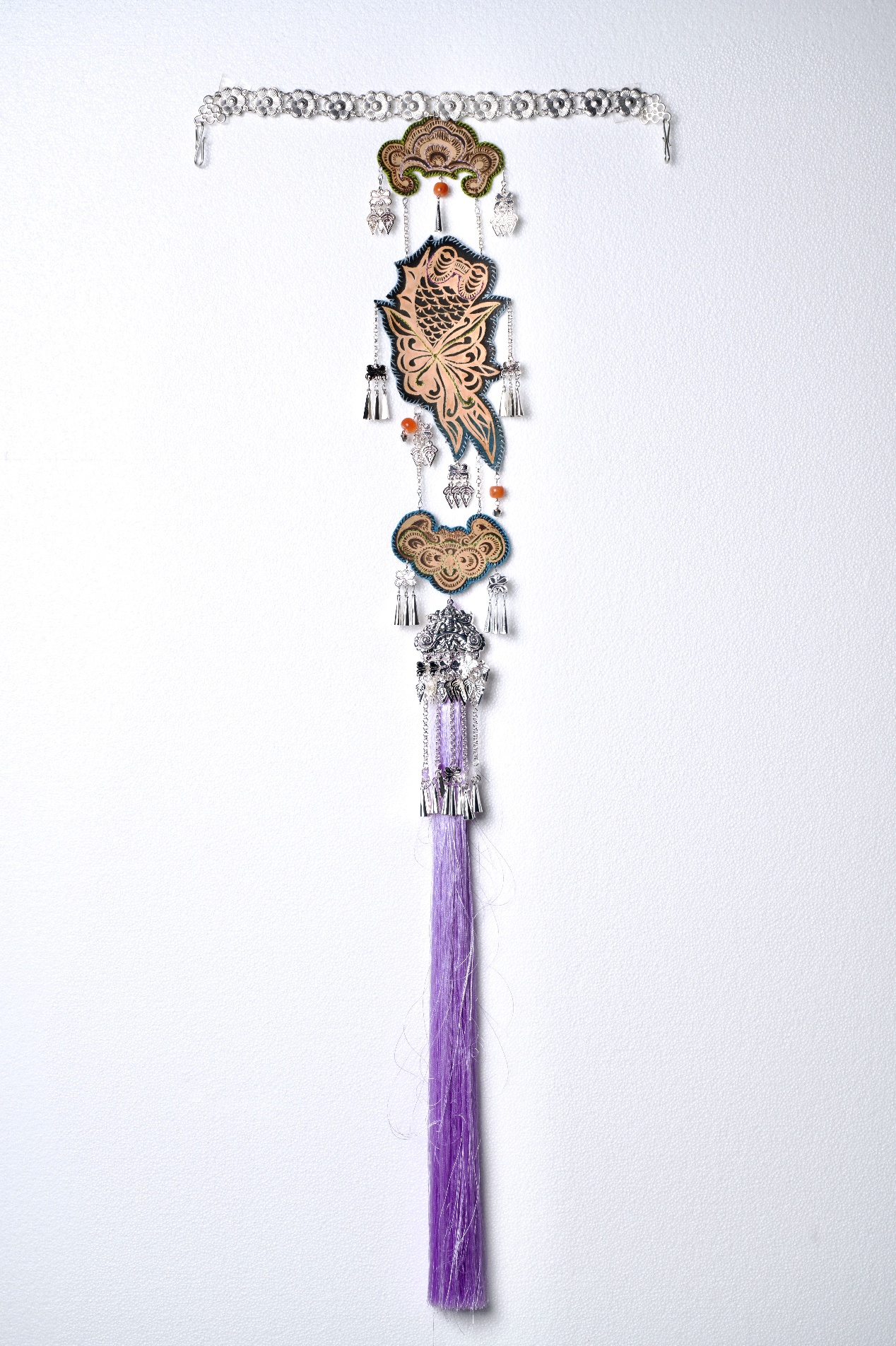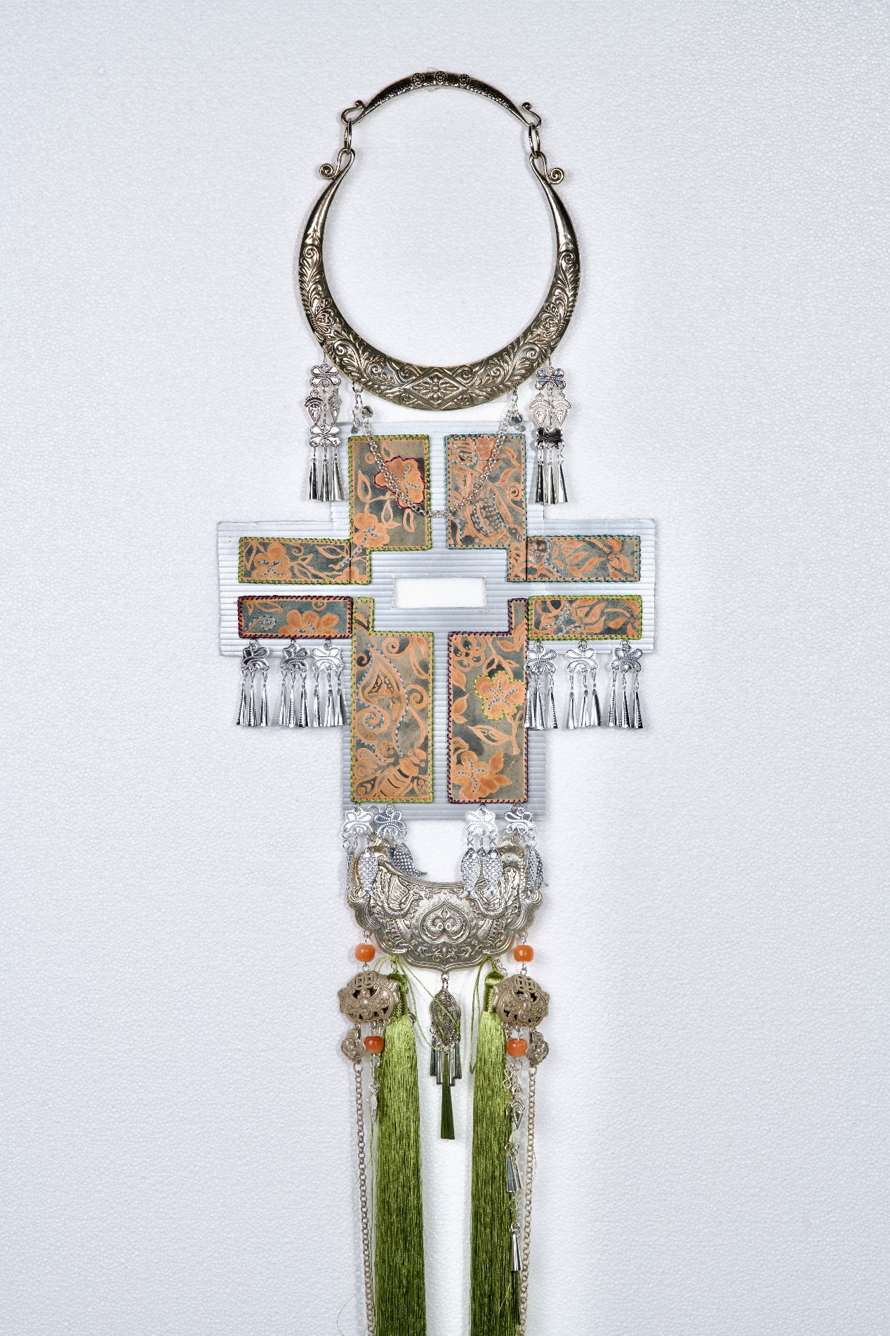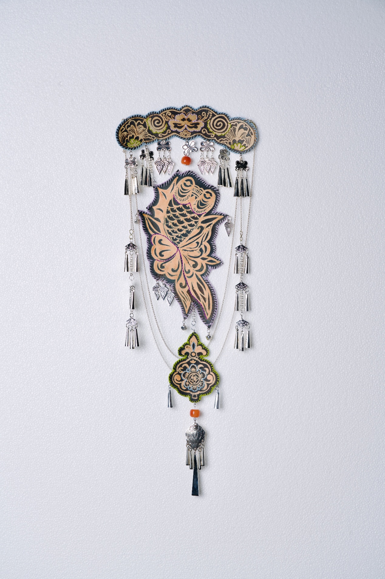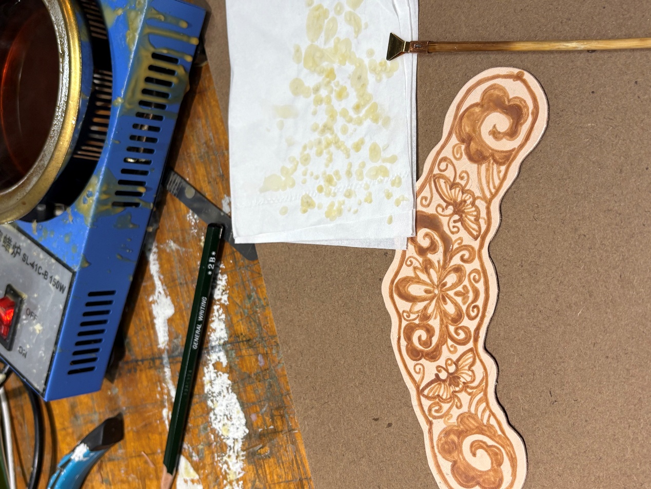 设计说明:旨在探索皮革與女性力量之間的深层聯繫,借助苗族蠟染、刺繡、剪紙等非遺技藝,探索材料創新與发扬傳統文化新的碰撞。苗族蠟染工藝承載著苗族女性的智慧與創造力,代代相傳。苗族女性通過手工繪製蠟紋、 浸染布料,將對生活的熱愛、對自然的敬畏以及家族的故事融入其中。精湛的技藝是苗族 女性堅韌、細膩、富有耐心的體現,象徵著女性在傳統文化傳承中不可替代的力量。
