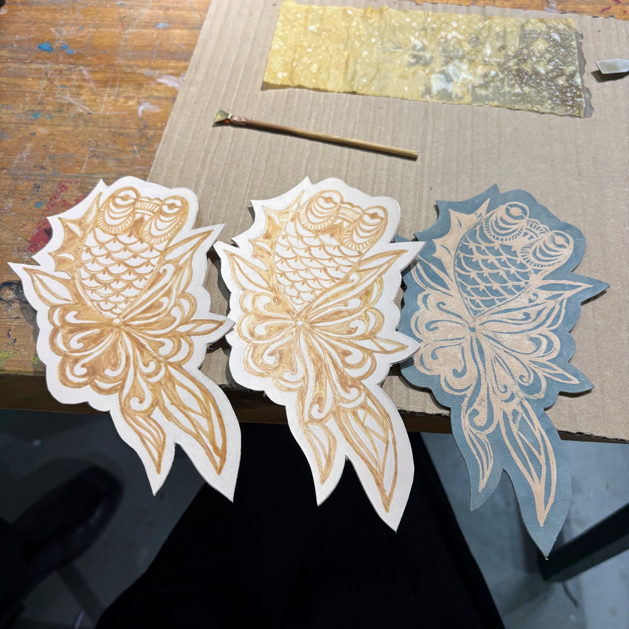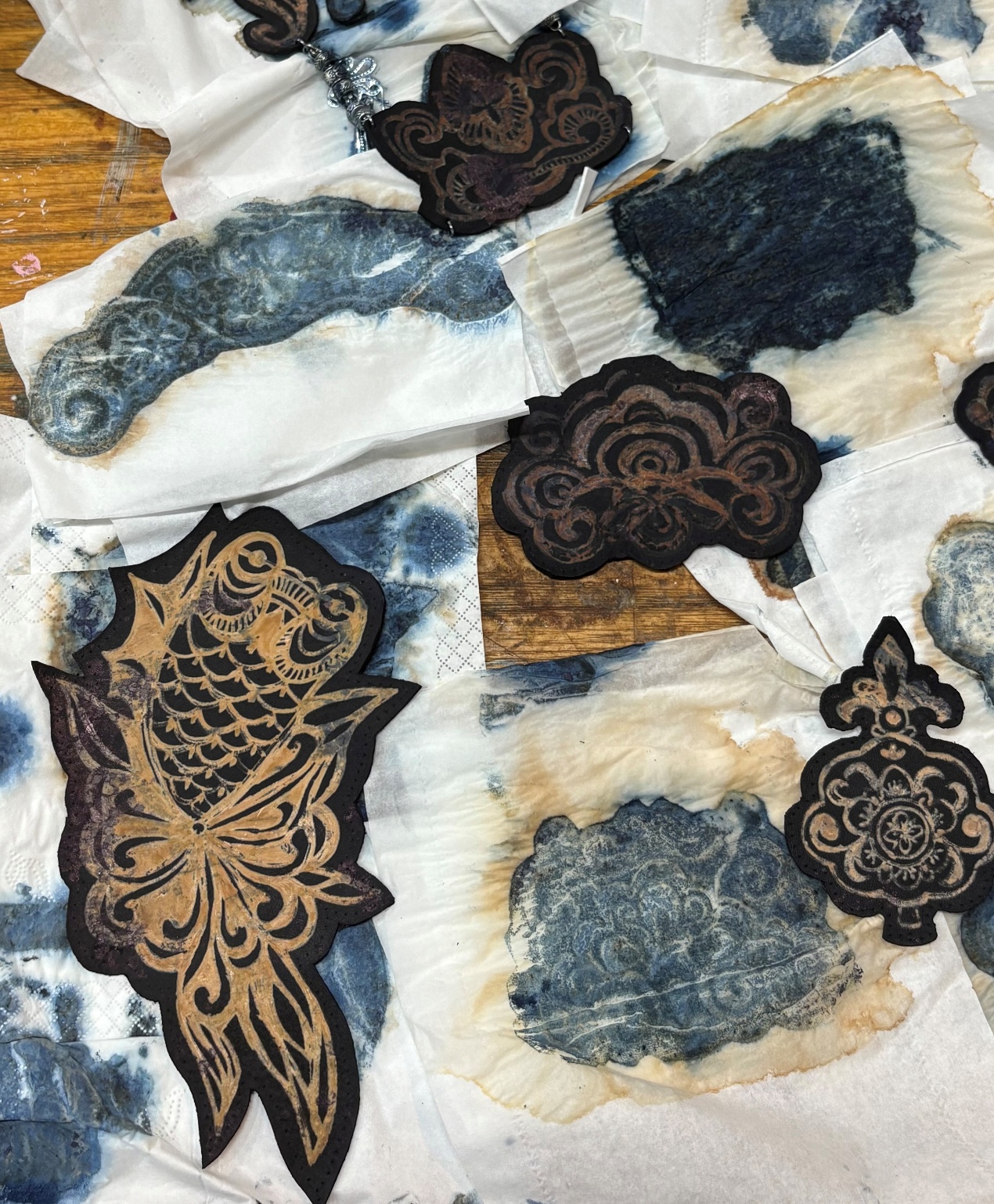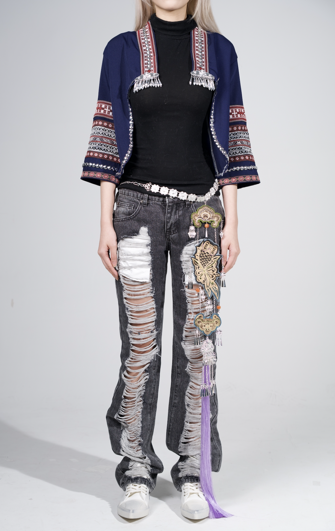 设计说明:旨在探索皮革與女性力量之間的深层聯繫,借助苗族蠟染、刺繡、剪紙等非遺技藝,探索材料創新與发扬傳統文化新的碰撞。苗族蠟染工藝承載著苗族女性的智慧與創造力,代代相傳。苗族女性通過手工繪製蠟紋、 浸染布料,將對生活的熱愛、對自然的敬畏以及家族的故事融入其中。精湛的技藝是苗族 女性堅韌、細膩、富有耐心的體現,象徵著女性在傳統文化傳承中不可替代的力量。