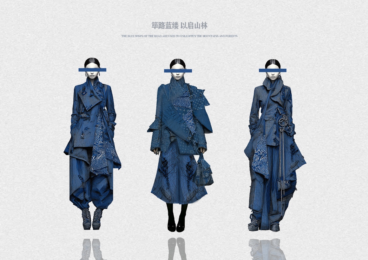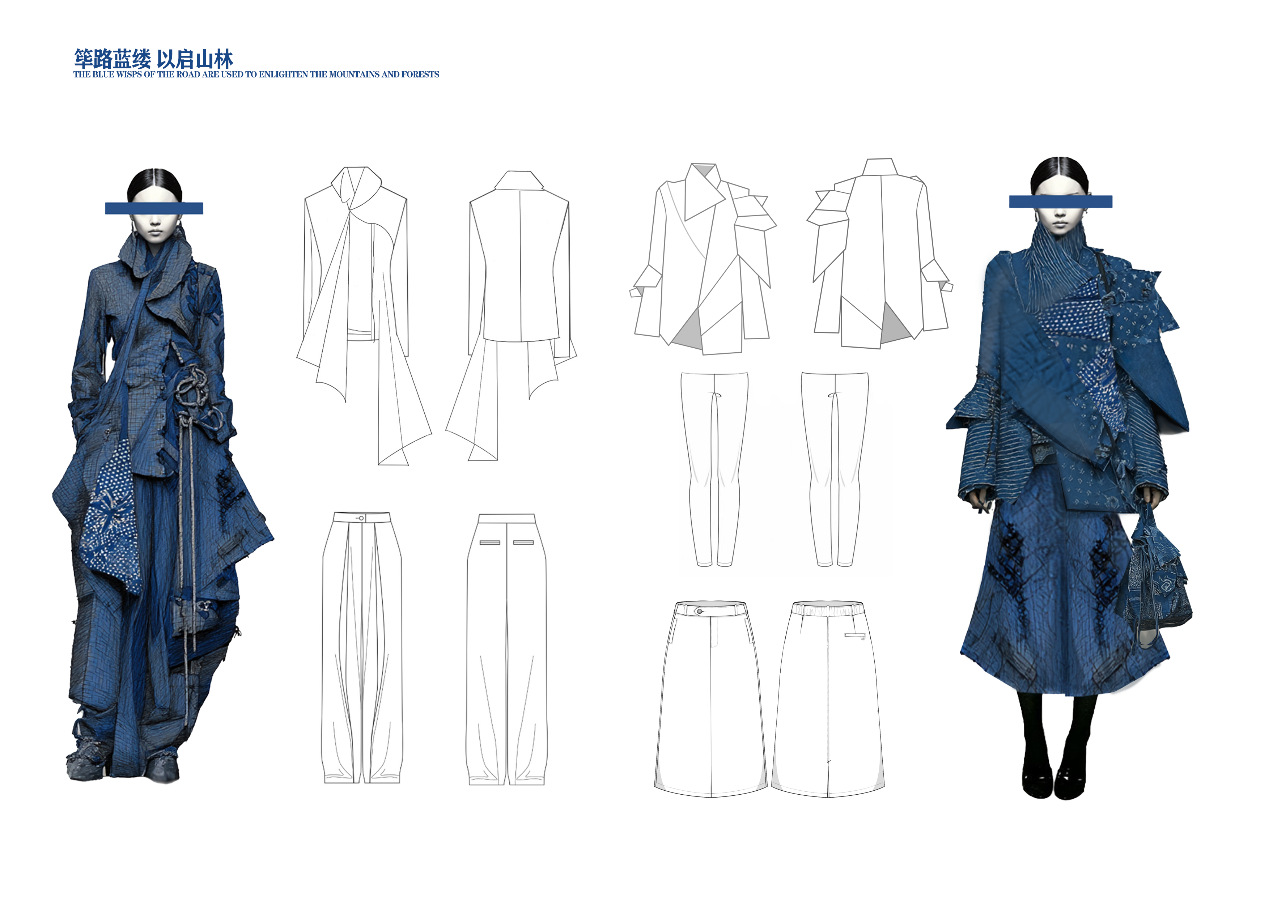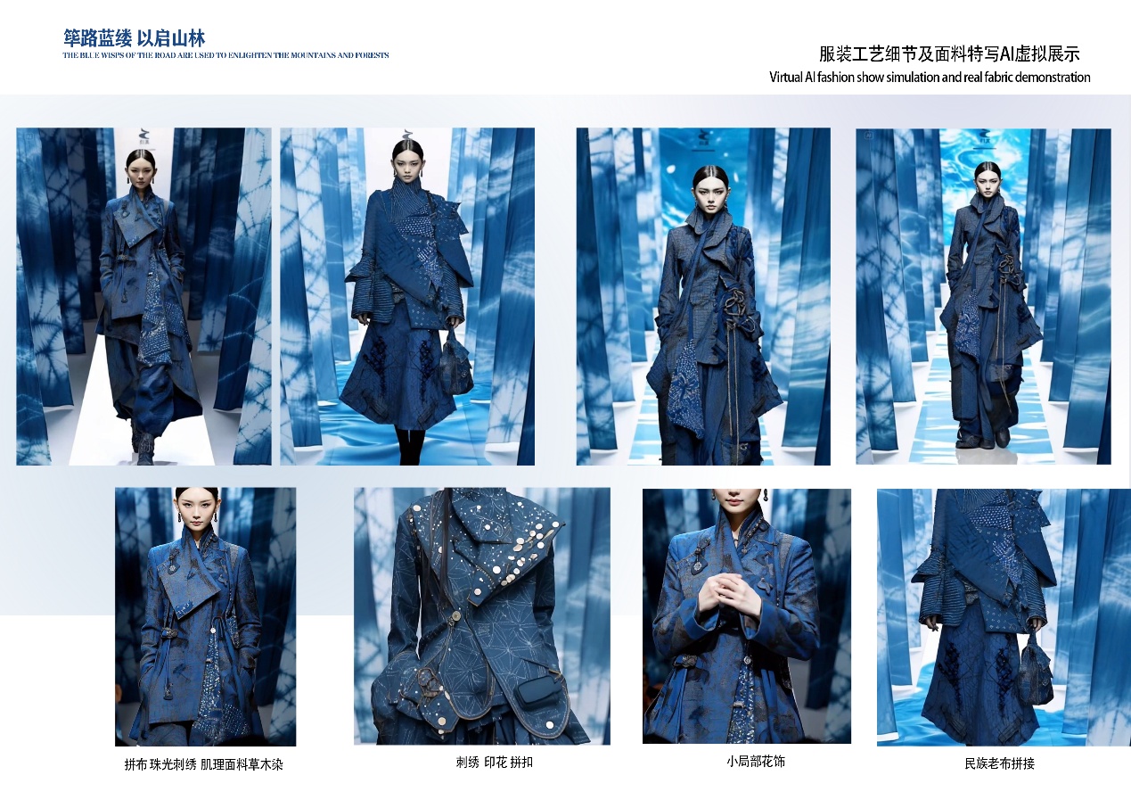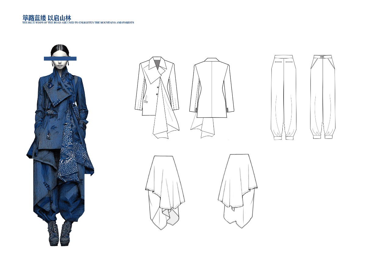 设计说明:本系列作品以“筚路蓝缕 以启山林”的开拓精神为内核,运用蓝染拼布这一承载时光与坚韧的古老工艺,打造兼具原始力量感与现代层次美学的女装。深浅蓝白的碰撞,如层峦鲁嶂与穿透林间的天光。每一块拼布、每一道缝线都是“以启山林”的具象化表达,讲述资源再利用与生生不息的故事。鲁穿结构本身象征着开拓的层层递进,厚重外套是披荆斩棘的盔甲,内搭裤裙则预示着希望与新生的可能。同时结合Ai虚拟视频,进一步展示此系列。