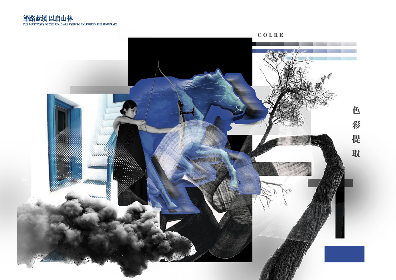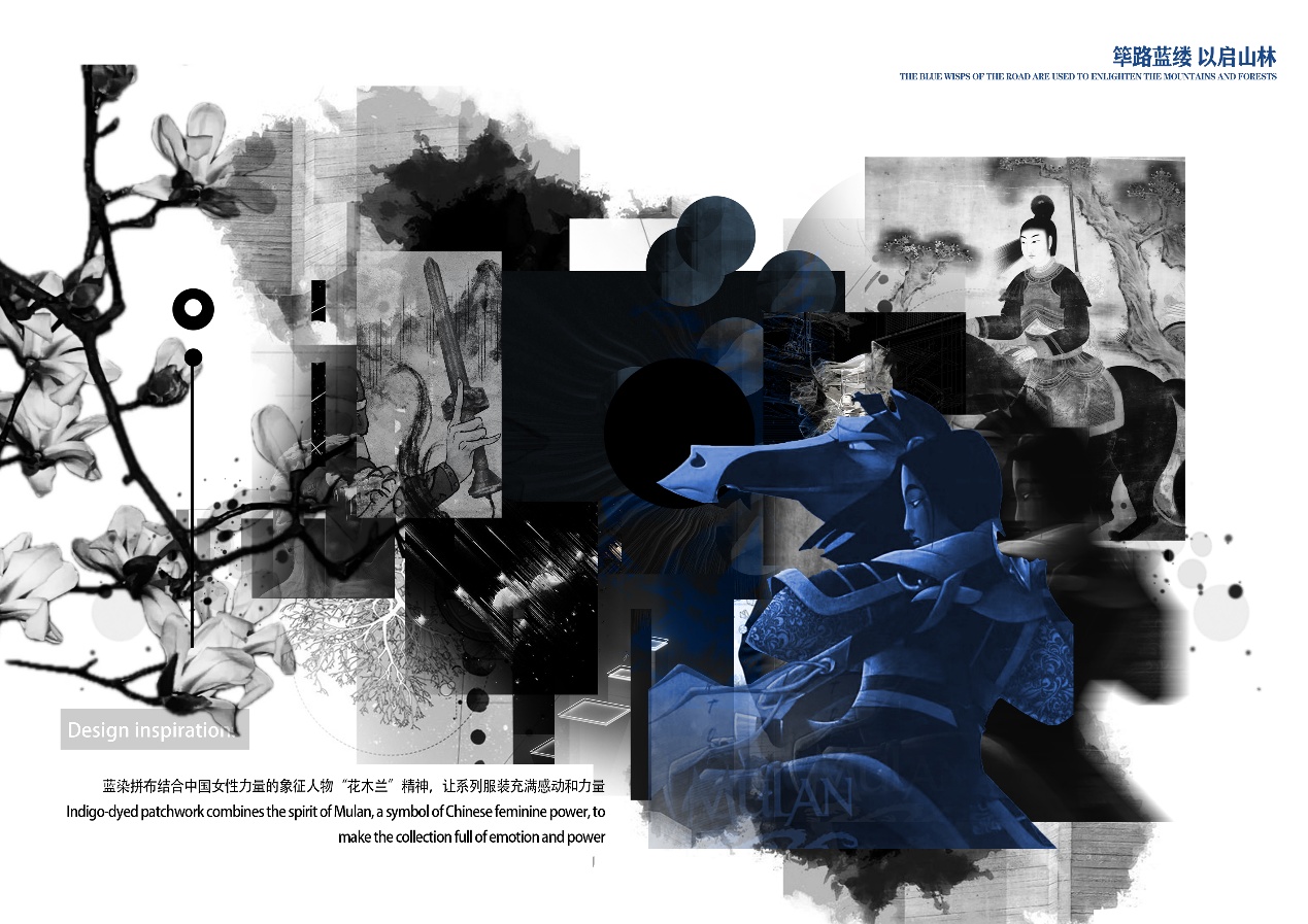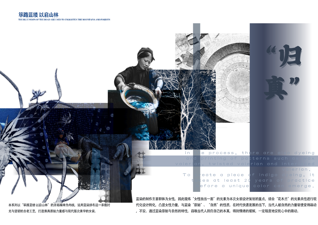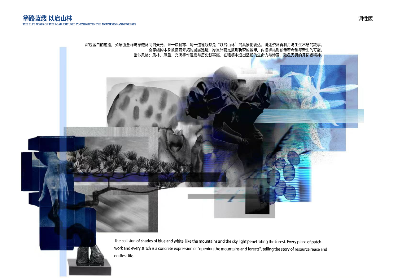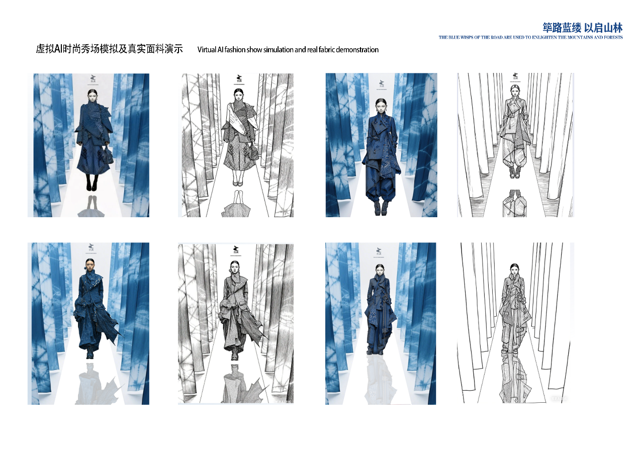 设计说明:本系列作品以“筚路蓝缕 以启山林”的开拓精神为内核,运用蓝染拼布这一承载时光与坚韧的古老工艺,打造兼具原始力量感与现代层次美学的女装。深浅蓝白的碰撞,如层峦鲁嶂与穿透林间的天光。每一块拼布、每一道缝线都是“以启山林”的具象化表达,讲述资源再利用与生生不息的故事。鲁穿结构本身象征着开拓的层层递进,厚重外套是披荆斩棘的盔甲,内搭裤裙则预示着希望与新生的可能。同时结合Ai虚拟视频,进一步展示此系列。