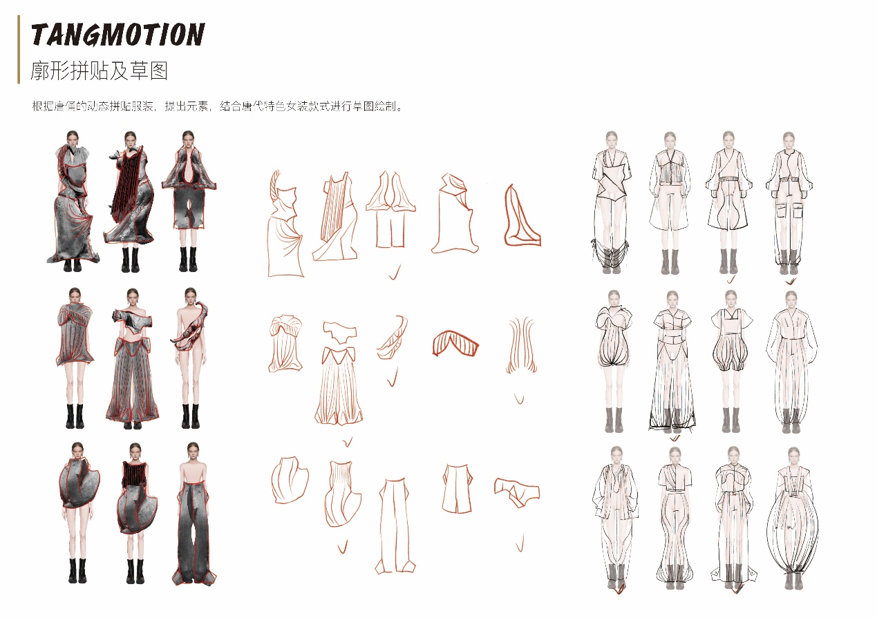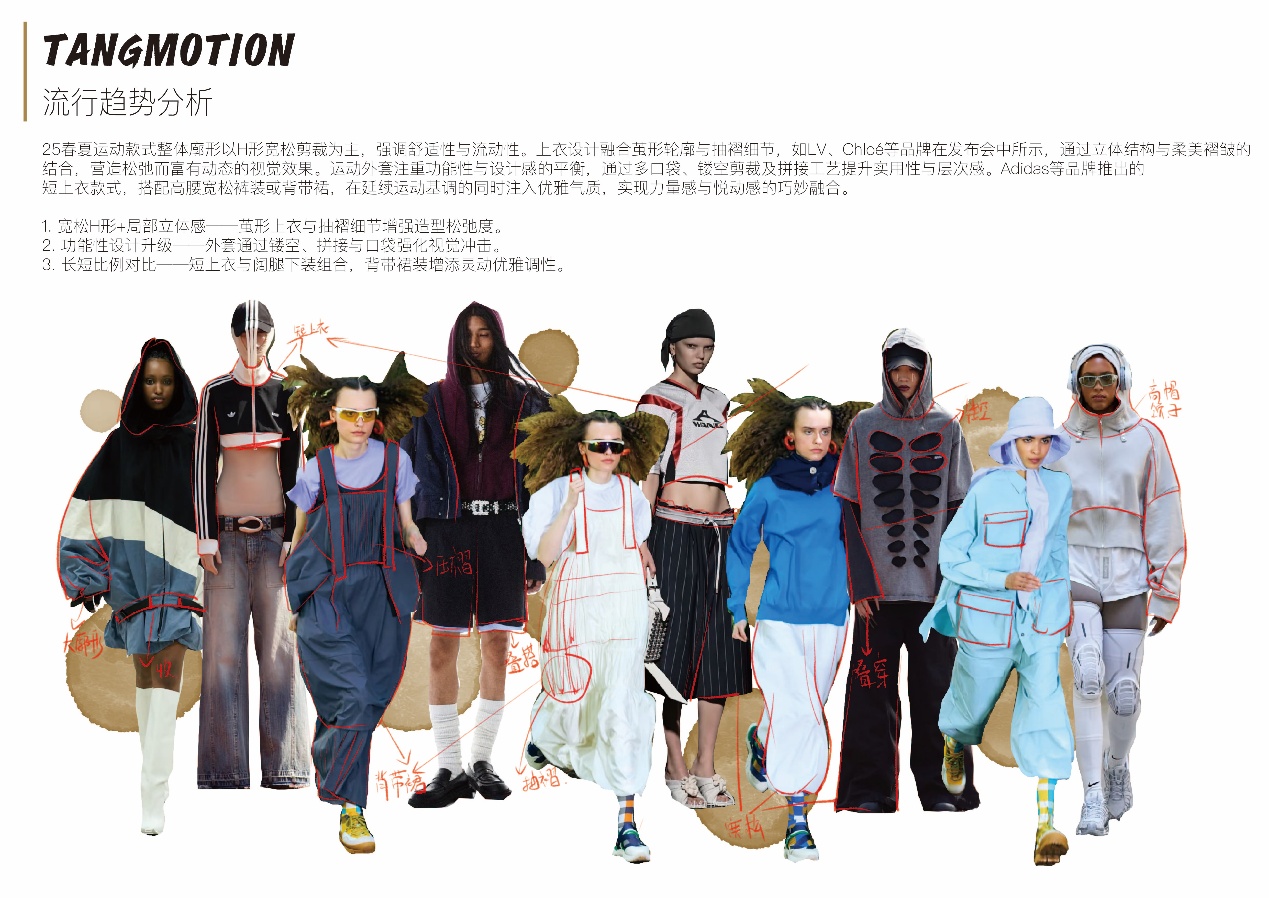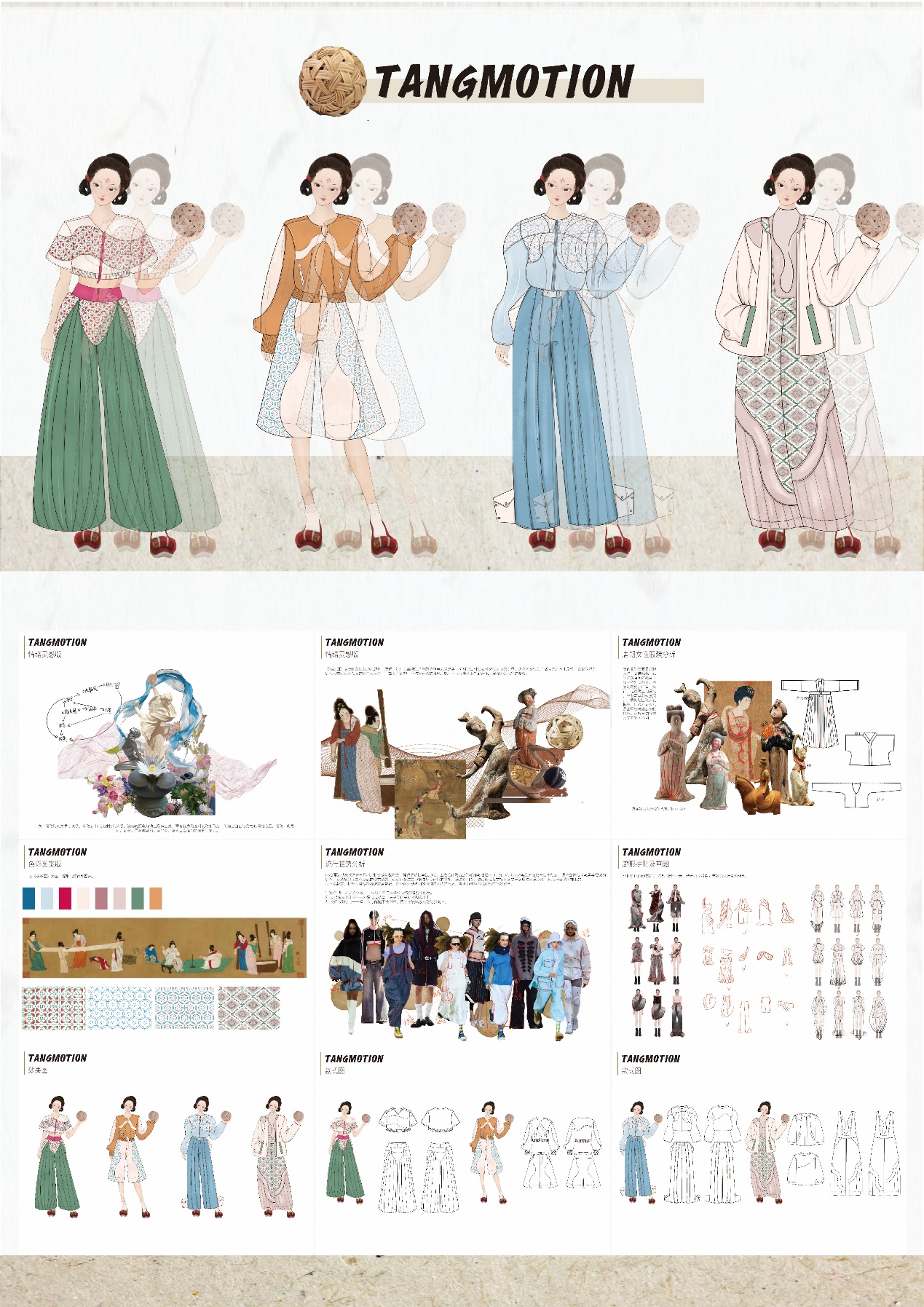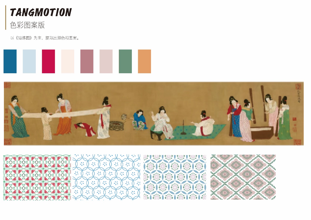 设计说明:《捣练图》以唐代女性劳动为题材,展现了她们在丝绸生产中的协作与力量之美,折射出当时社会对女性劳动的尊重。这种对女性生产活动的艺术化呈现,让我联想到唐代女性在运动领域的自由与活力一一如女子蹴鞠、马球等运动的风靡,她们可以在赛场上挥洒汗水,展现自信张扬的姿态。