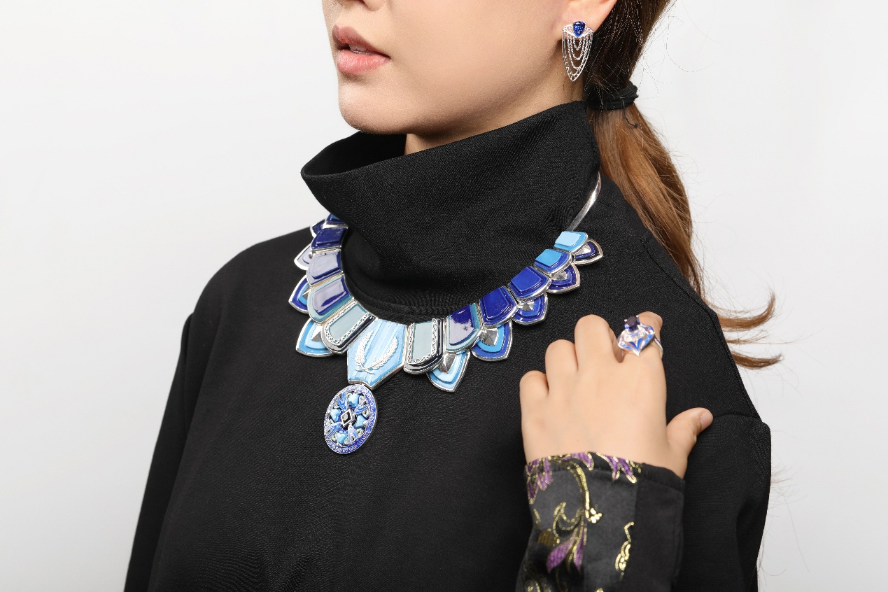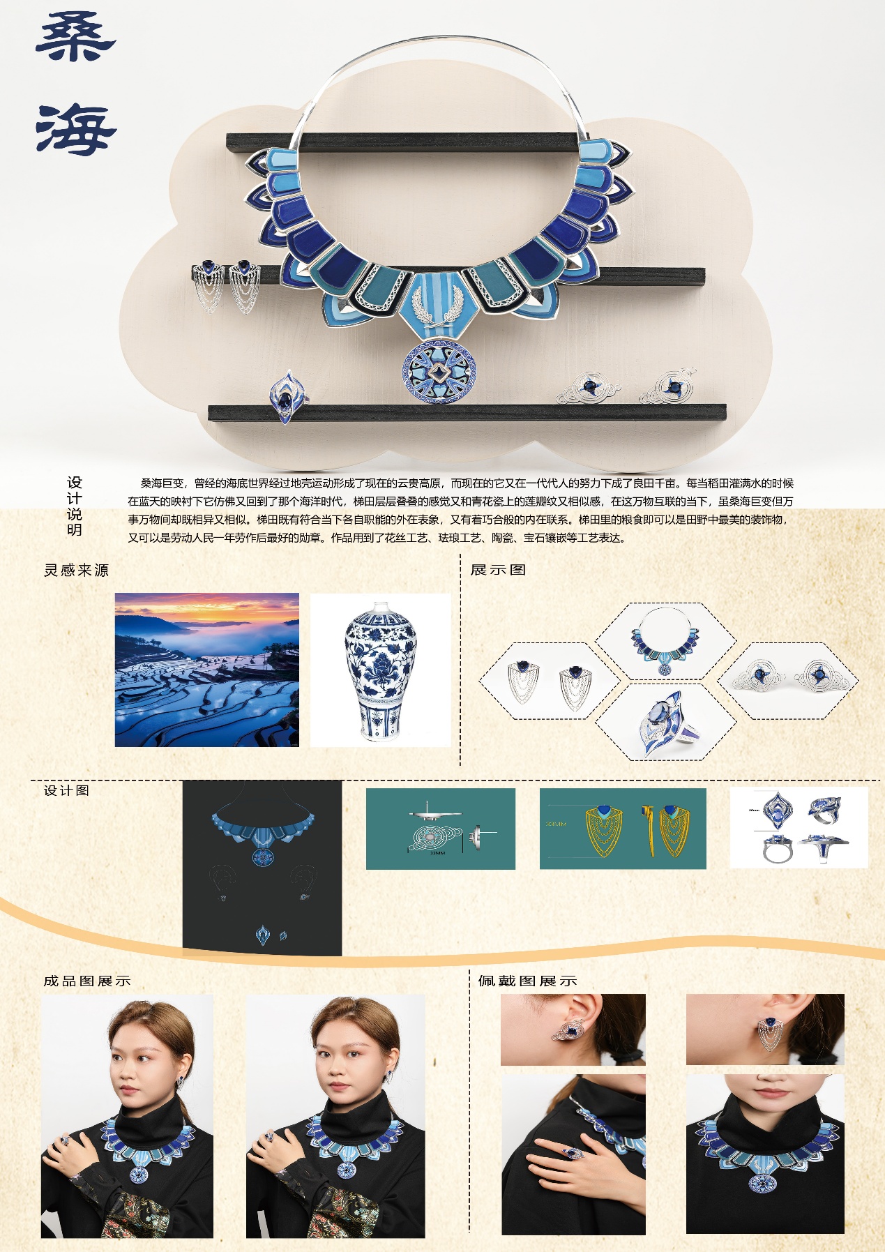 设计说明:桑海巨变,曾经的海底世界经过地壳运动形成了现在的云贵高原,而现在的它又在一代代人的努力下成了良田千亩。每当稻田灌满水的时候在蓝天的映衬下它仿佛又回到了那个海洋时代,梯田层层叠叠的感觉又和青花瓷上的莲瓣纹又相似感,在这万物互联的当下,虽桑海巨变但万事万物间却既相异又相似。梯田既有符合当下各自职能的外在表象,又有着巧合般的内在联系。梯田里的粮食即可以是田野中最美的装饰物,又可以是劳动人民一年劳作后最好的勋章。