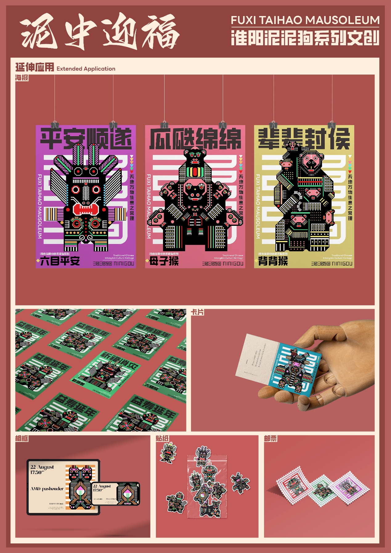 设计说明:作品设计灵感来源于河南淮阳伏羲太昊陵庙会非遗泥玩具“泥泥狗”。在主形象基础上运用点线面手法描绘纹样,并进行几何、扁平、抽象化的创作,具有规律性和程式化的特点,在色彩运用上体现了中国传统的“五色、五行”理念,同时结合每个形象角色的寓意,旨在增进时代美感,为泥泥狗文化内涵拓展注入新的活力。