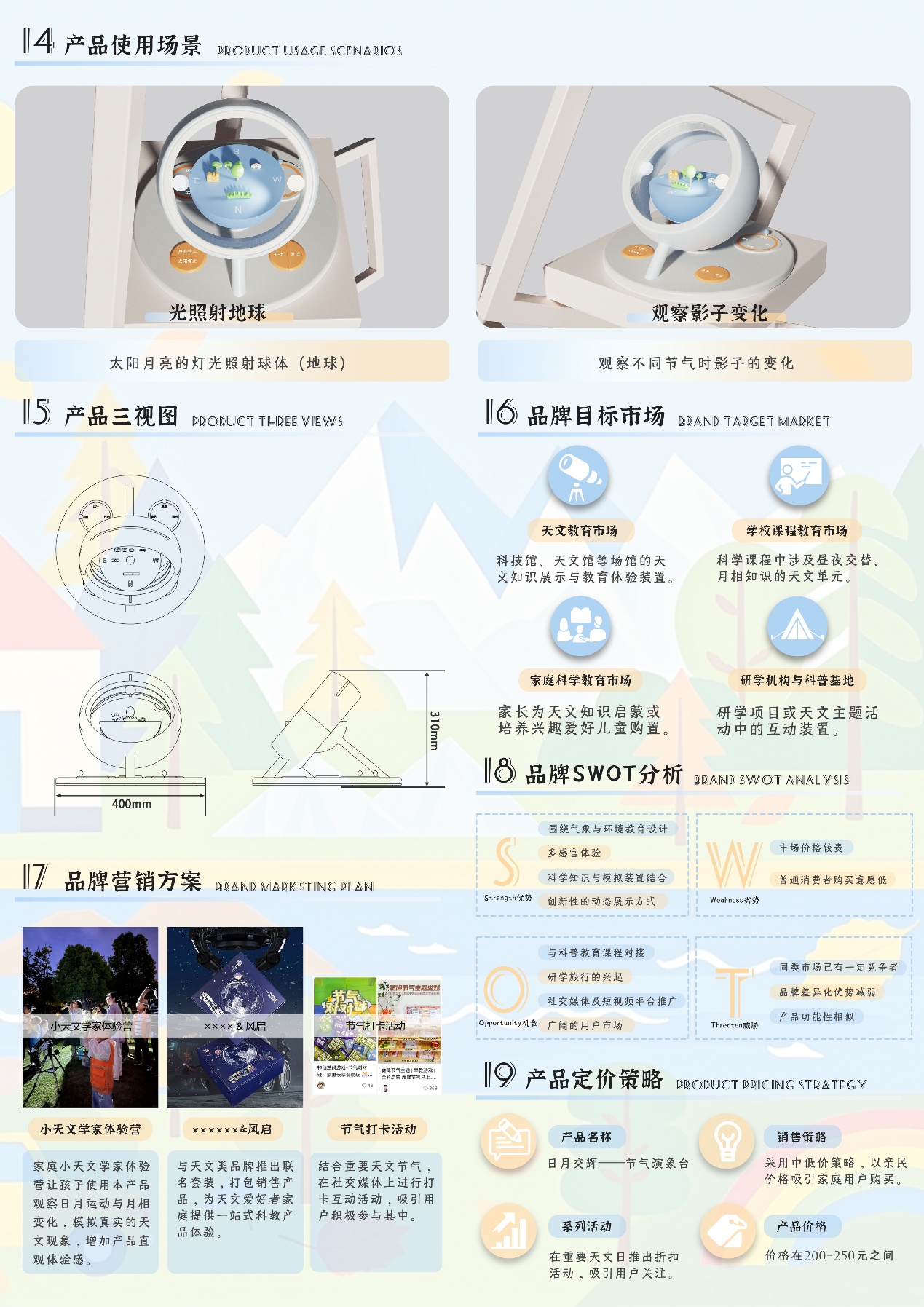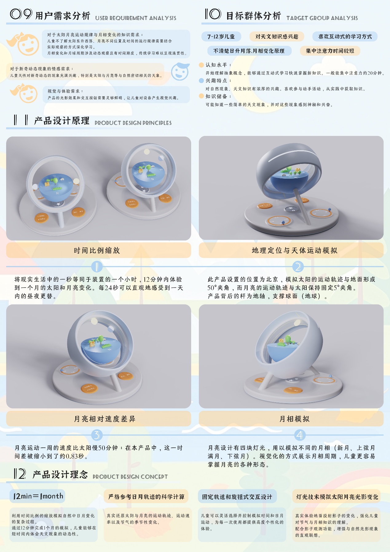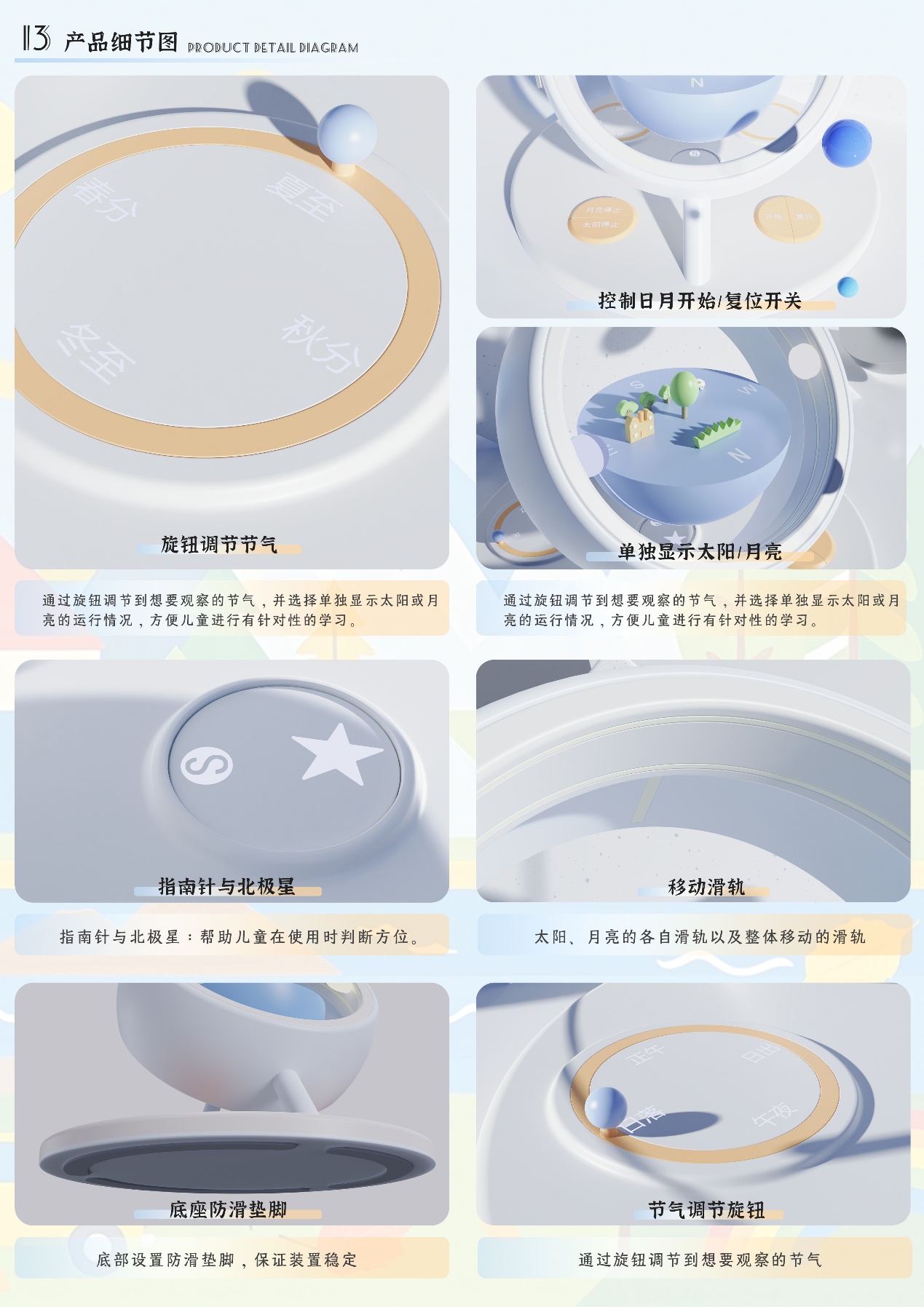 设计说明:本设计旨在通过视觉化和互动的方式展示太阳和月亮在一年中不同节气的变化规律。此产品将现实时间进行加速模拟,让使用者可以在12分钟内体验到一个月内的日月变化,并每24秒直观感受到昼夜更替使复杂的天文现象变得易于理解。本设计使用灯光来精确模拟真实的光照效果,允许放置地面上的模型以观察各个节气下影子长度的变化,从而帮助理解太阳位置对地球的影响。用户可以通过旋钮选择想要观察的时间段以及单独显示太阳或月亮的运行情况,方便有针对性地学习二十四节气相关的天文知识。