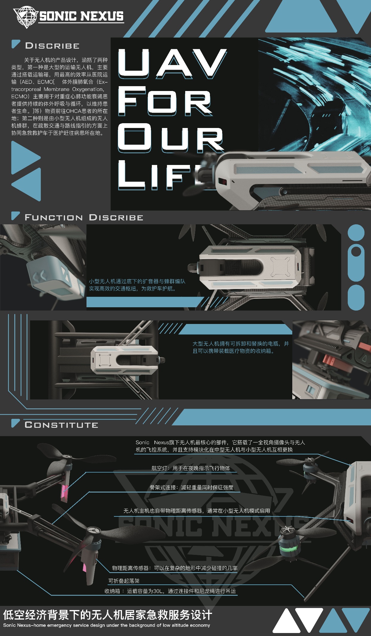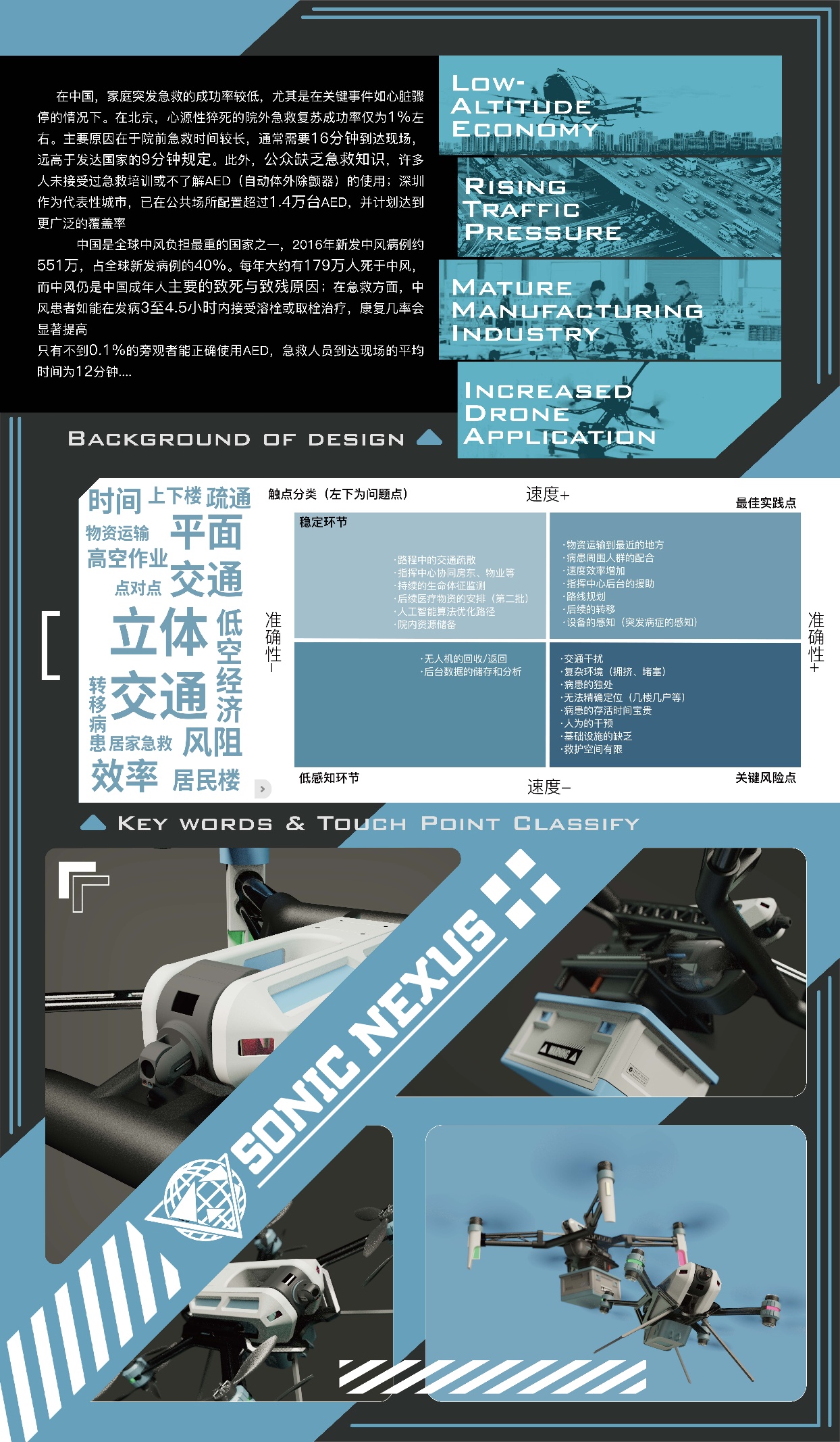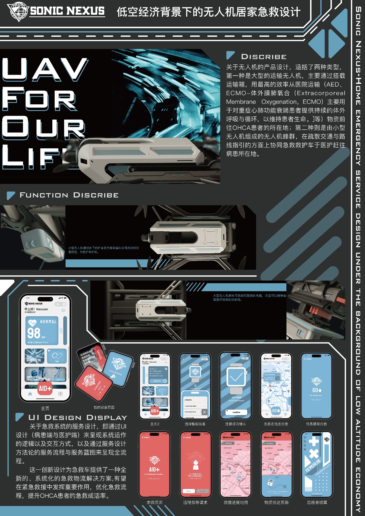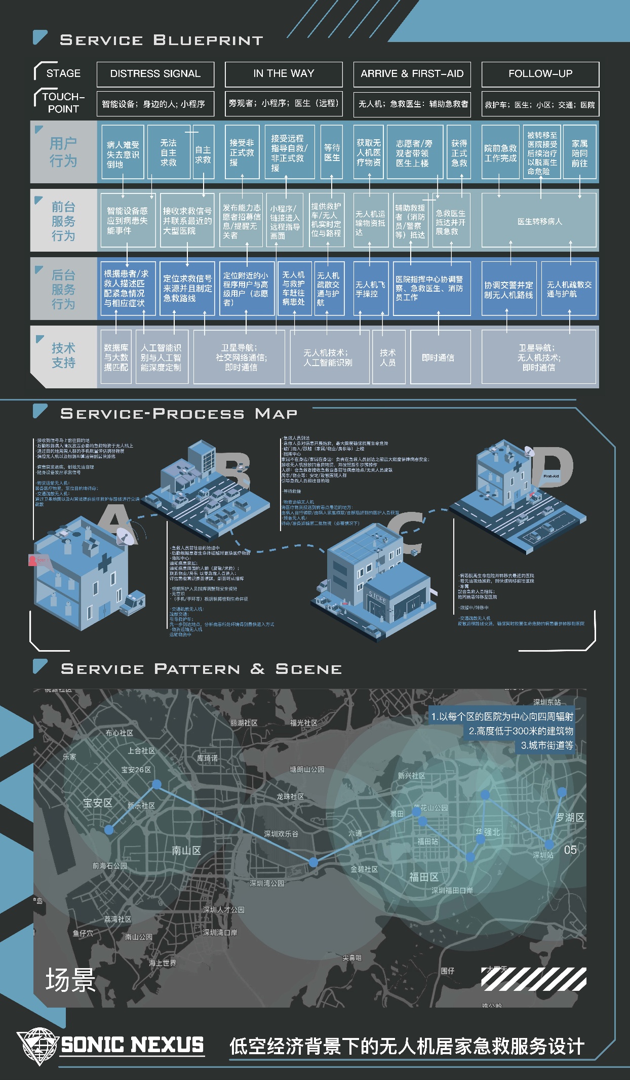 设计说明:第一个是急救无人机的产品设计,主要有两种机体:第一个是中型医疗物资运输无人机、第二个是小型蜂群无人机。第二个部分则是服务系统的设计,前期通过用户旅程图、行动者地图等内容进行深入探讨,再结合服务蓝图和预想的服务流程图进行用户端的设计。 用户端主要有两种使用场景:一是作为受培训的志愿者参加志愿服务活动,帮助离自己最近的病人;另外一个是可以通过客户端在突发情况进行急救,从而让其他路人、志愿者看到,从而做出帮忙、规避或者引导的行动,提高病人的成活率。