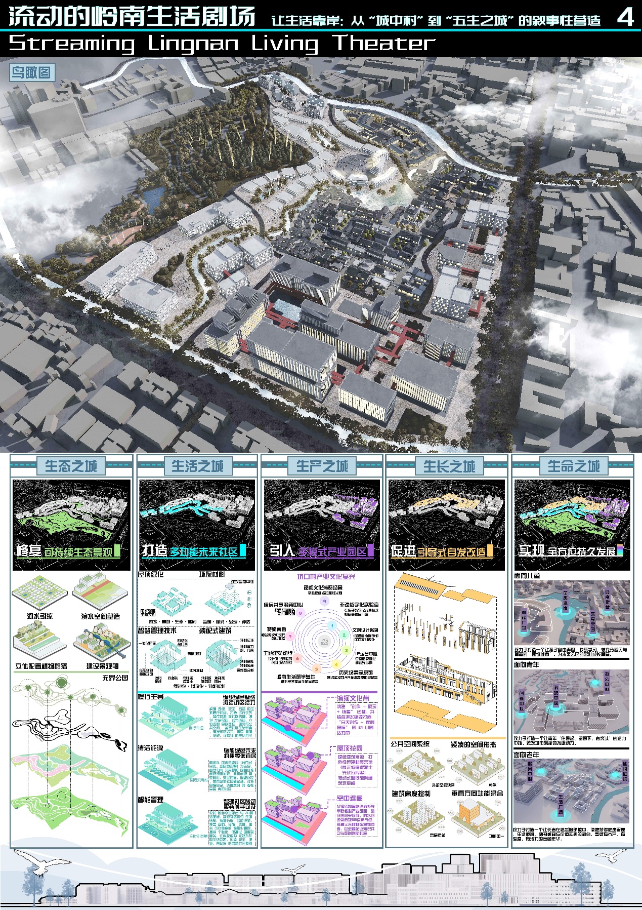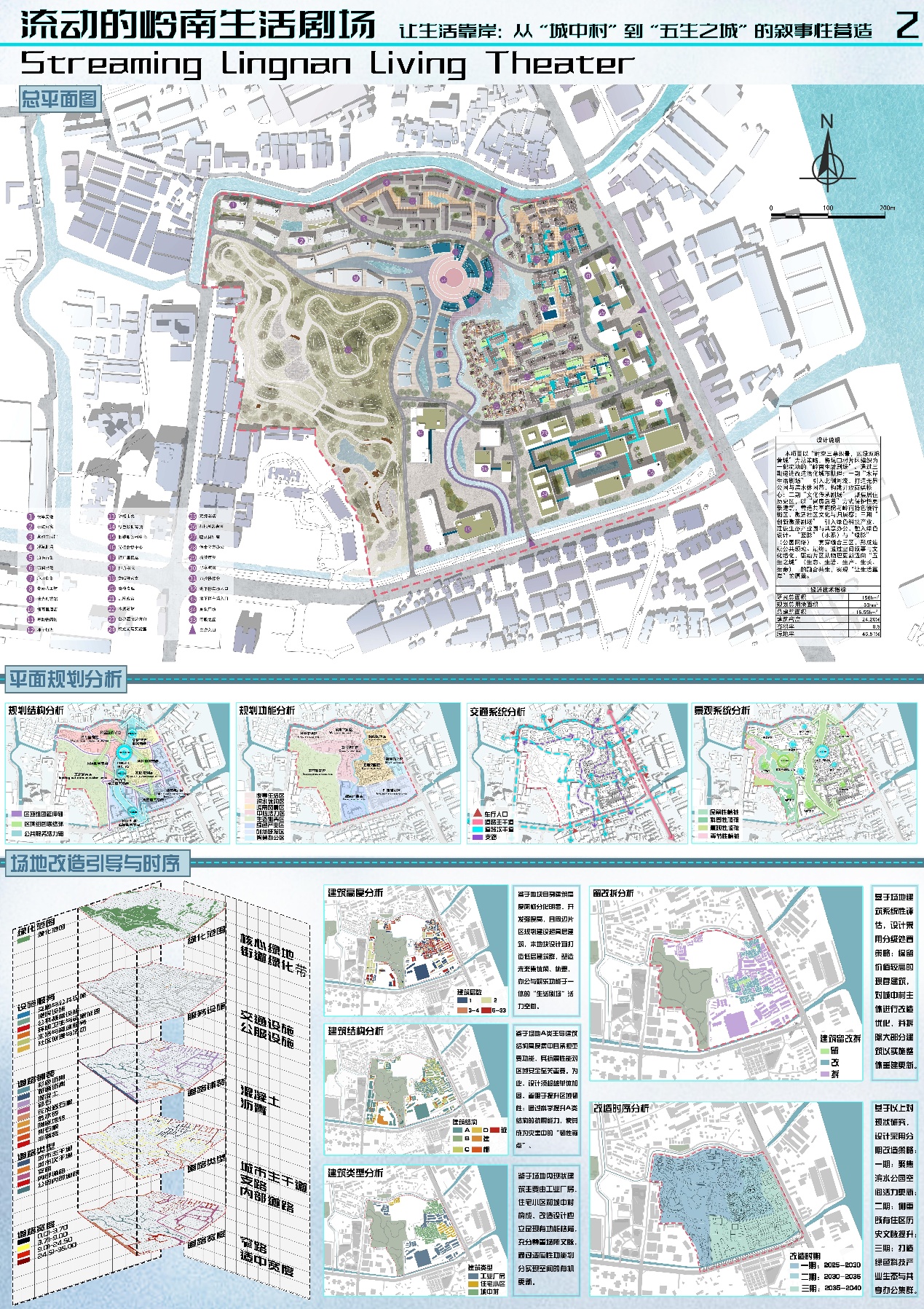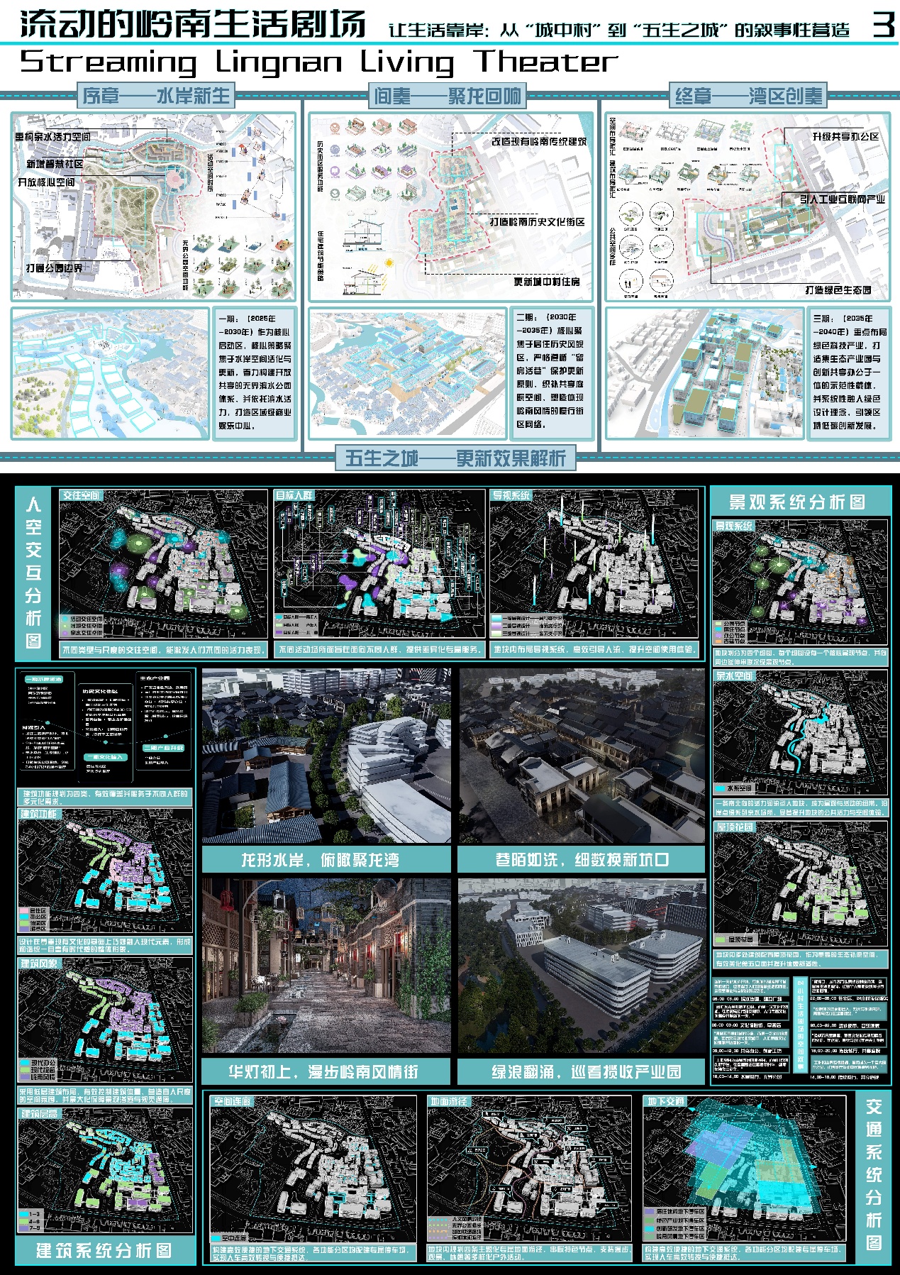 设计说明:本项目以“时空三幕织景,蓝绿双脉营城”为总策略,将坑口村片区编织为一部流动的“岭南生活剧场”。通过三期递进改造活化城市肌理:一期“水岸生活剧场” 引入北侧河流,打造无界公园与滨水休闲带,构建开放商娱核心;二期“文化传承剧场” 聚焦居住历史区,以“留房活巷”方式保护性更新建筑,营造共享庭院与岭南特色慢行街区,激活社区文化与归属感;三期“创新激荡剧场” 引入绿色科技产业,建设生态产业园与共享办公,融入绿色设计。“蓝脉”(水系)与“绿脉”(公园网络) 贯穿缝合三区,形成连续公共领域。最终,通过空间叙事与文化活化,驱动片区从物理更新迈向“五生之城”(生态、生活、生产、生长、生命) 的融合共生。