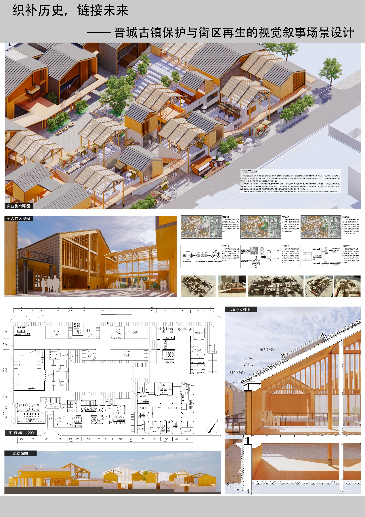 设计说明:本设计以“织补历史,链接未来”为核心策略,通过创新性的视觉叙事手段,重新整合晋城古镇的历史空间结构与当代生活需求。方案以保护传统建筑风貌为基础,运用现代设计语言与数字技术,在街区肌理中植入互动景观、文化展陈与可持续公共空间,形成历史记忆与未来生活的动态融合,视觉元素的叠合转译、场景化的功能激活实现古镇从静态保护到活力再生的跨越,构建一个既能传承文化基因、又能承载未来生活方式的共生街区。