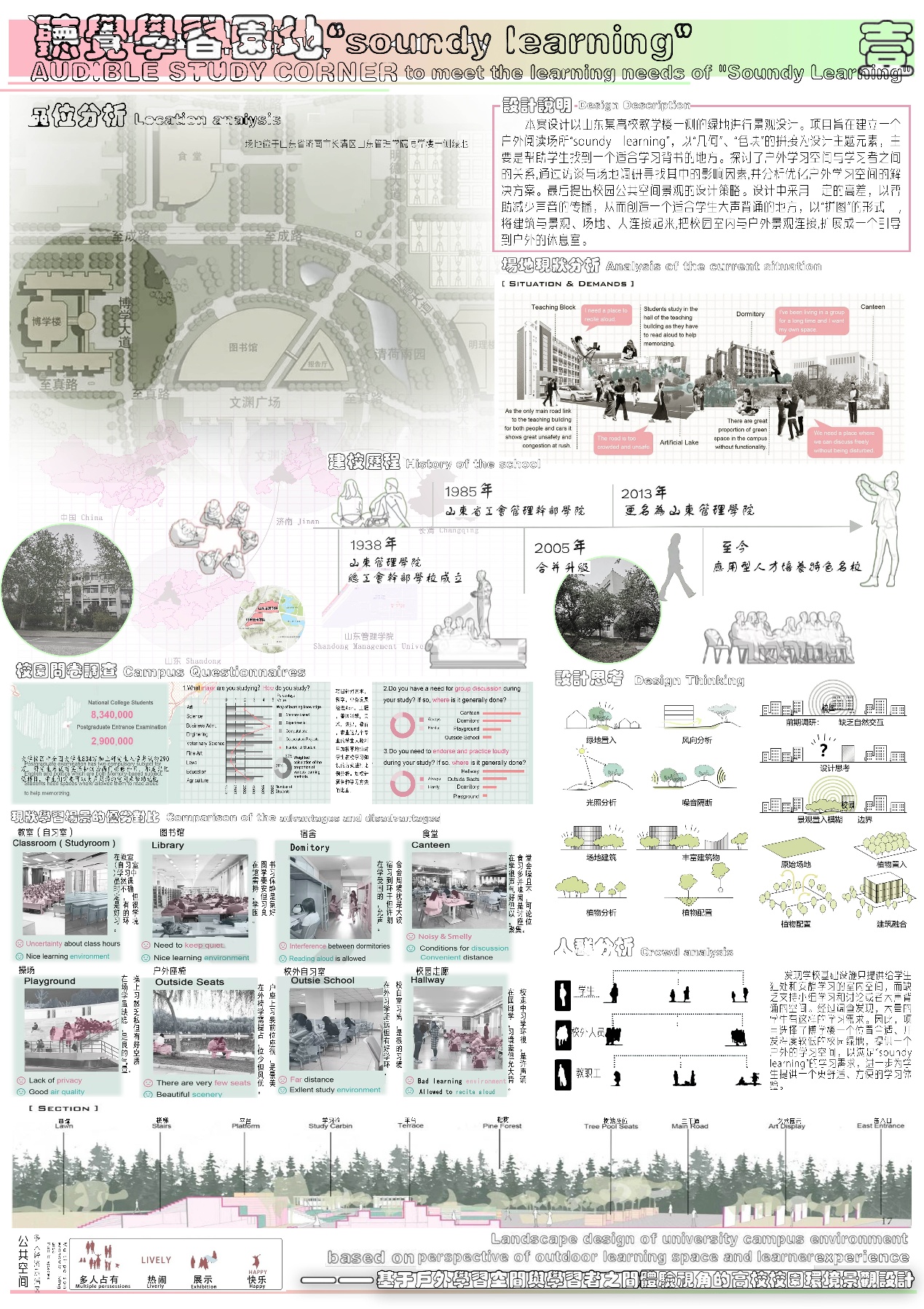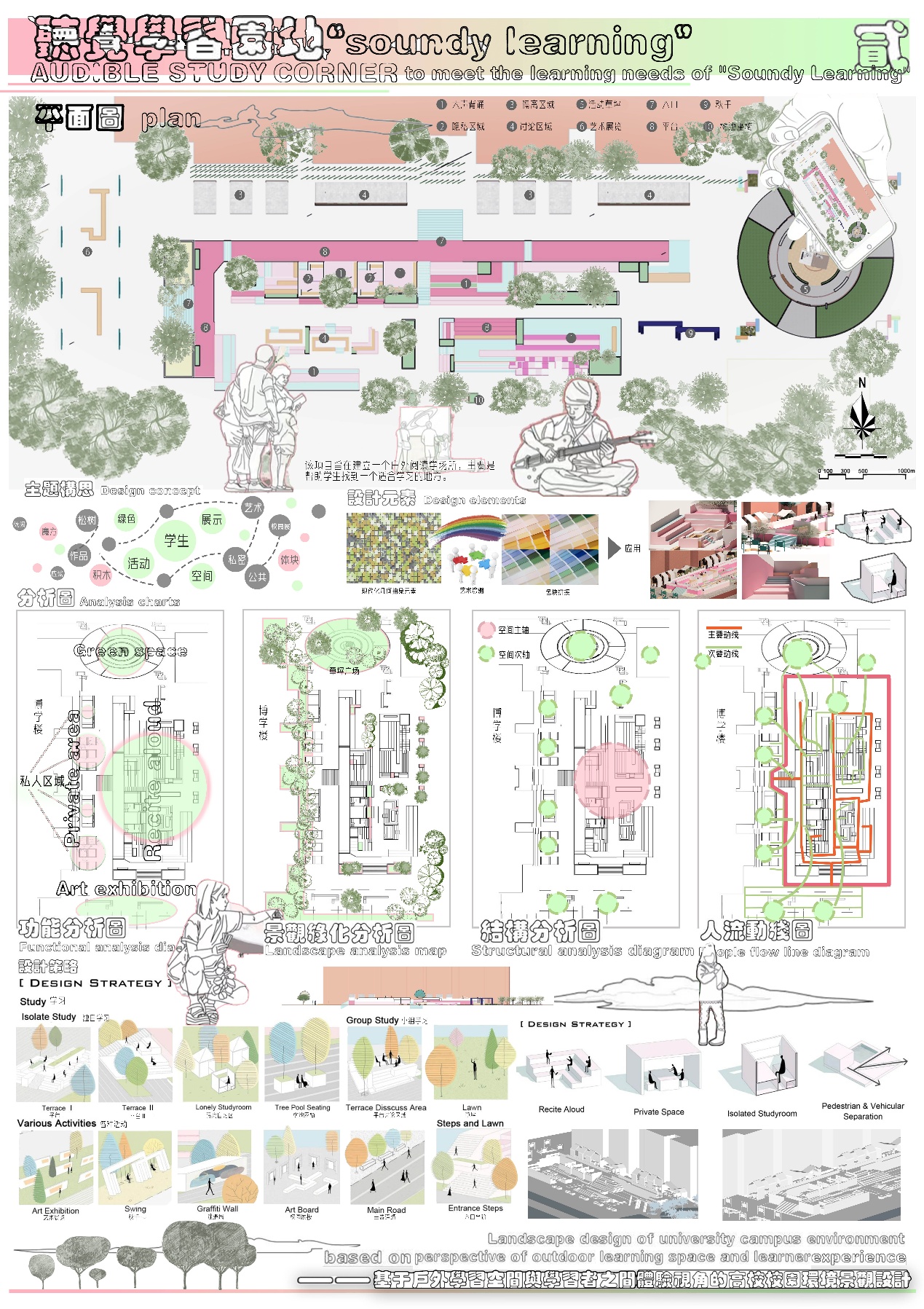 作品名称:听觉学习园地—“soundy learning”——基于户外学习空间与学习者之间体验视角的高校校园景观设计