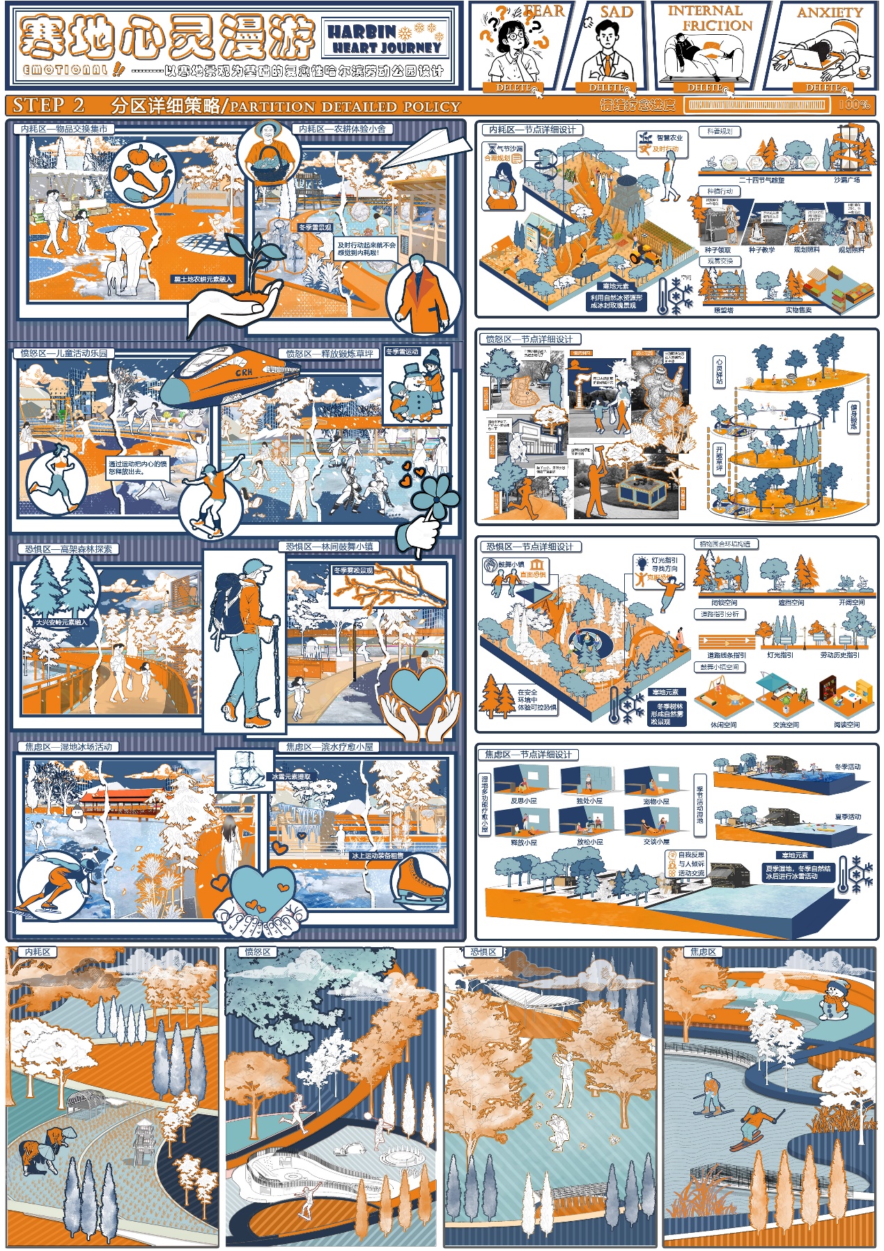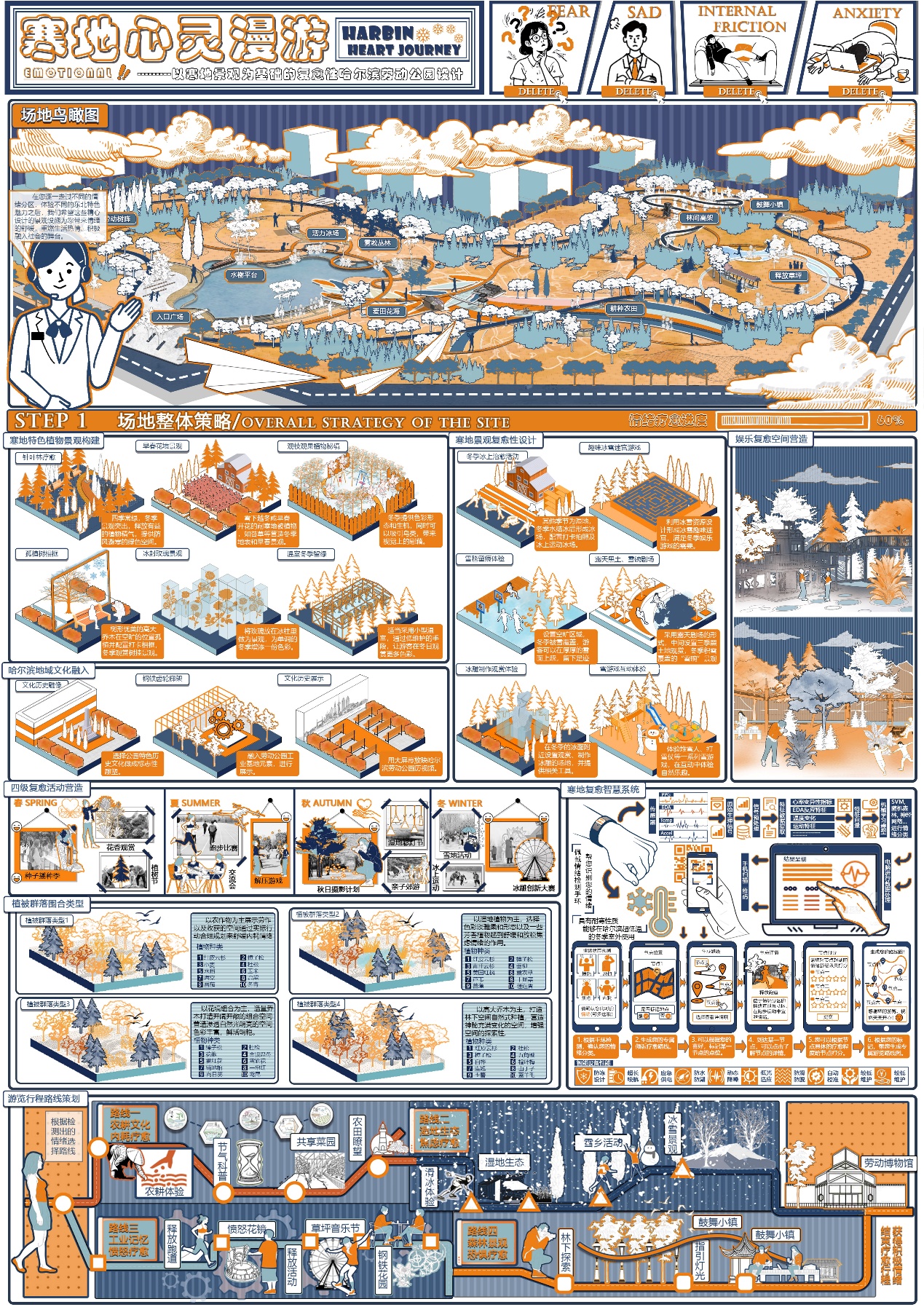 设计说明:欢迎来到哈尔滨劳动公园。当今社会,人们面临着日益增长的压力,需要一个能够提供心灵疗愈的空间。我们以冰雪文化浓厚的寒地城市——哈尔滨为设计背景,选址于极具历史记忆与公共属性的劳动公园,提出以情绪疗愈为主题的寒地公园更新方案。 方案以居民的情绪数据为依据,基于寒地城市环境心理特征,结合在线情绪数据,将情绪划分为内耗、愤怒、恐惧、焦虑四类与东北城市名片(黑土地,工业基地,大兴安岭,冰城)结合,设计具有寒地风貌的景观空间与设施,为游客营造沉浸式、四季有别的疗愈体验。 公园路网依据寒地微气候进行动线优化,设置不同情绪疗愈路线。游客可根据自身情绪状态选择路径,实现情绪释疗愈。