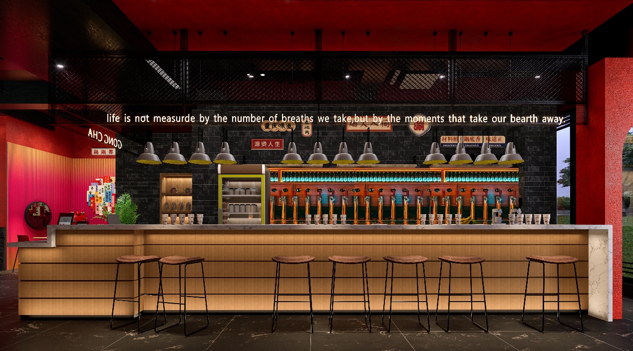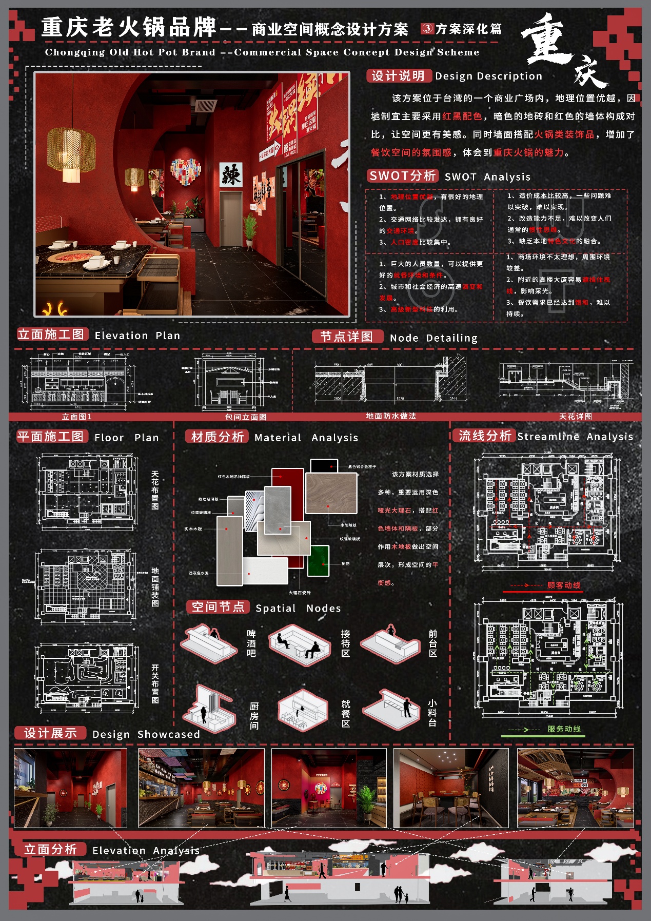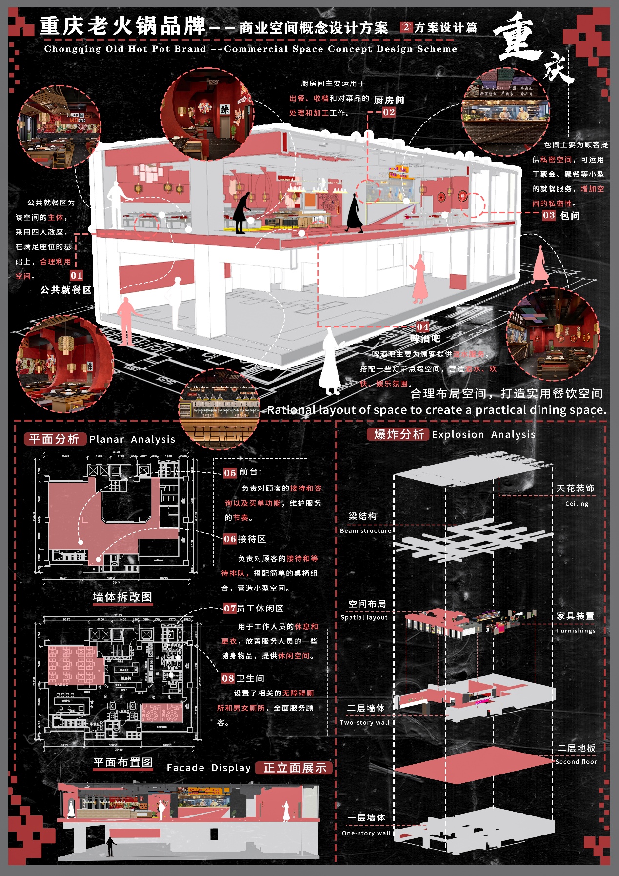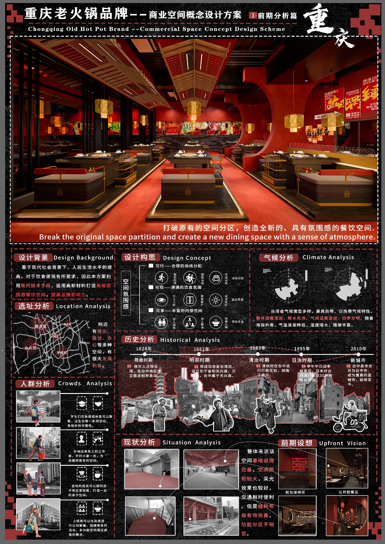 设计说明:该项目位于台湾省台中地区,基于原有的周边环境和场地条件,将商业空间与生活结合起来。运用新型材料和技术手段,打破原有的空间格局,利用红色的墙面装饰烘托空间氛围,与黑色的天花,形成强烈对比,让空间更有层次感,同时运用重庆的装饰风格,展现重庆的文化特色与内涵,展现两岸文化的融合,形成独特的餐饮空间。