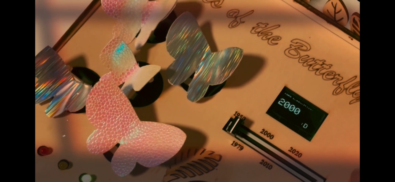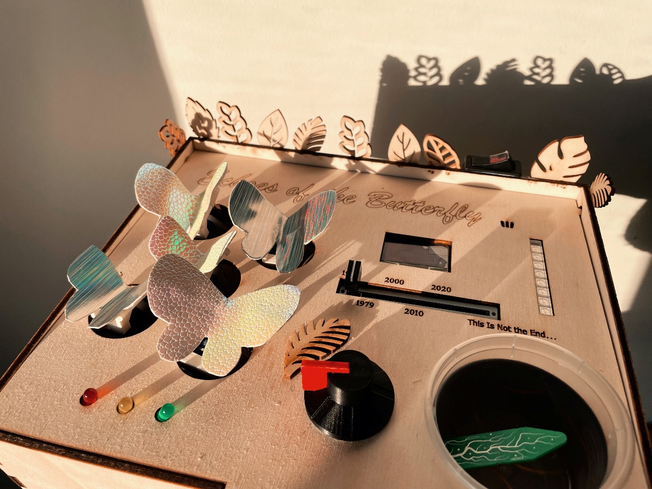 设计说明:《蝴蝶的回声》是一件以生态回忆为核心的交互装置设计,灵感源自大蓝蝶的真实灭绝与重现故事。作品通过多块 Arduino 联动控制,以滑块、电位器与湿度传感器等构建交互输入,驱动伺服电机、灯带、蜂鸣器与 OLED 显示,模拟蝴蝶数量在环境变化中的起伏。 观众的每一次介入,都会影响这个“微型生态系统”的状态,让蝴蝶振翅或沉寂,光亮或暗淡。装置在科技逻辑与自然意象之间建立柔性联系,唤起人们对生态脆弱性的感知与共鸣。 我们相信,蝴蝶的回响,从未只属于蝴蝶。 那是一场来自自然的低语,也是一场对未来的提问。