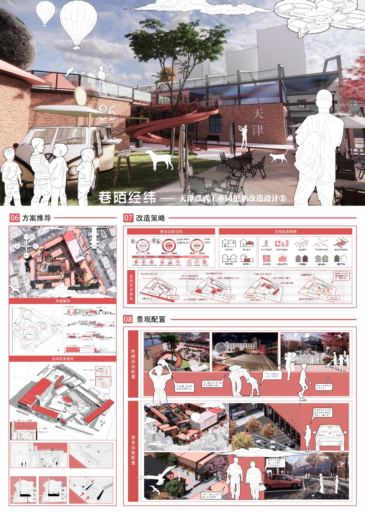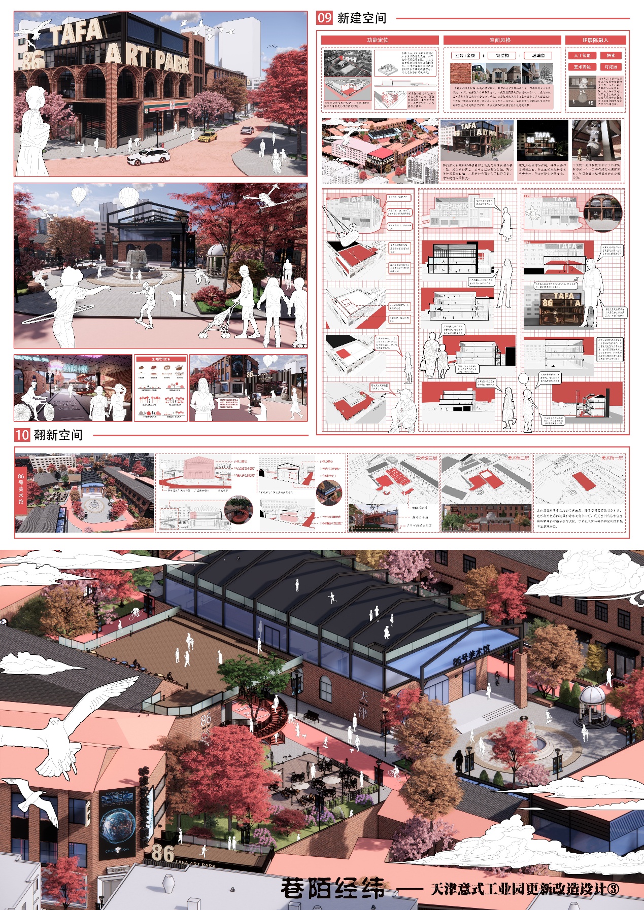设计说明:本作品围绕天津市河北区张兴庄大道86號产业园区展开设计,面对空间利用率低、业态混杂、文化认同缺失等问题,亟需通过城市更新实现产业升级与空间价值重构。本设计创新性地将媒介地理学理论与城市更新实践相结合,构建了"空间生产-媒介叙事-产业激活"三位一体的更新范式。