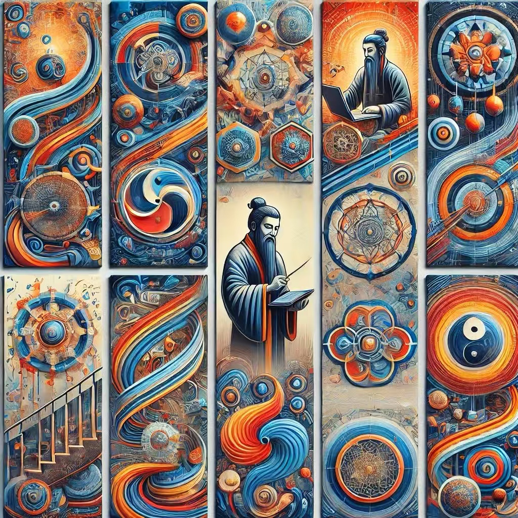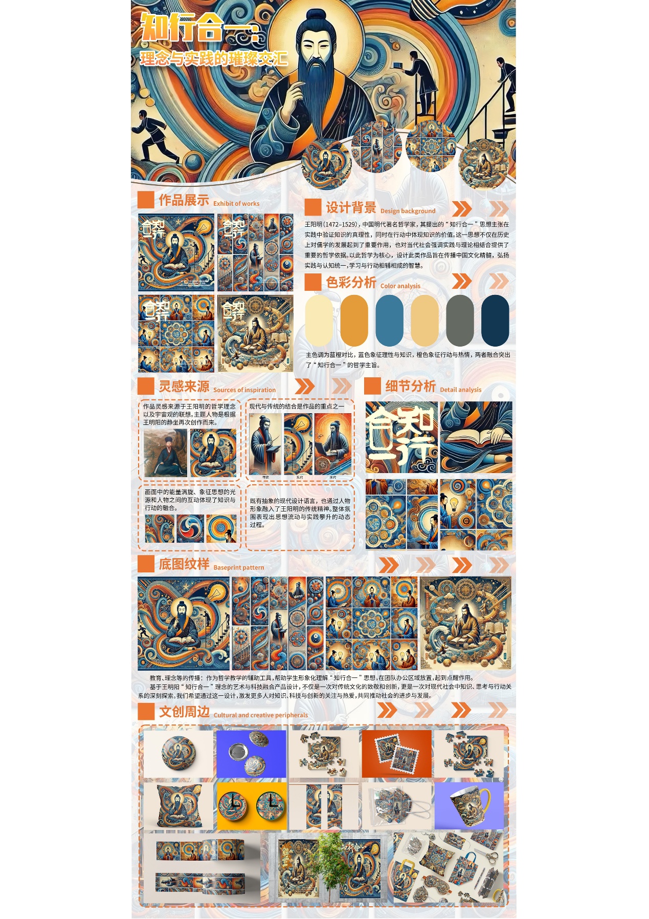 设计说明:作品灵感来源于王阳明的哲学理念以及宇宙观的联想。画面中的能量涡旋、象征思想的光源和人物之间的互动体现了知识与行动的融合。现代与传统的结合是作品的重点之一,既有抽象的现代设计语言,也通过人物形象融入了王阳明的传统精神。整体氛围表现出思想流动与实践攀升的动态过程。基于王明阳“知行合一”理念的艺术与科技融合产品设计,不仅是一次对传统文化的致敬和创新,更是一次对现代社会中知识、思考与行动关系的深刻探索。我们希望通过这一设计,激发更多人对知识、科技与创新的关注与热爱,共同推动社会的进步与发展。