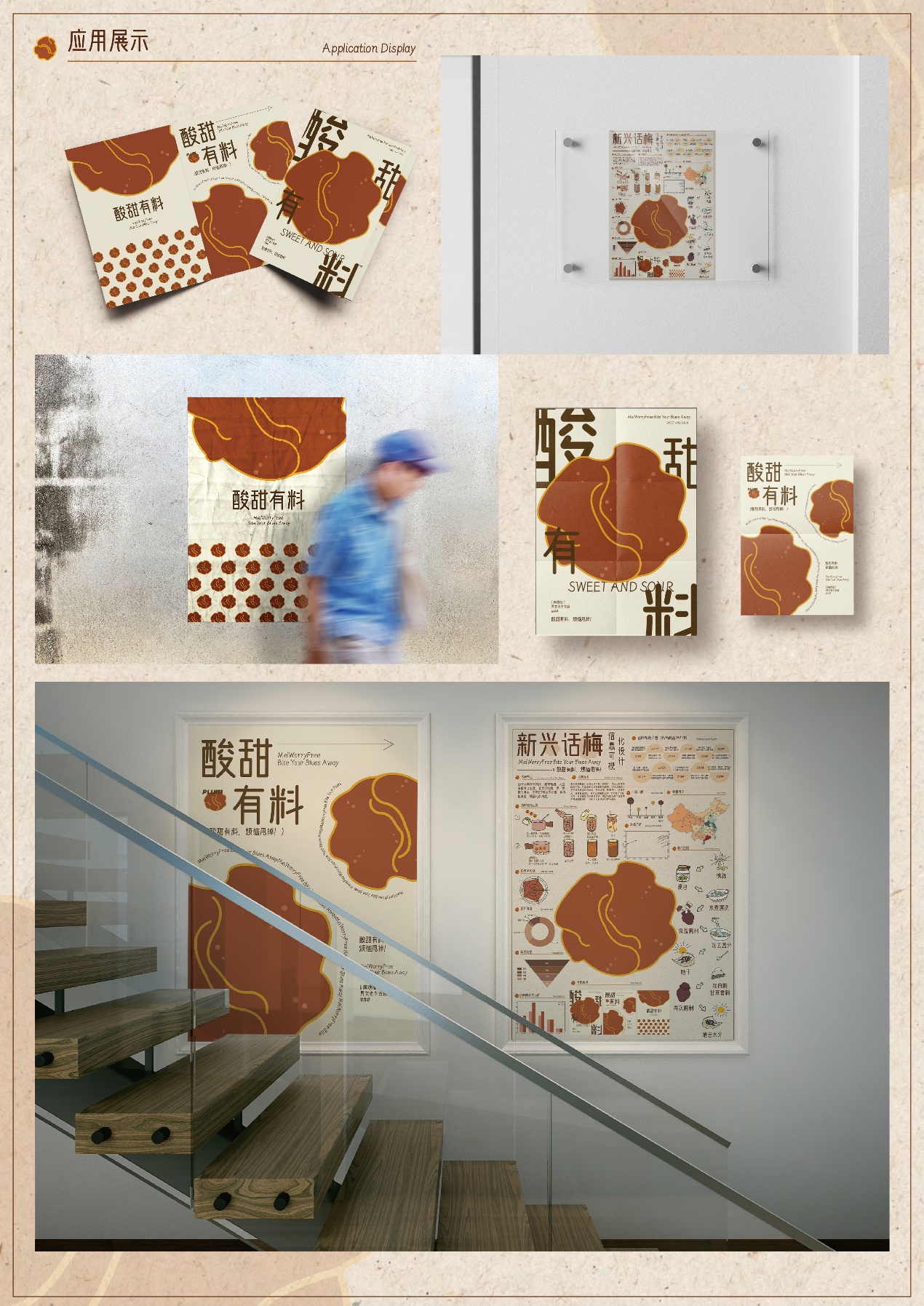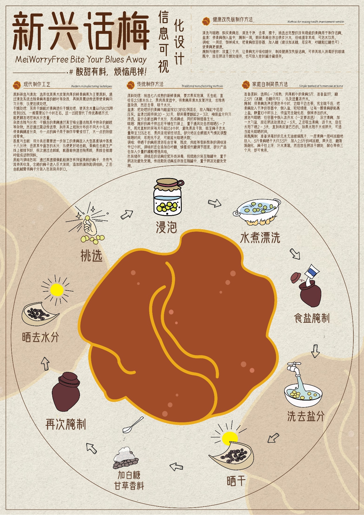 设计说明:本设计以“新兴话梅”为核心,通过中英双语标题、地域标识、工艺时间轴,数据雷达图及销量地图等可视化模块,结合“琥珀粽”主色调与扁平化插画风格,全面呈现产品特色,非遗工艺、营养价值及市场表现,既强化品牌文化厚度,又以场景化延展与交互潜力引导消费决策,实现传统食品的现代化传播。