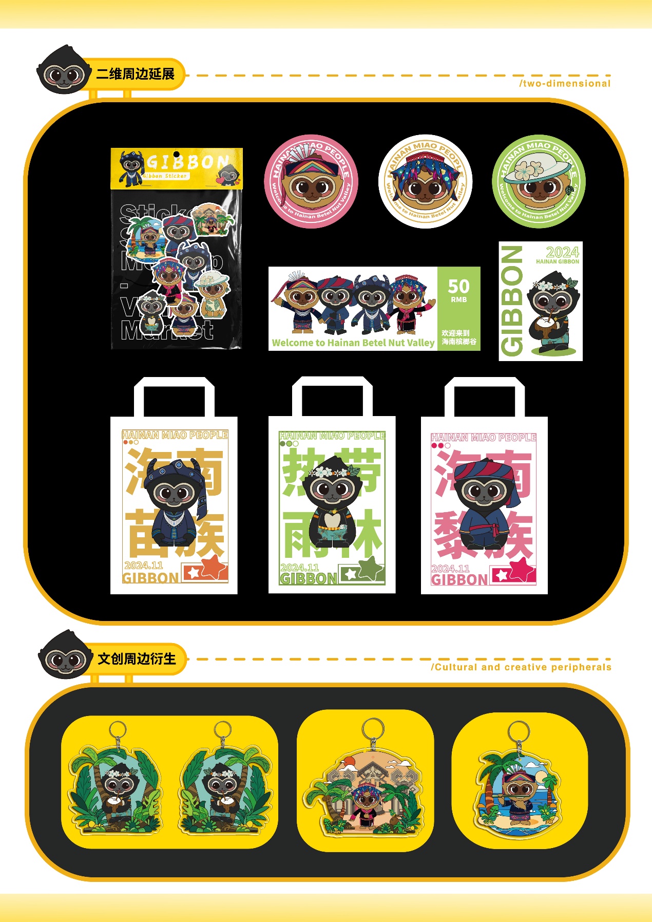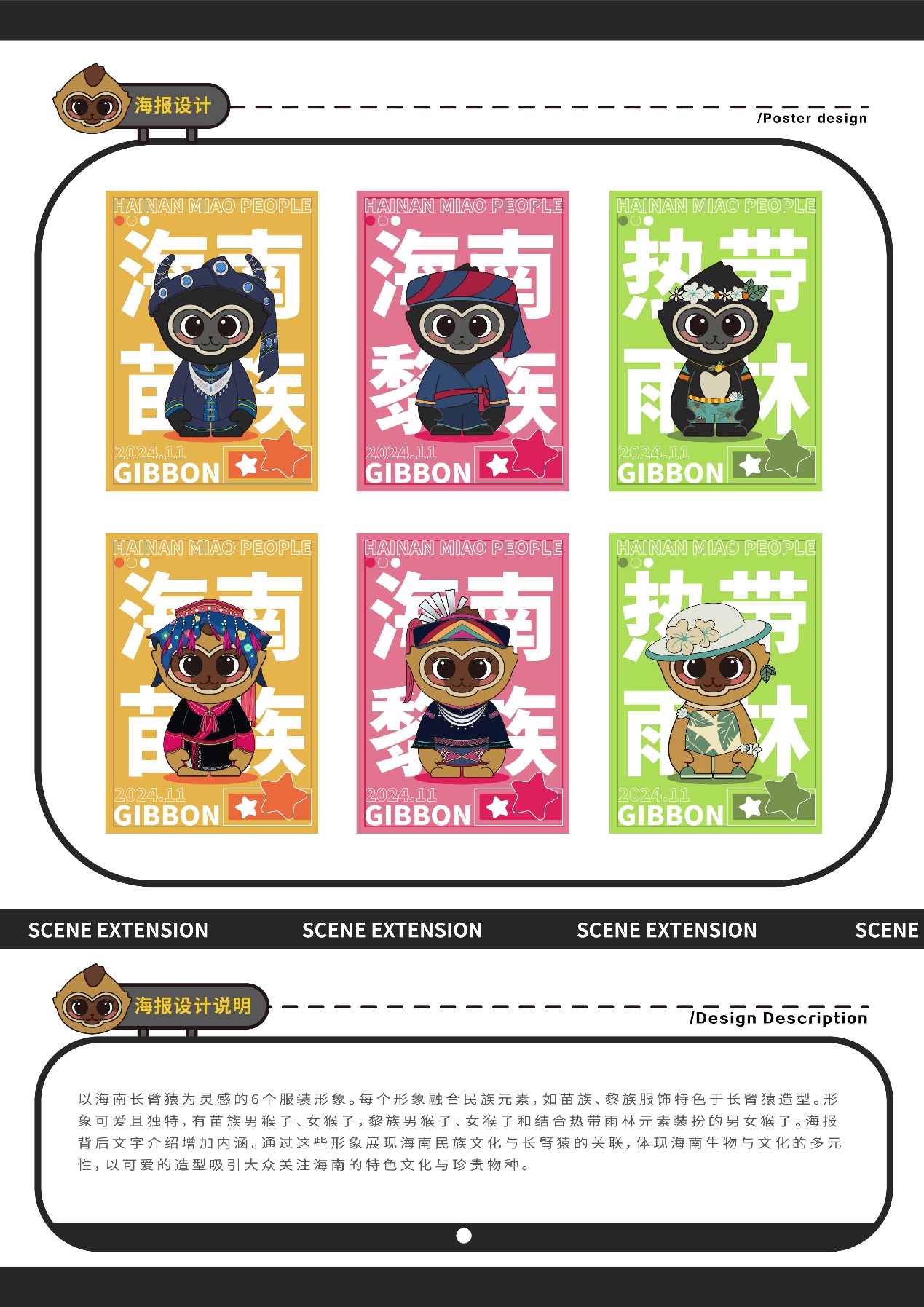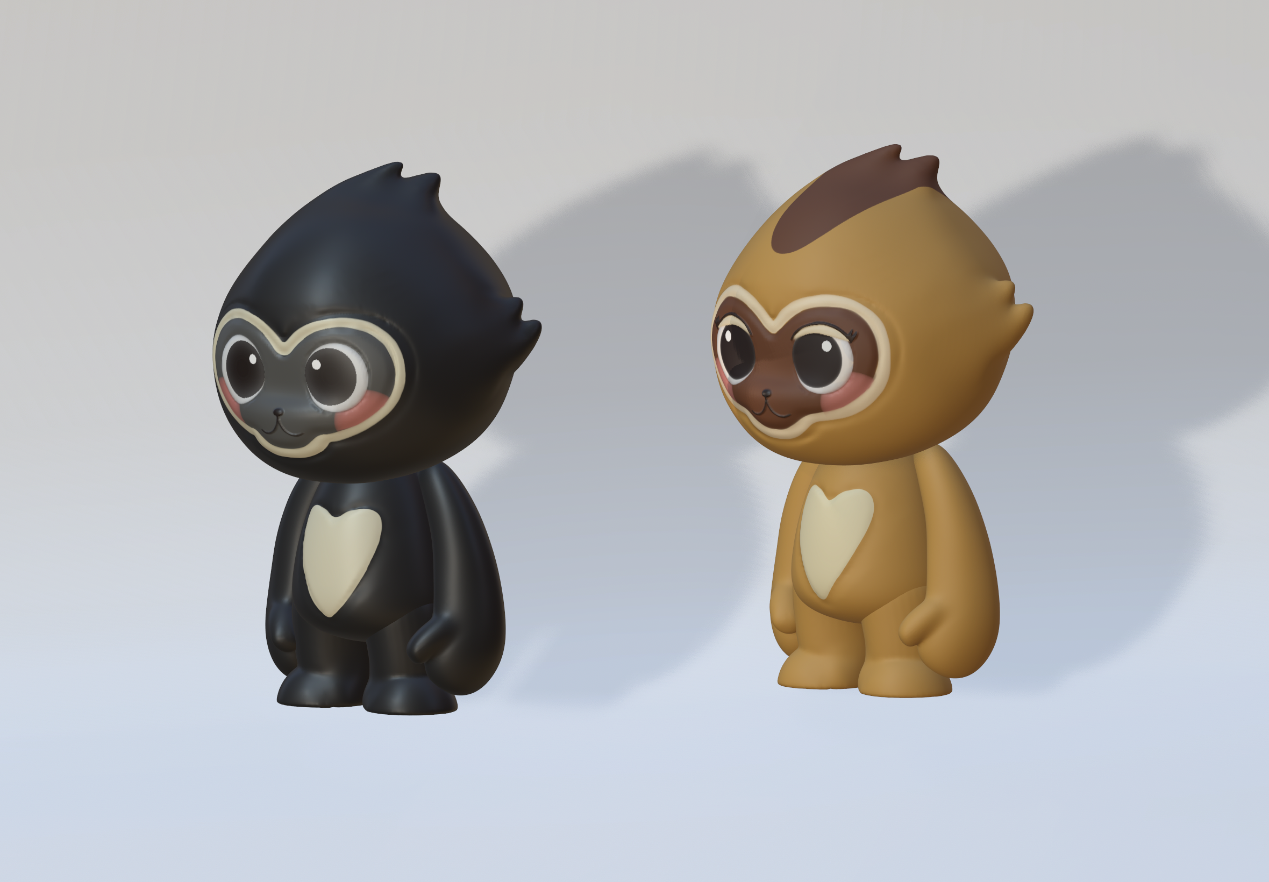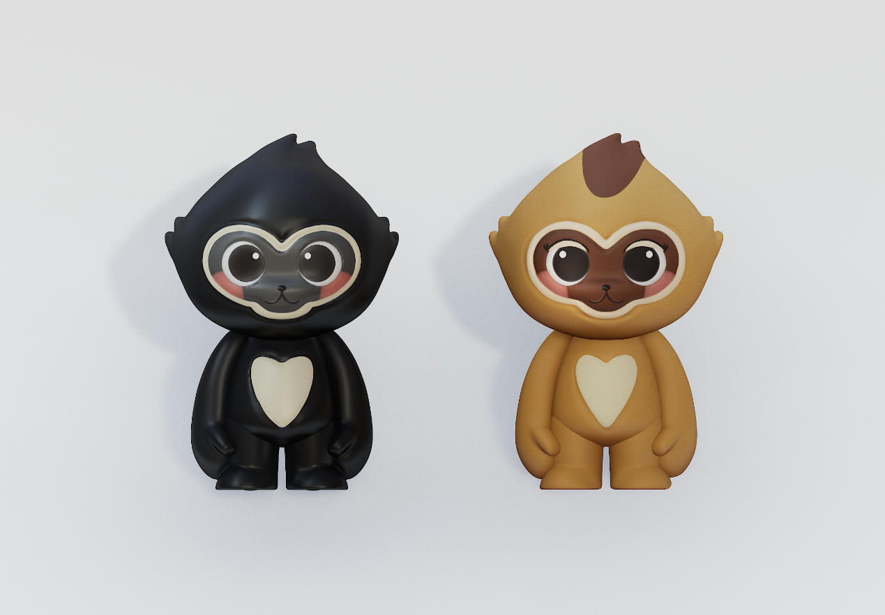 设计说明:雄性海南长臂猿“猿宝”设计说明:整体以黑色为主,米白色辅助。外形似猴无尾,前肢长于后肢,手臂设计得较长,这与长臂猿善于攀援的特性相呼应。面部塑造得可爱,圆眼睛、小鼻子黑色的主色调体现雄性长臂猿的体色特征,米白色点缀在腹部、脸部等,增加层次感和萌感。雌性海南长臂猿“猿灵”设计说明:主色为黄色,棕色辅助。与雄性造型相似,无尾且前肢长。表情灵动可爱,黄色体现雌性的体色,棕色用于描绘毛发、面部等细节。圆润的脸蛋配上灵动的眼睛,展现雌性长臂猿的活泼,整体造型可爱且具有海南长臂猿的特征。