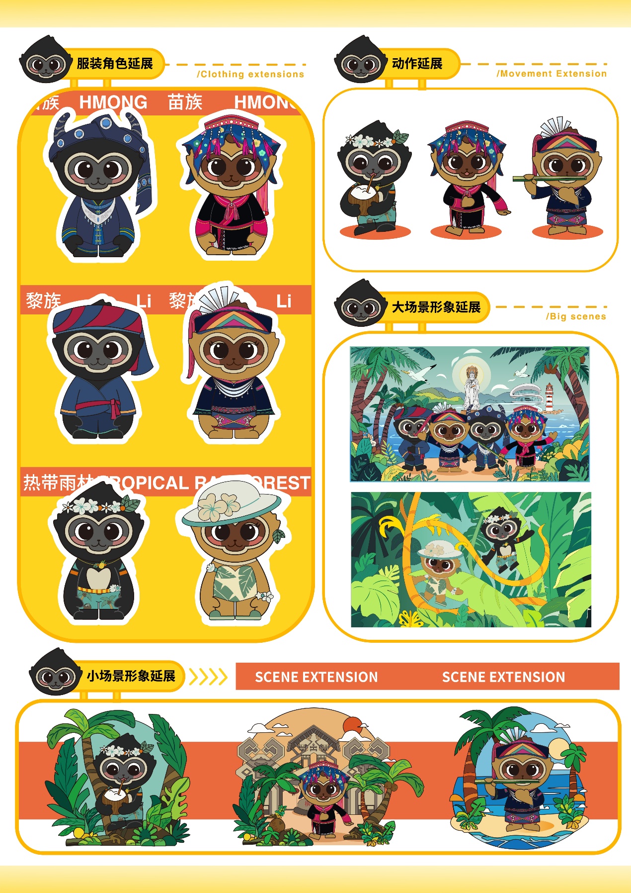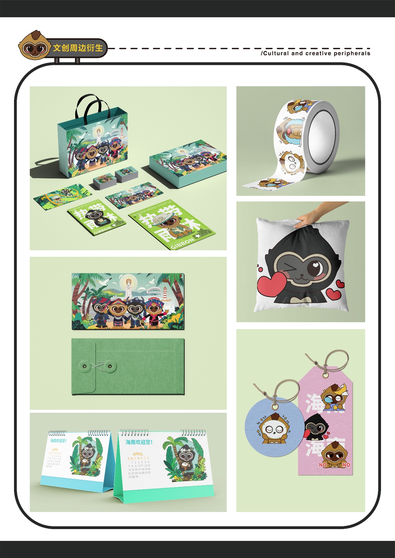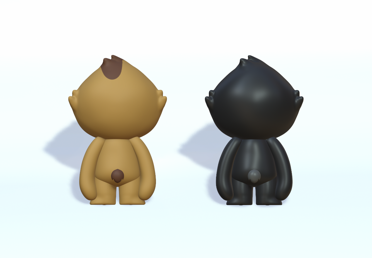 设计说明:雄性海南长臂猿“猿宝”设计说明:整体以黑色为主,米白色辅助。外形似猴无尾,前肢长于后肢,手臂设计得较长,这与长臂猿善于攀援的特性相呼应。面部塑造得可爱,圆眼睛、小鼻子黑色的主色调体现雄性长臂猿的体色特征,米白色点缀在腹部、脸部等,增加层次感和萌感。雌性海南长臂猿“猿灵”设计说明:主色为黄色,棕色辅助。与雄性造型相似,无尾且前肢长。表情灵动可爱,黄色体现雌性的体色,棕色用于描绘毛发、面部等细节。圆润的脸蛋配上灵动的眼睛,展现雌性长臂猿的活泼,整体造型可爱且具有海南长臂猿的特征。
