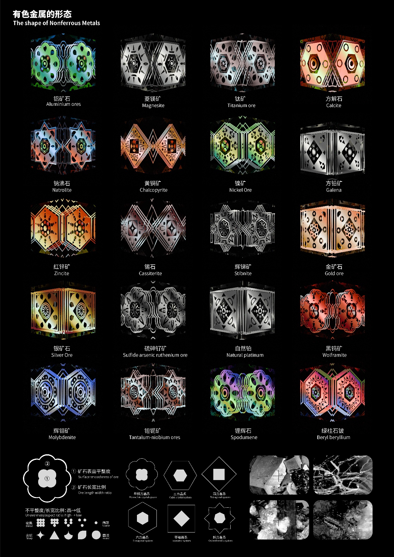 设计说明:本作品主要的可视化对象是有色金属,主要针对其颜色,形态,质感与物理性质进行可视化表现。在颜色,形态与质感方面使用三维工具辅助,在有效传递信息的同时,使视觉方面也更加贴合主题。而在对其物理性质的数据可视化过程中,使用了动态方法进行表达,针对其密度,硬度,延展性进行了可视化定义,让用户更加直观地感受到。