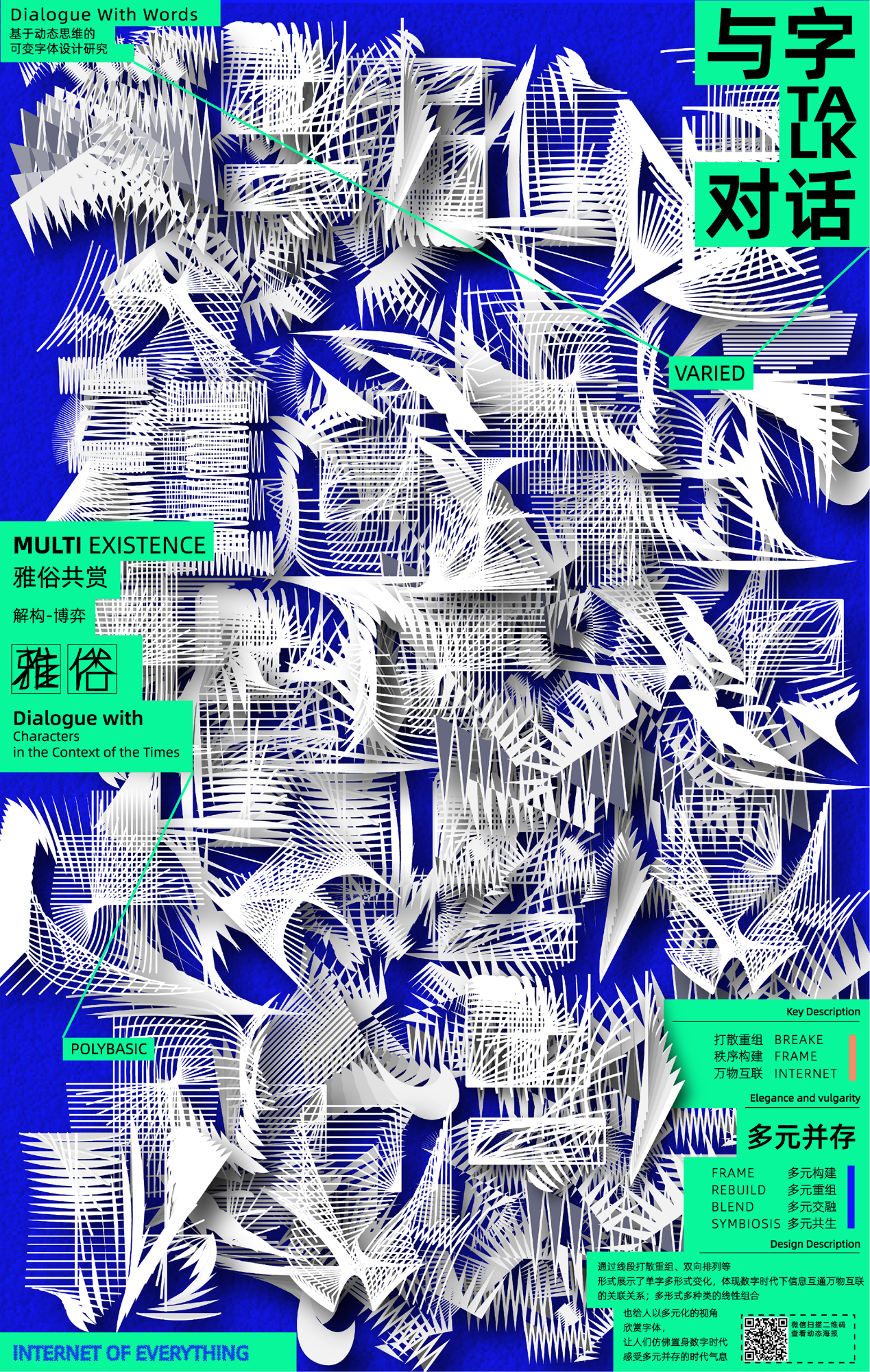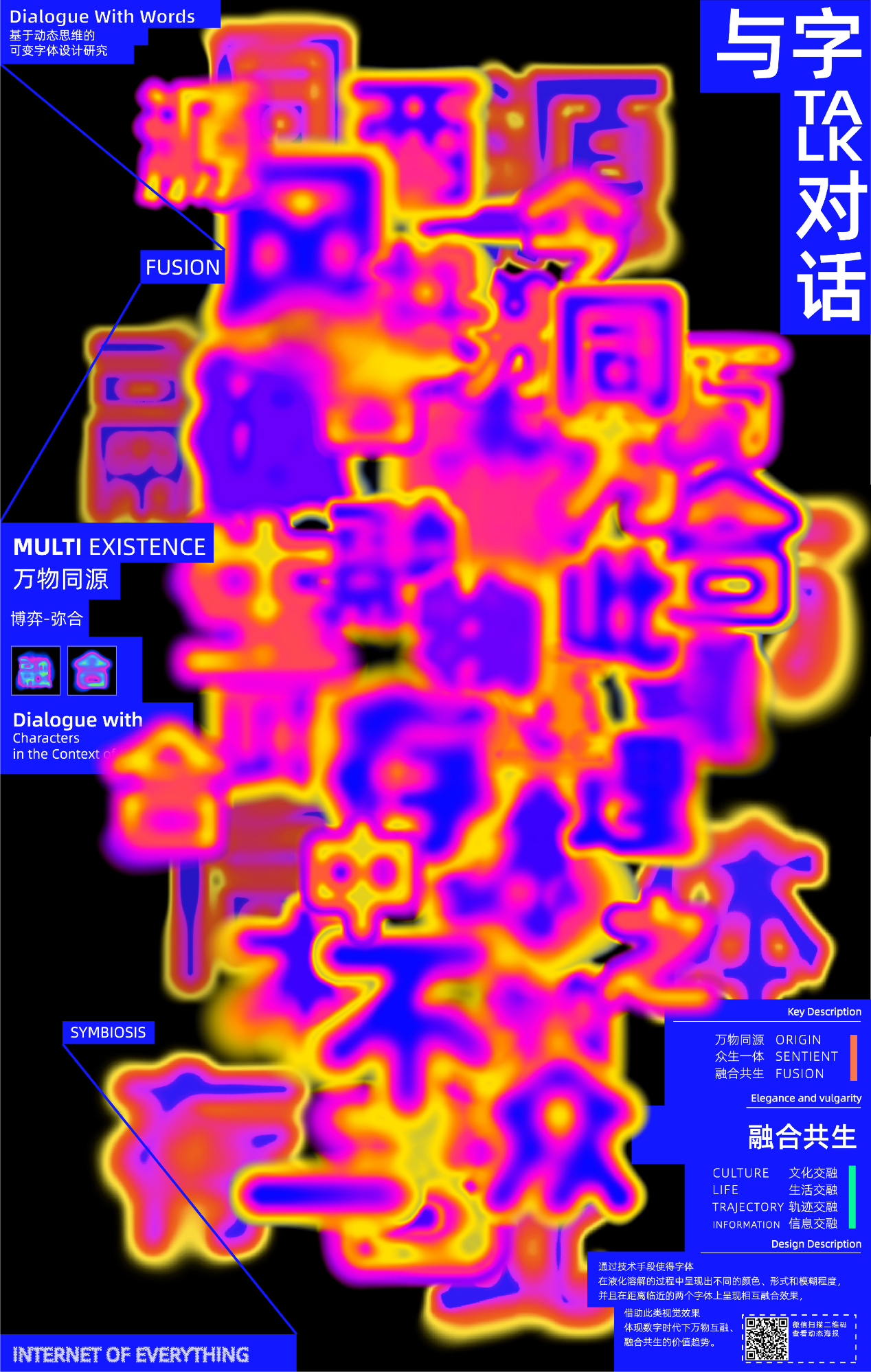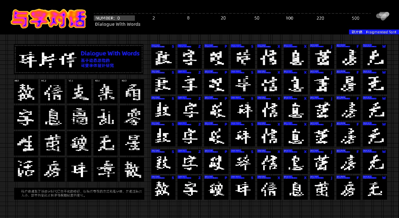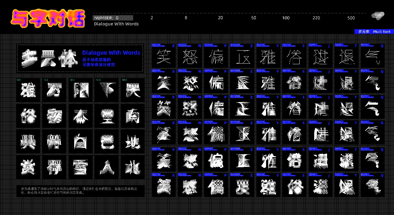 设计说明:与字对话-数字时代生态演变录:这三套字体以数字时代的生态演变为隐喻,构建从无序到共生的视觉叙事。「碎片体」用动态像素模拟数据碎片的无序堆积,暗喻信息熵增的混沌特征;「多元体」以线条的疏密变化形成视觉驻波,象征多元观点在对抗中形成的动态平衡;「融合体」则突破固有边界,通过液态渐变表现数字社群中信息流的渗透与共生。三款字体从“解构”到“博弈”再到“弥合”,暗合互联网时代的认知迭代——碎片化信息历经多元碰撞进而流动涌现成为知识网络。本设计以赛博格美学回应庄子“万物皆种也,以不同形相禅”的哲思,在汉字基因链的裂变与重组之间探索其未来可能的表达。