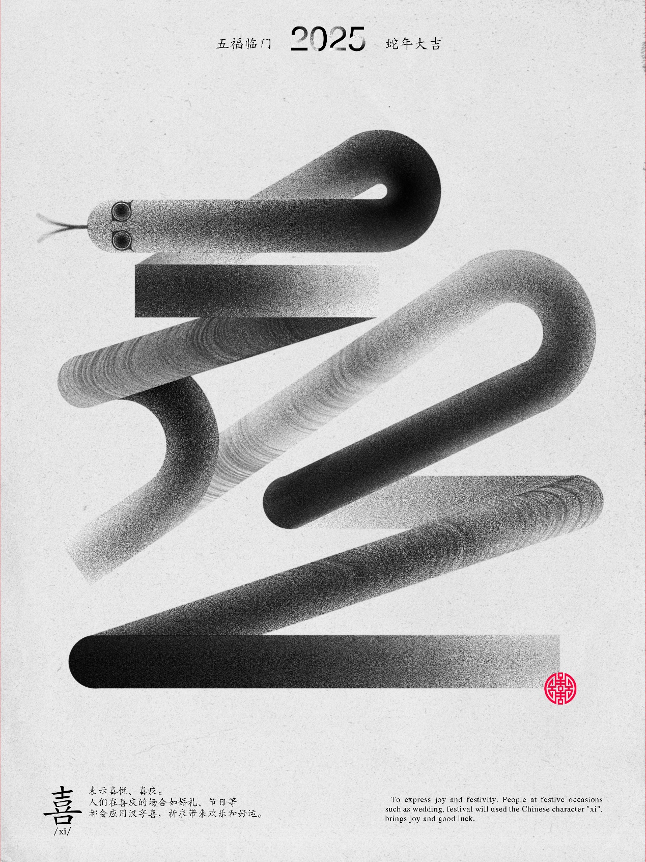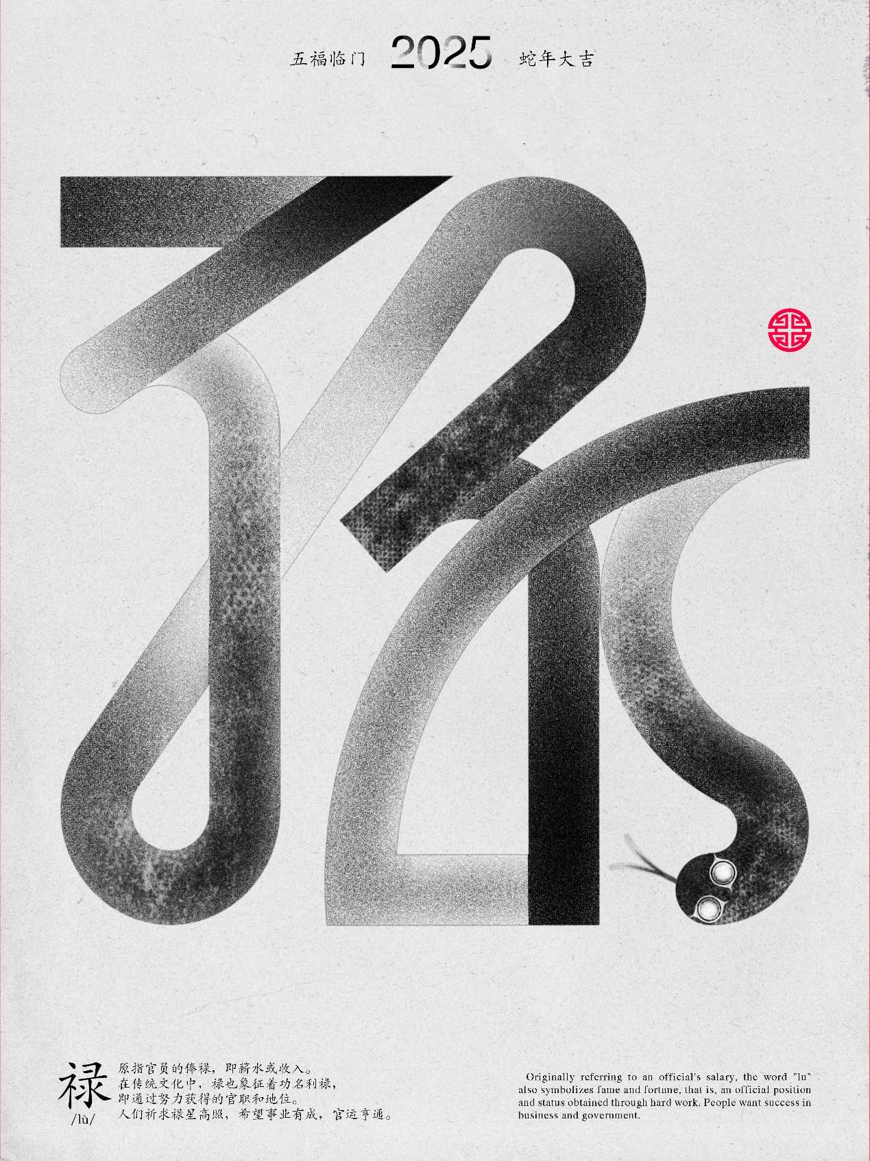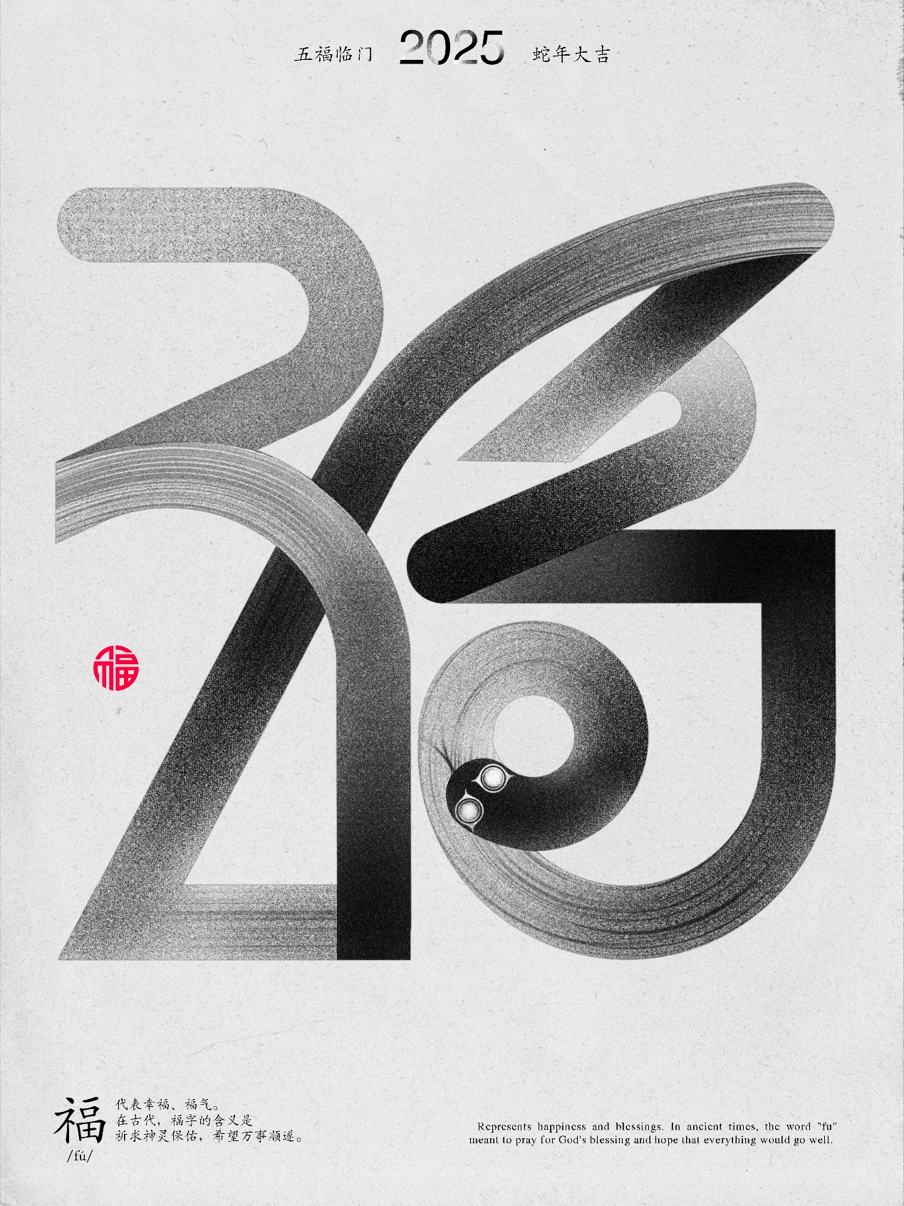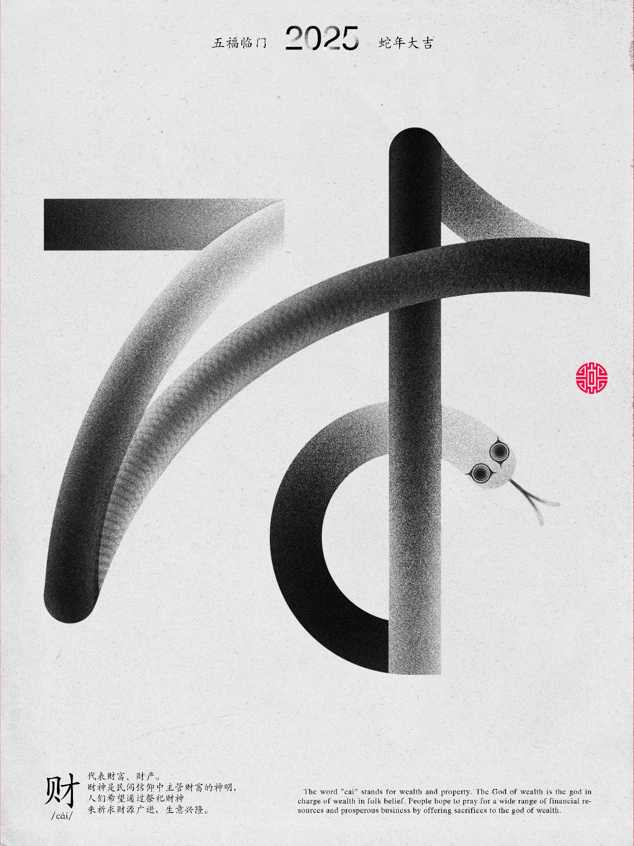 设计说明:海报结合书法汉字“福禄寿喜财”与蛇年生肖形象,展示传统的艺术魅力和浓厚的文化氛围。其中蛇的形象与草书的流畅线条相得益彰,既体现出书法的水墨美感,又将传统吉祥寓意赋予其中,为观者送上真挚祝福。