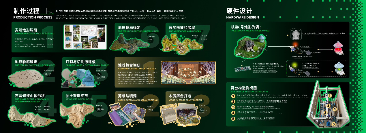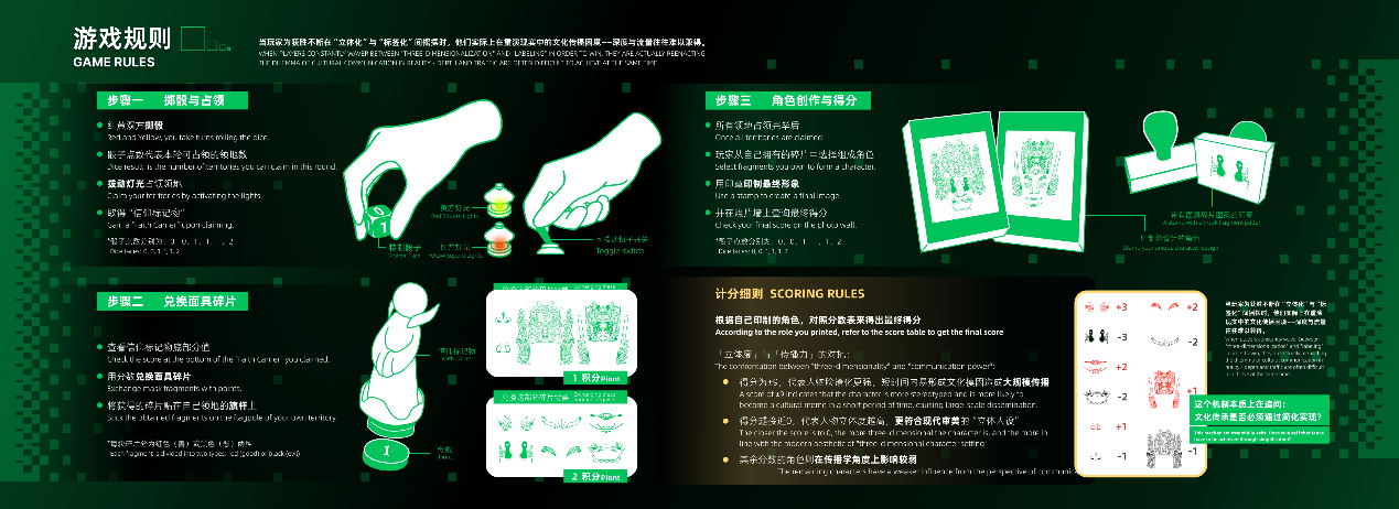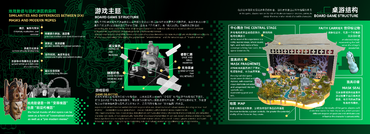 设计说明:该装置目的的是探索和呈现文化模因的生成与传播机制,以地戏面具为代表的“旧模因”如何在现代传播语境下再生。 探讨旧时代由于传播载体局限性,可能更为刻板化的人物形象更利于传播,而现代传播环境下,形象更加复杂立体的角色更容易引起关注与讨论,凸显不同传播时代“文化模因”的差异。