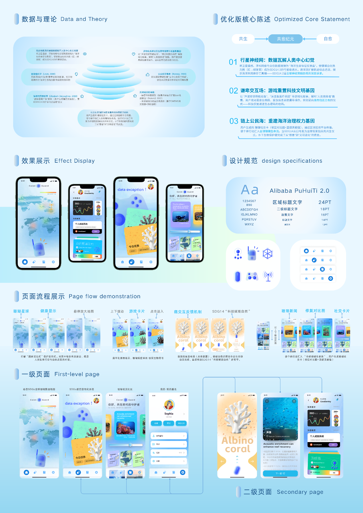 设计说明:面对全球珊瑚礁30年内锐减过半的生态危机,传统人工修复却陷入高成本低效的困局,CoralGuard应运而生。本设计贯彻 “自然自愈引擎”:通过动态感知层ROV巡航,融合卫星与浮标数据,在珊瑚星球地图实现色块化危机预警(红/橙/绿),精准定位病礁区;进而触发声景导航系统召唤幼鱼归巢,投放信息素胶囊引导清洁鱼狙击病害,让生态链自愈力成为修复主力;最终借APP虚游戏化任务与珊瑚社交卡,将手机转化为海洋急救终端,驱动公众参与度。这不仅使单使修复成本降至人工方案,更重塑SDG14实践范式——人类退位为“生态信号员”,而珊瑚礁重掌生命主导权。