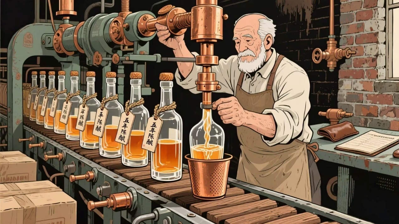 画面元素:人物形象是视觉焦点之一。从年轻酿酒师专注劳作,到年老时经验沉淀,不同阶段的形象变化,不仅展示酿造技艺传承,更传递出坚守与匠心精神。其动作、神态精心设计,如搅拌、蒸煮等动作,配合专注神情,体现酿造过程的严谨细致。