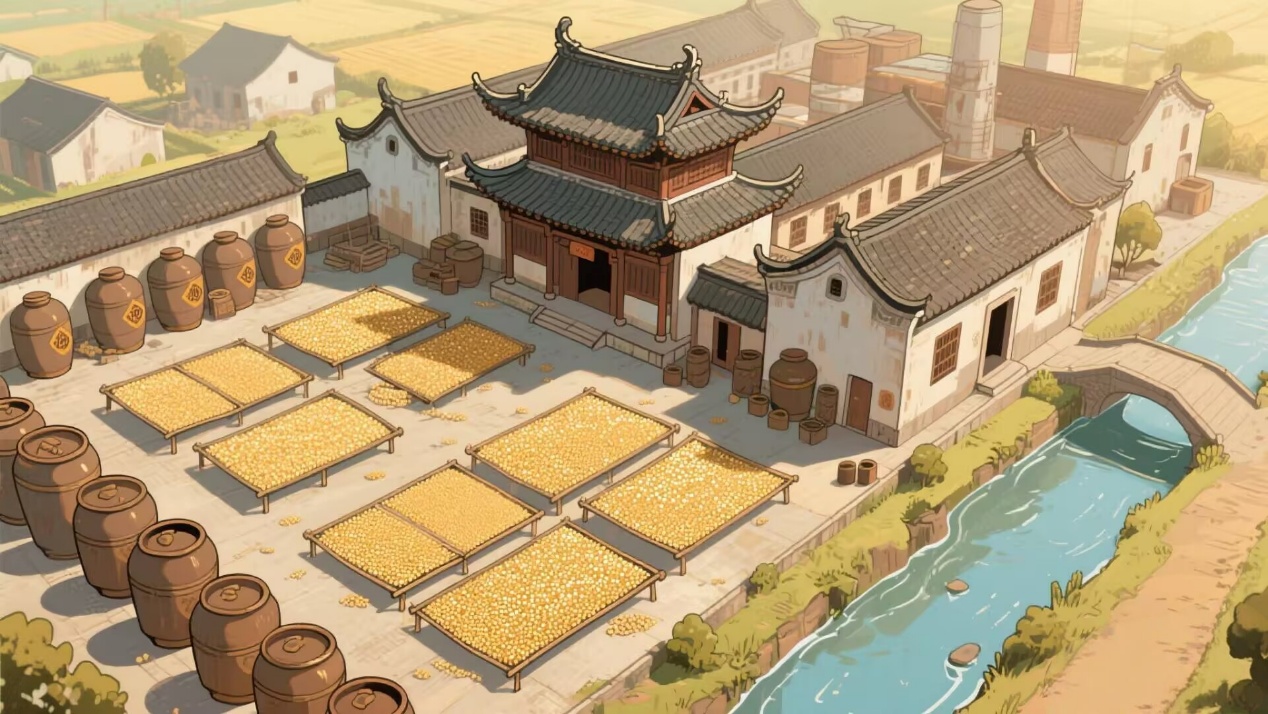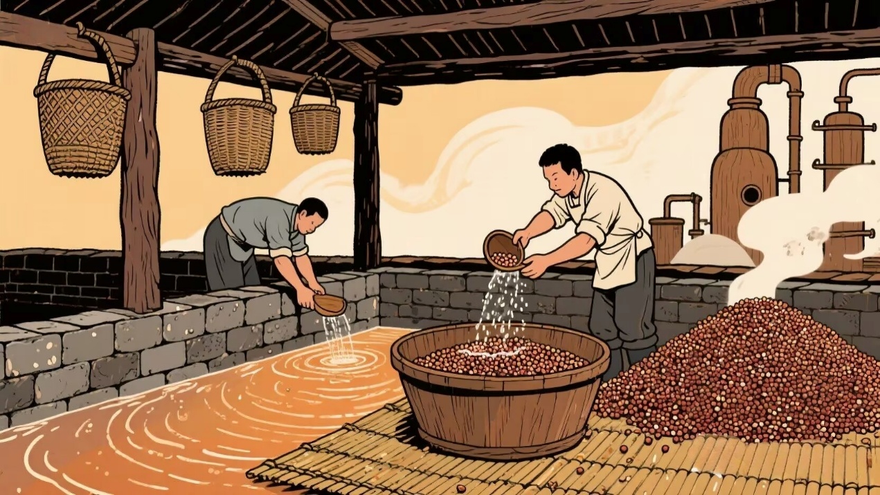 场景:酿酒作坊场景细致还原,从堆积的高粱、小麦等原料,到热气腾腾的蒸锅、排列整齐的窖池,再到昏暗酒窖中沉睡的酒坛。这些元素全方位呈现酿造流程,从原料选取到发酵、蒸馏、陈酿等环节,让观众对白酒酿造有直观清晰认知。
