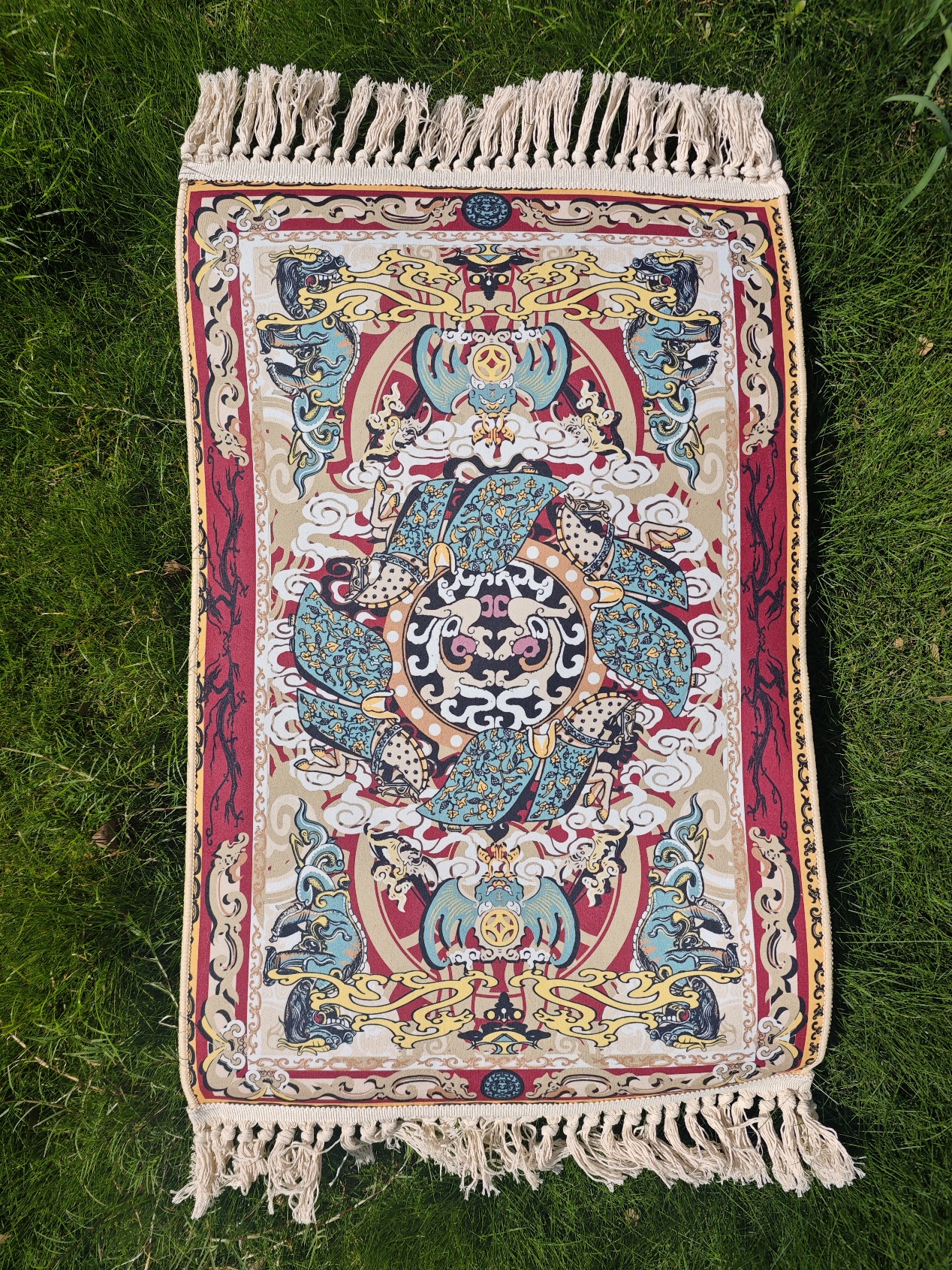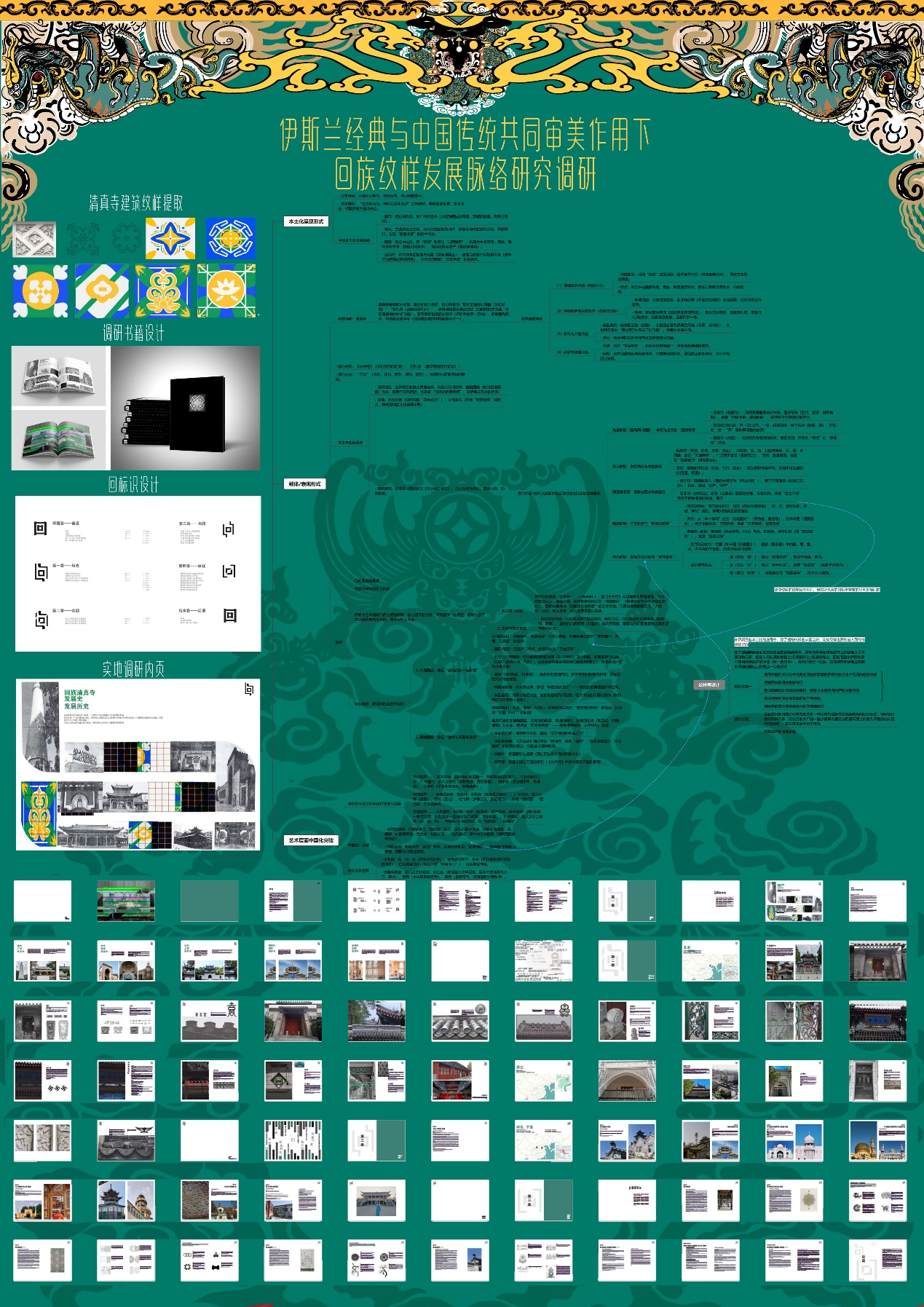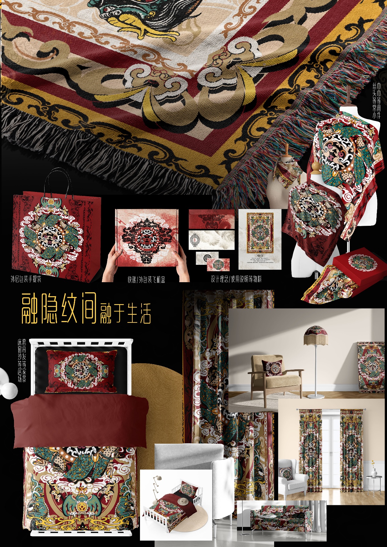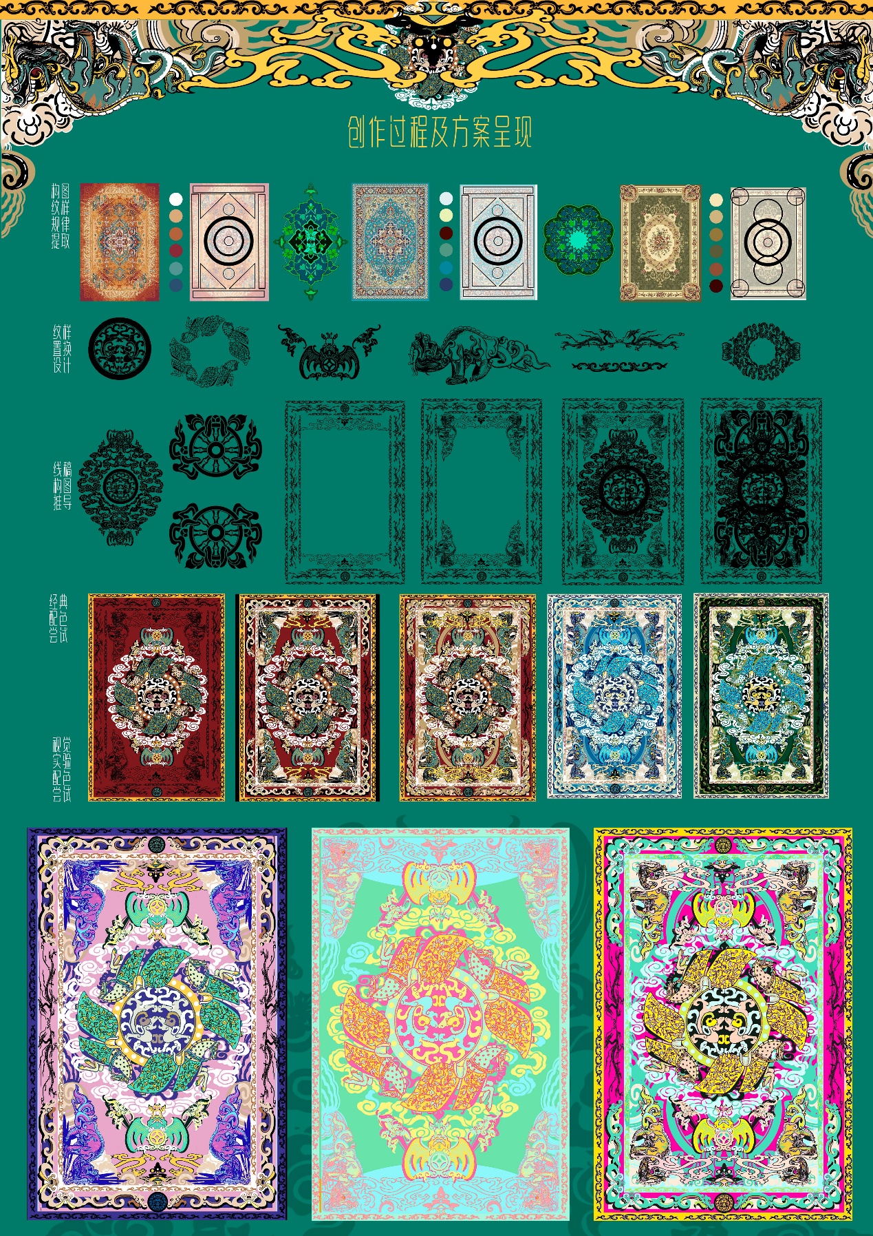 作品说明:作为一名土生土长的回族身份认同与对中国传统文化的感受在经历外地求学后产生了观念冲突,这促使我通过回族小聚居场所的实地调研答疑解惑,根据我的研究发现在伊斯兰教艺术中国本土化进程中,动物纹样虽逐步融入装饰领域,但宁夏吴忠回族老一辈在核心生活场景中,仍坚守不使用动物纹样的传统习俗。本设计以此为切入点用中国传统文化中的经典动物形象,替代伊斯兰教装饰中的经典植物纹样,同时完整保留伊斯兰风格特有的鲜明色彩特征。同时使用本地短羊绒地毯扎染与长羊毛手工编织的手工艺人进行打样制品,作为礼物送给宗亲并普及这一文化现象,阐述少数民族文化是中国传统文化必不可少的一部分,中国传统文化也是少数民族文化发展连绵不断的养分来源,两者密不可分