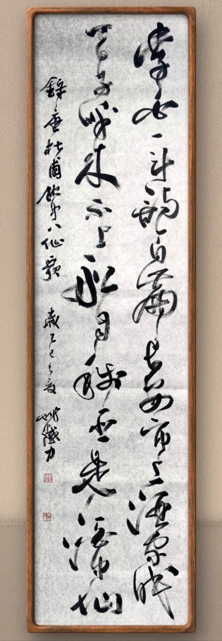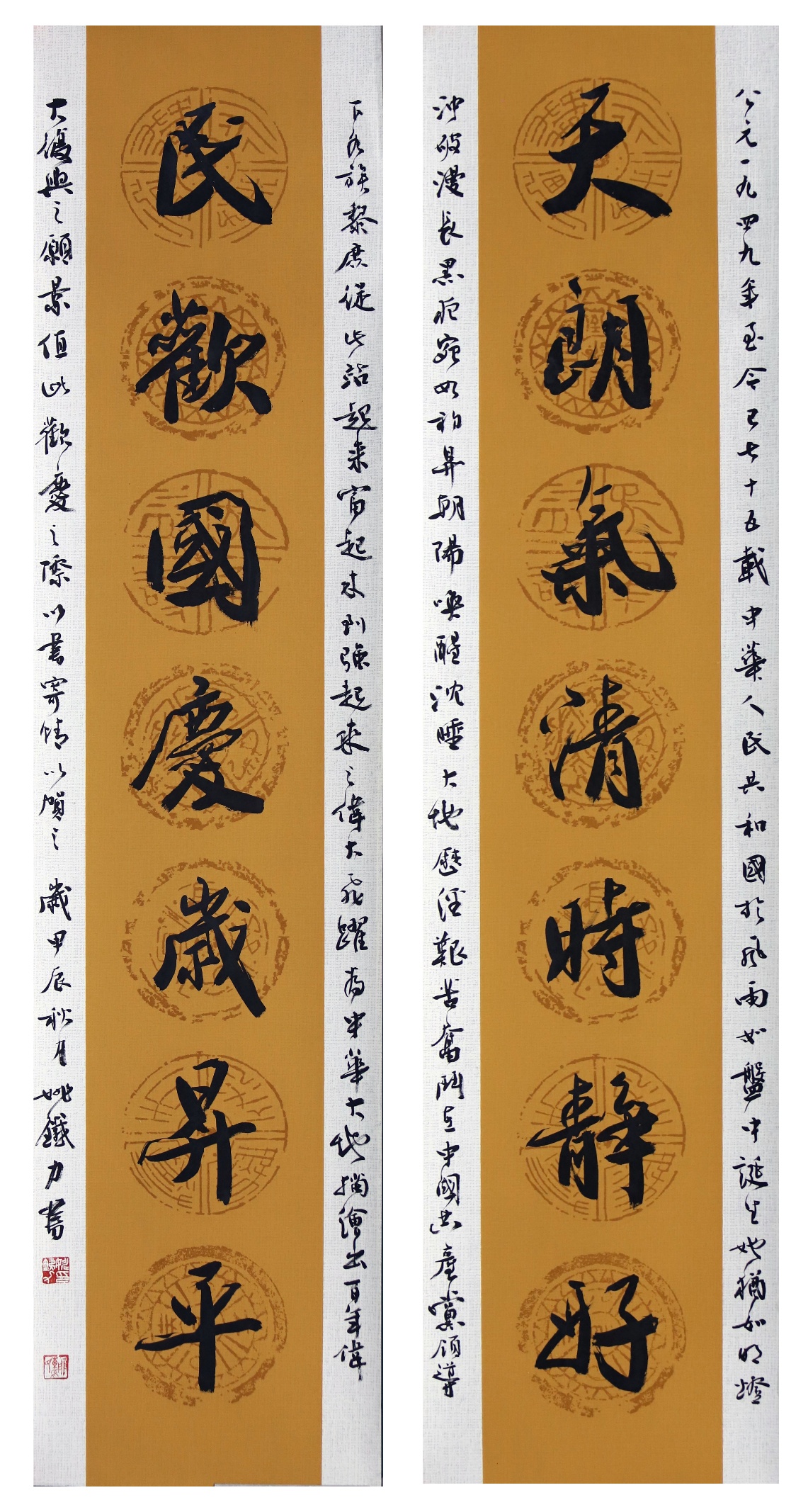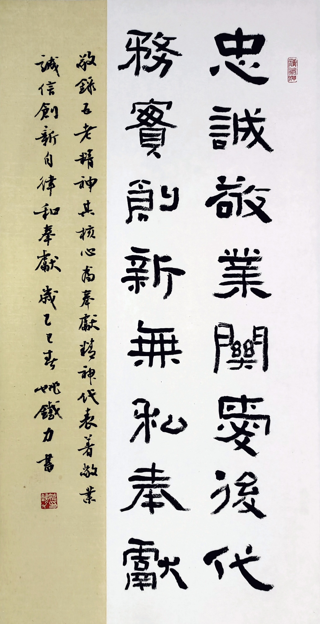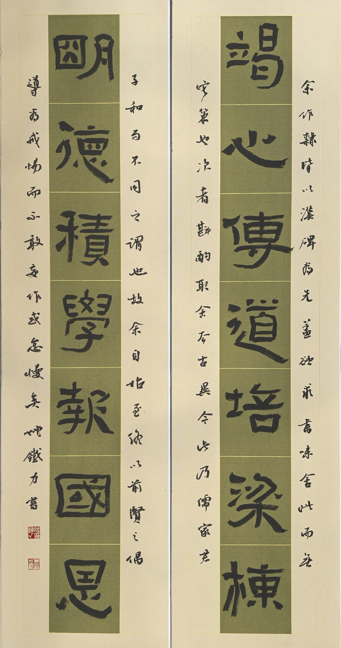 作品说明:十幅作品中,除了篆书字体以外,涵盖了隶、楷、行、草四种字体。本人在追随家学的基础上,个人风格主要是力求守正,秉承古意。其中隶书主要师法汉碑,如《石门颂》、《曹全碑》、《西狭颂》、《史晨碑》等。同时兼容汉简笔法。魏碑主要是师承《张猛龙碑》和《郑文公碑》。行草主要是取法王羲之《十七帖》、怀素《自叙帖》和黄庭坚草书笔意。