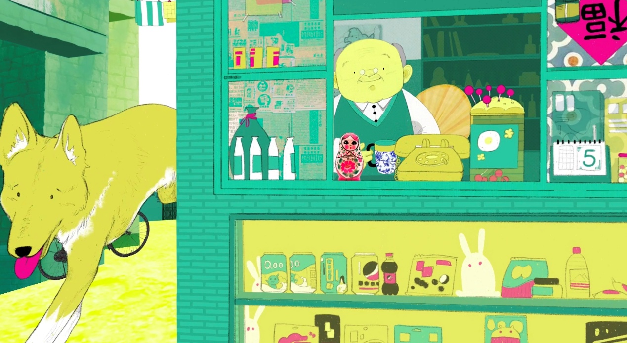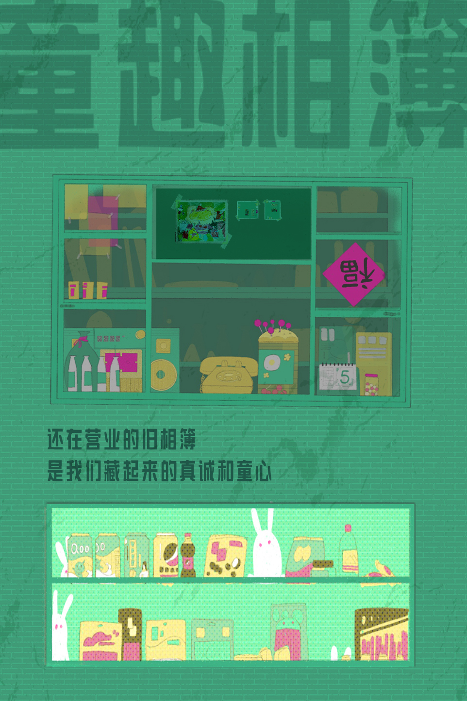 在色彩运用上,作品突破传统怀旧主题的惯用色调,主要选用绿色与黄色作为基调,同时以红色点缀画面中的关键角色,形成视觉焦点,营造出既复古又新颖的审美体验。