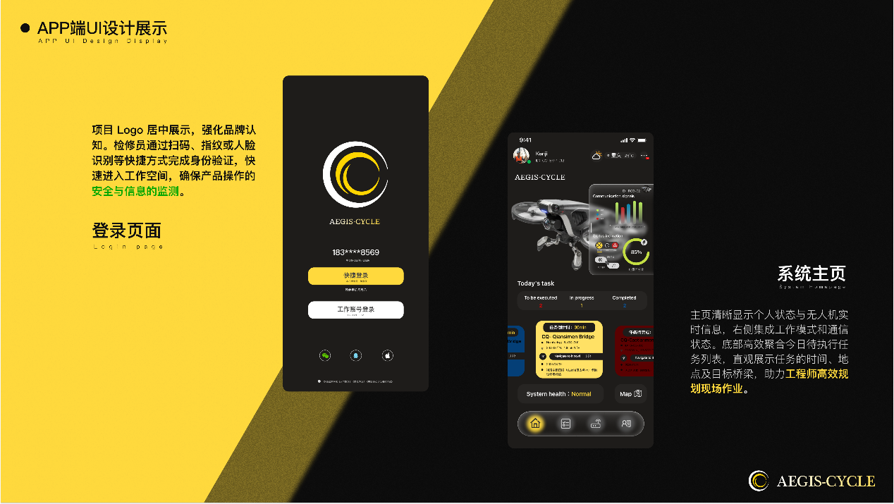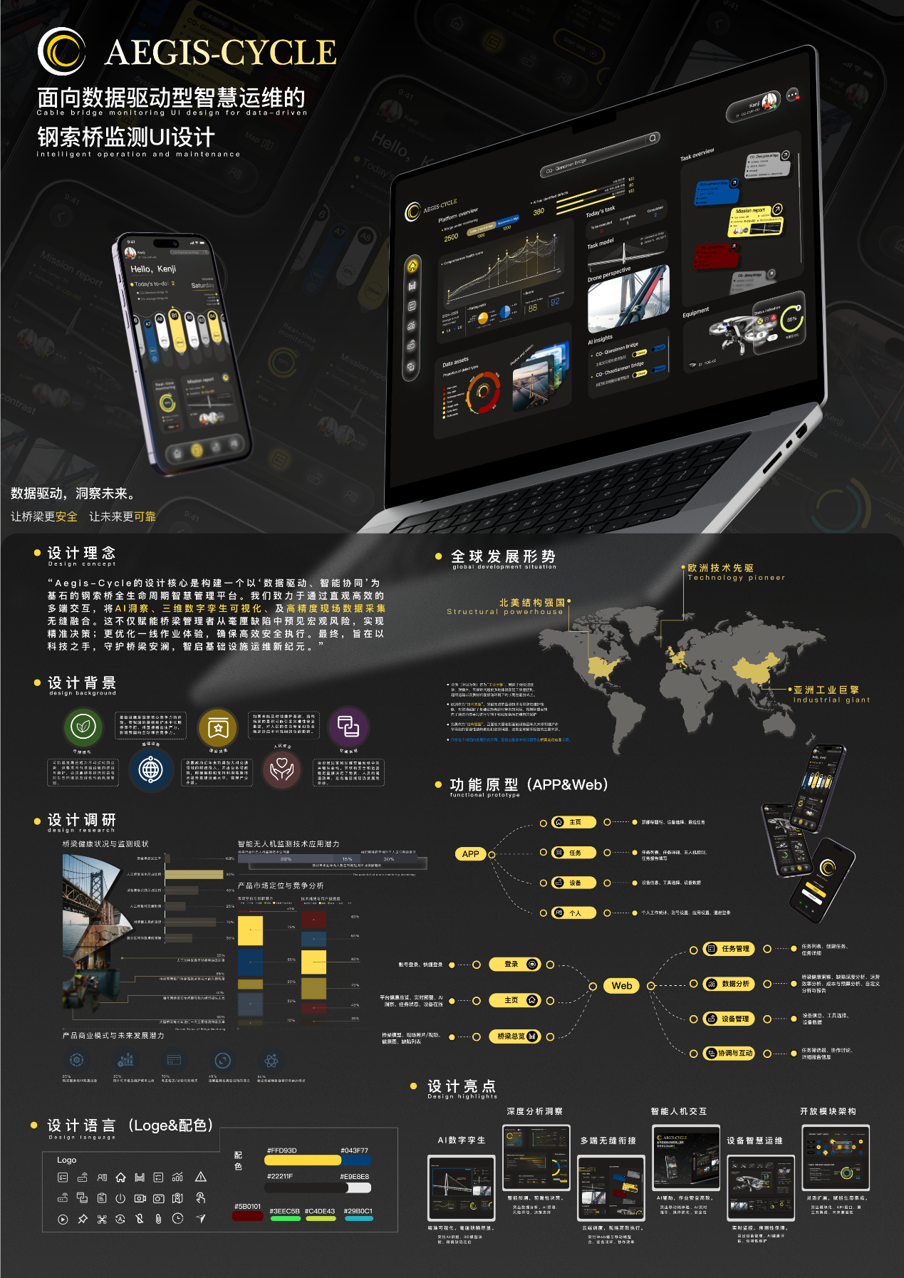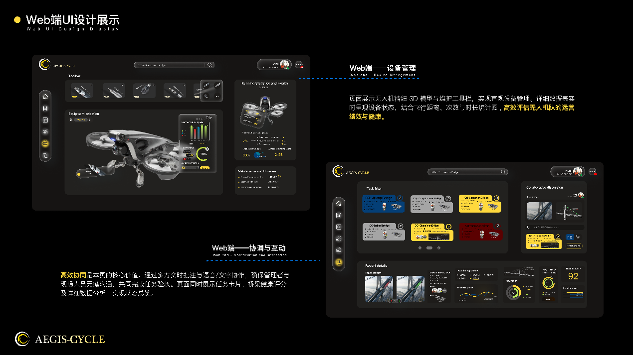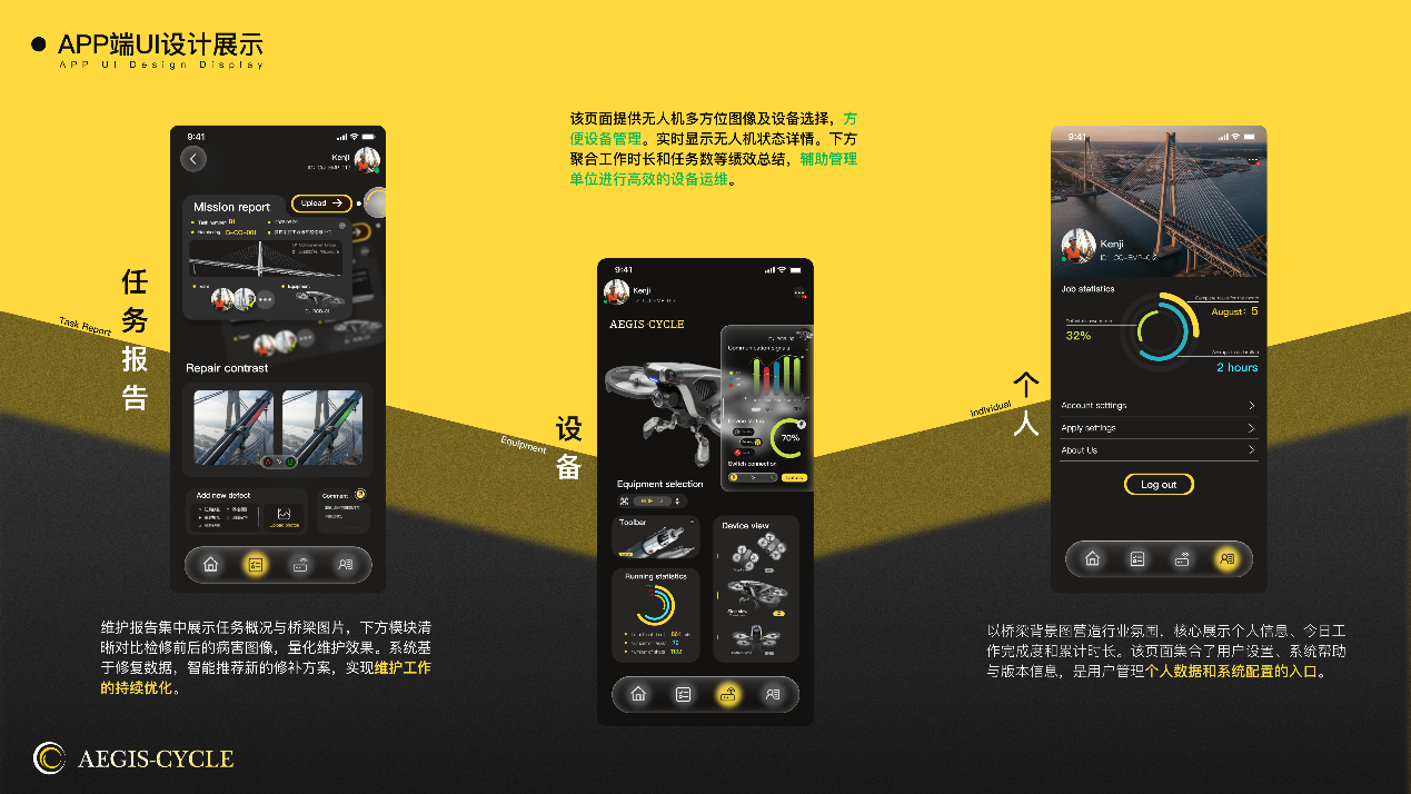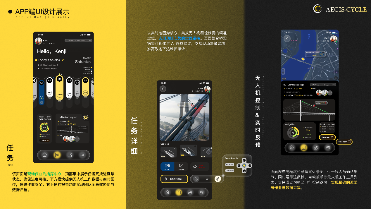 作品说明:“Aegis-Cycle的设计核心是构建一个以‘数据驱动、智能协同’为基石的钢索桥全生命周期智慧管理平台。我们致力于通过直观高效的多端交互,将AI洞察、三维数字孪生可视化、及高精度现场数据采集无缝融合。这不仅赋能桥梁管理者从毫厘缺陷中预见宏观风险,实现精准决策;更优化一线作业体验,确保高效安全执行。最终,旨在以科技之手,守护桥梁安澜,智启基础设施运维新纪元。”