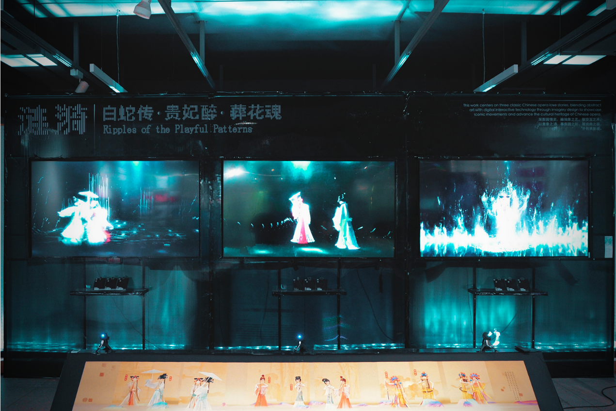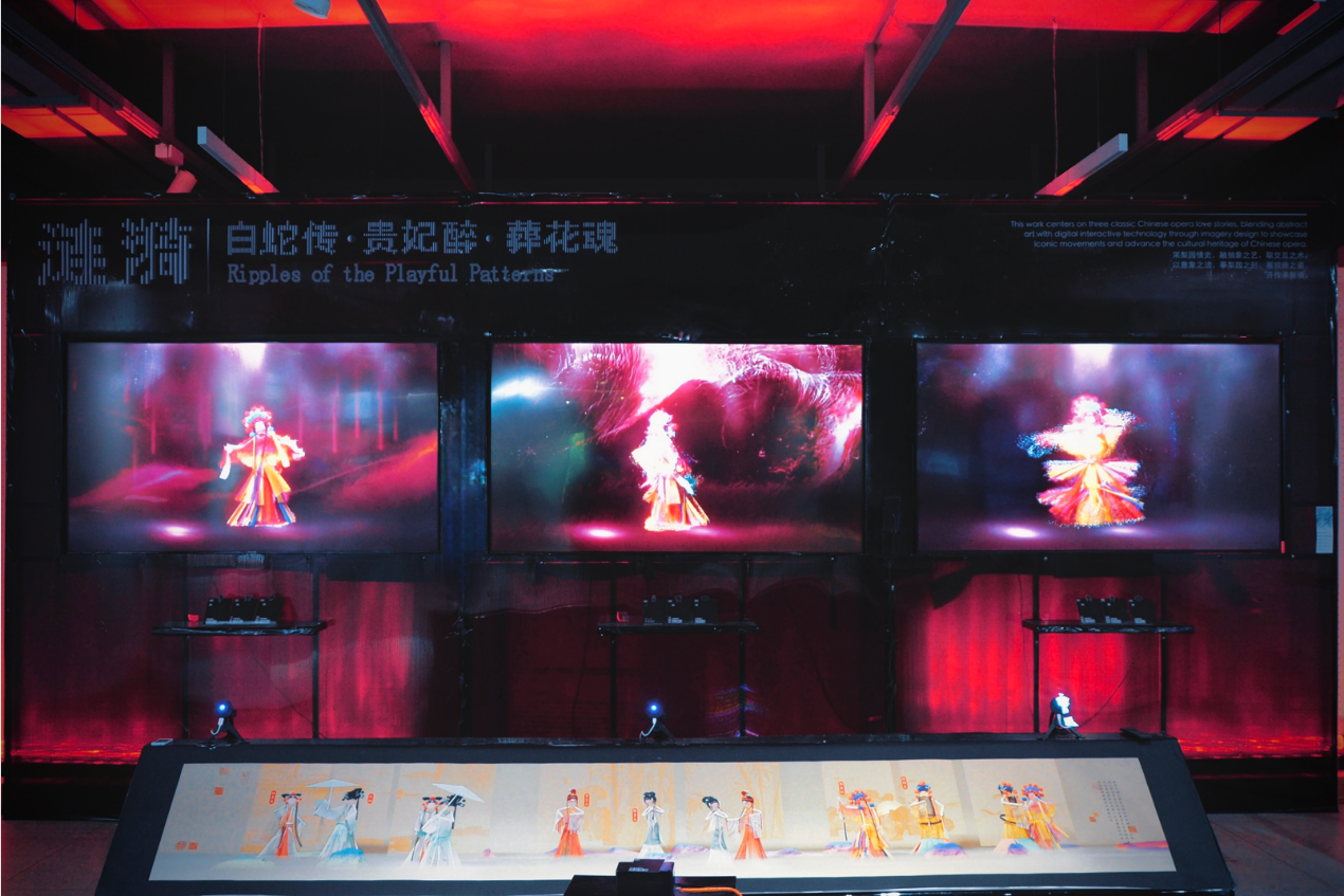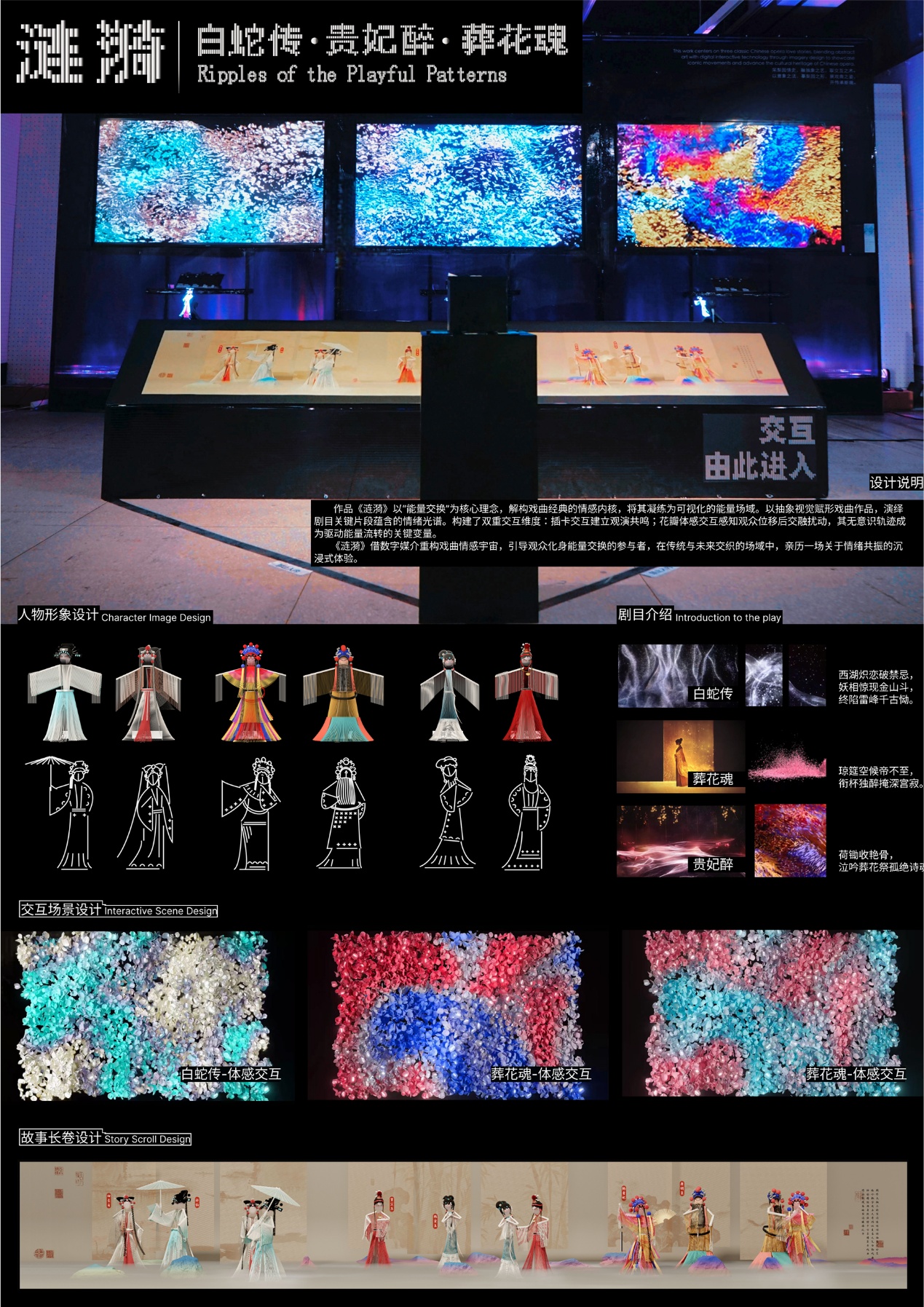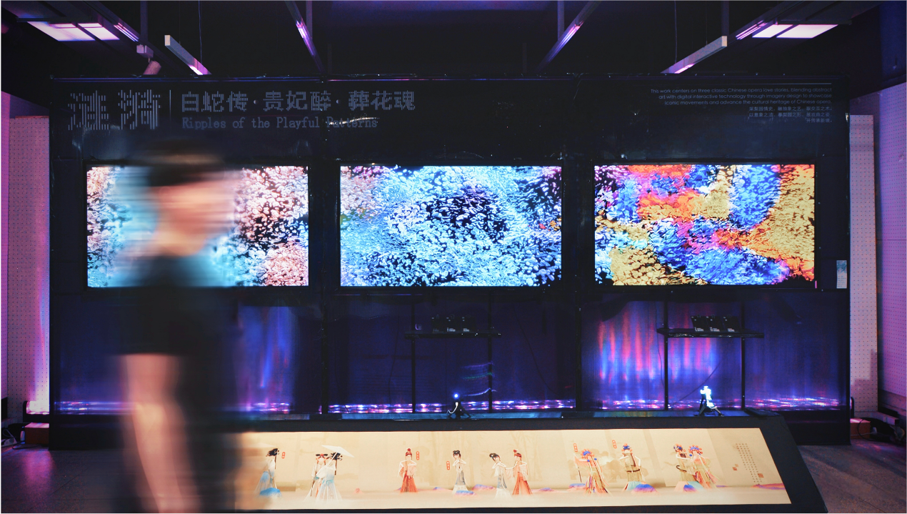 作品说明:《涟漪》以“能量交换”为核心理念,解构戏曲经典的情感内核,将其凝练为可视化的能量场域。以抽象视觉赋形戏曲作品,演绎剧目关键片段蕴含的情绪光谱。构建了双重交互维度:插卡交互建立观演共鸣;花瓣体感交互感知观众位移后交融扰动,其无意识轨迹成为驱动能量流转的关键变量。《涟漪》借数字媒介重构戏曲情感宇宙,引导观众化身能量交换的参与者,在传统与未来交织的场域中,亲历一场关于情绪共振的沉浸式体验。