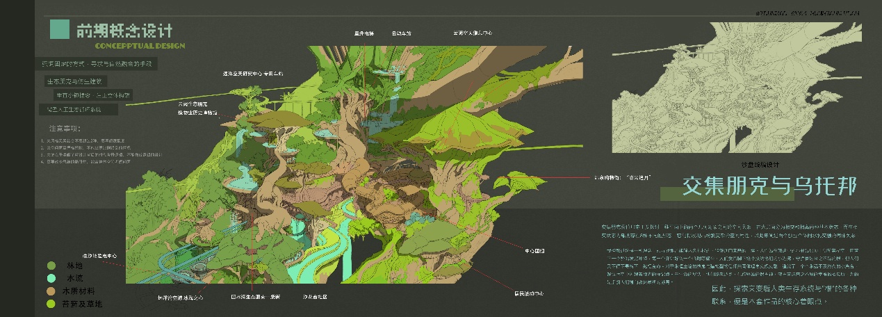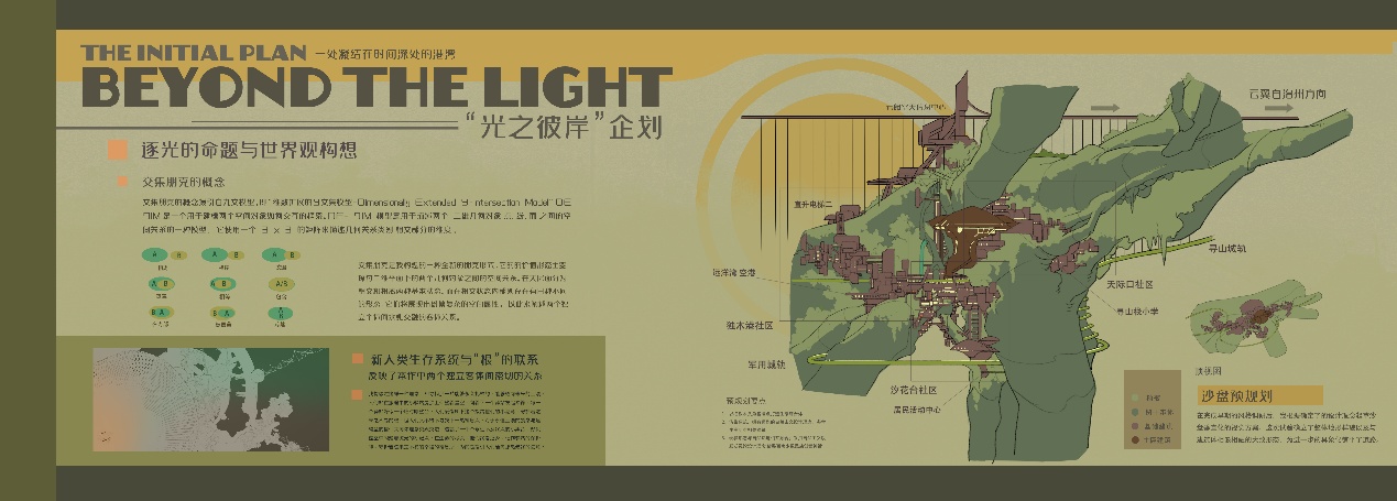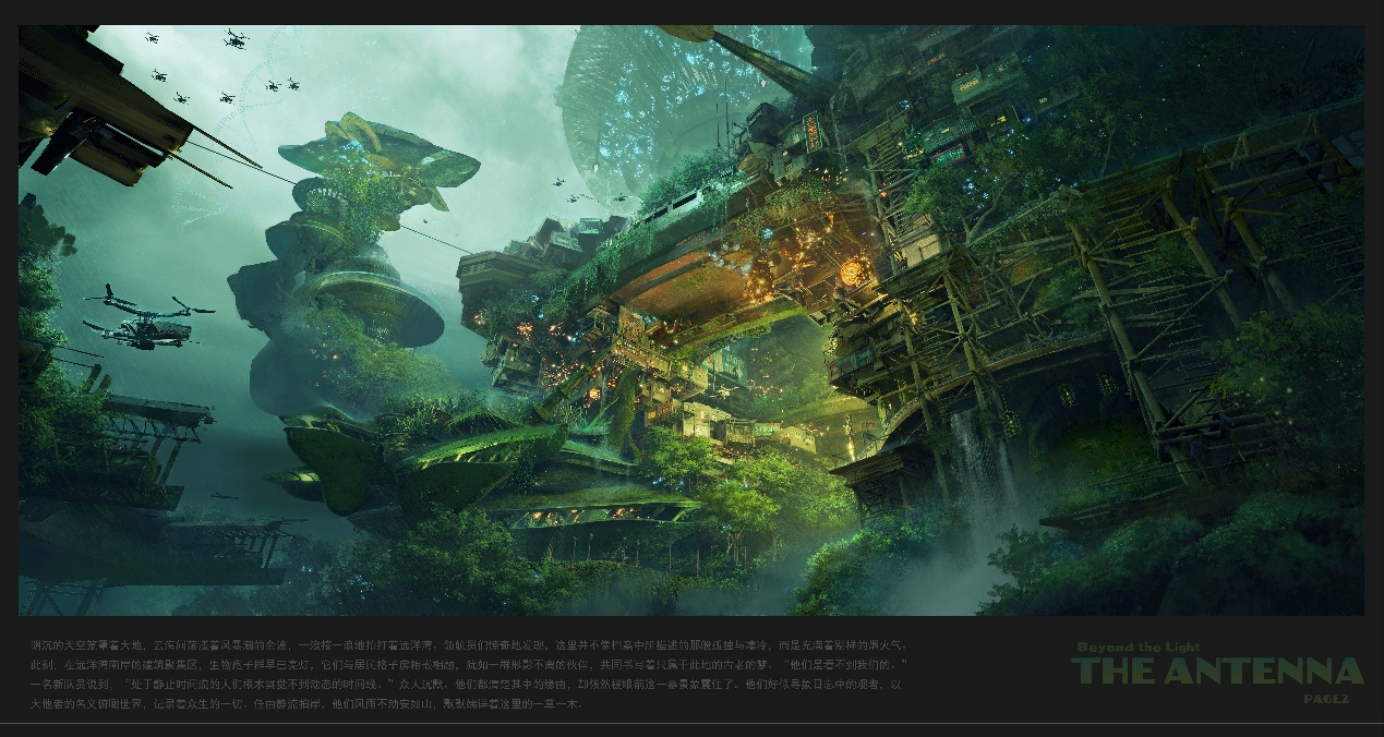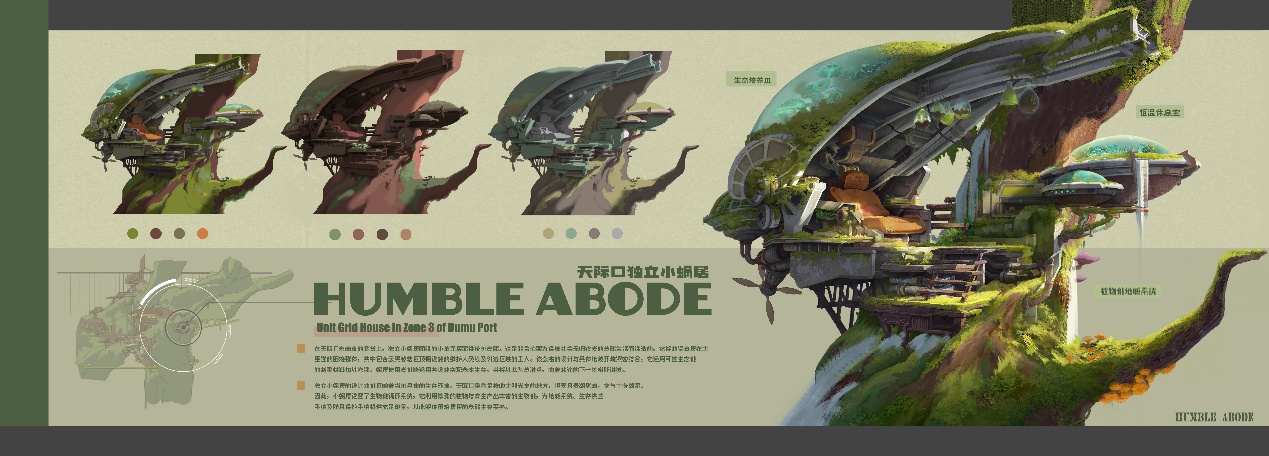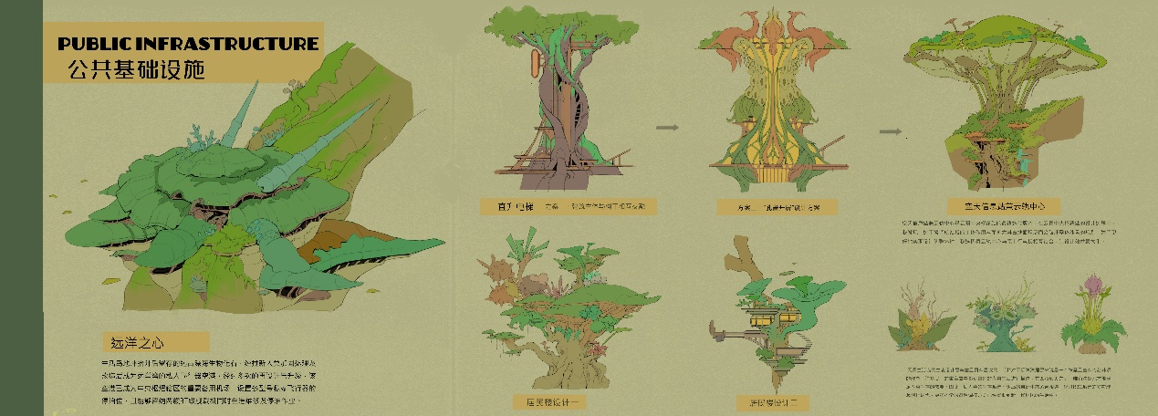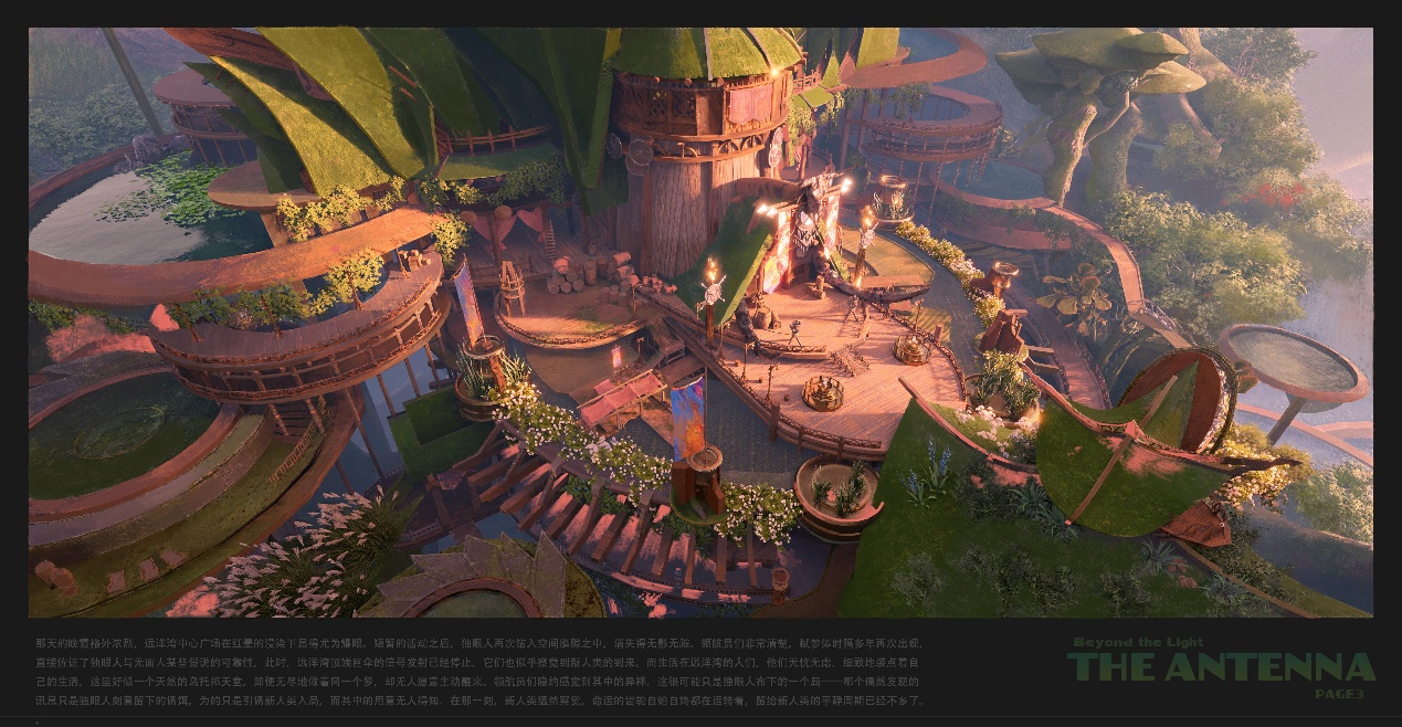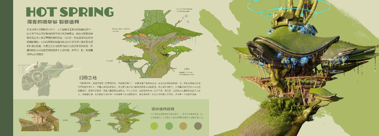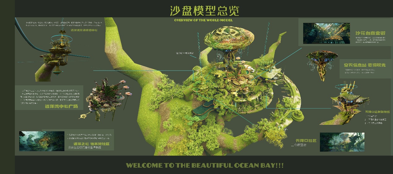 作品说明:阳光照耀着的彼方,隐藏着一处无暇的孤岛,孤岛上有座与世隔绝的小城。据传,这是最接近整个世界运行秩序的地方,一个难以到达的世界的尽头。 我们能够窥见其独特的建筑风格——以大木干为基准延伸出的枝干与小镇深度融合,蘑菇状的原始植物缔造出令人难以置信的美丽夹层。生活在远洋湾的人们对永恒土壤的执念,与建构型的信仰共同体理念相互交织融合,宛如虚空中闪烁的微光,诠释着人们对归属和传承的敬仰。