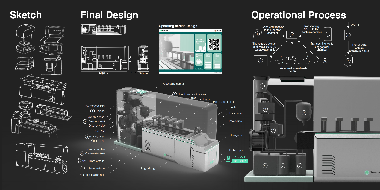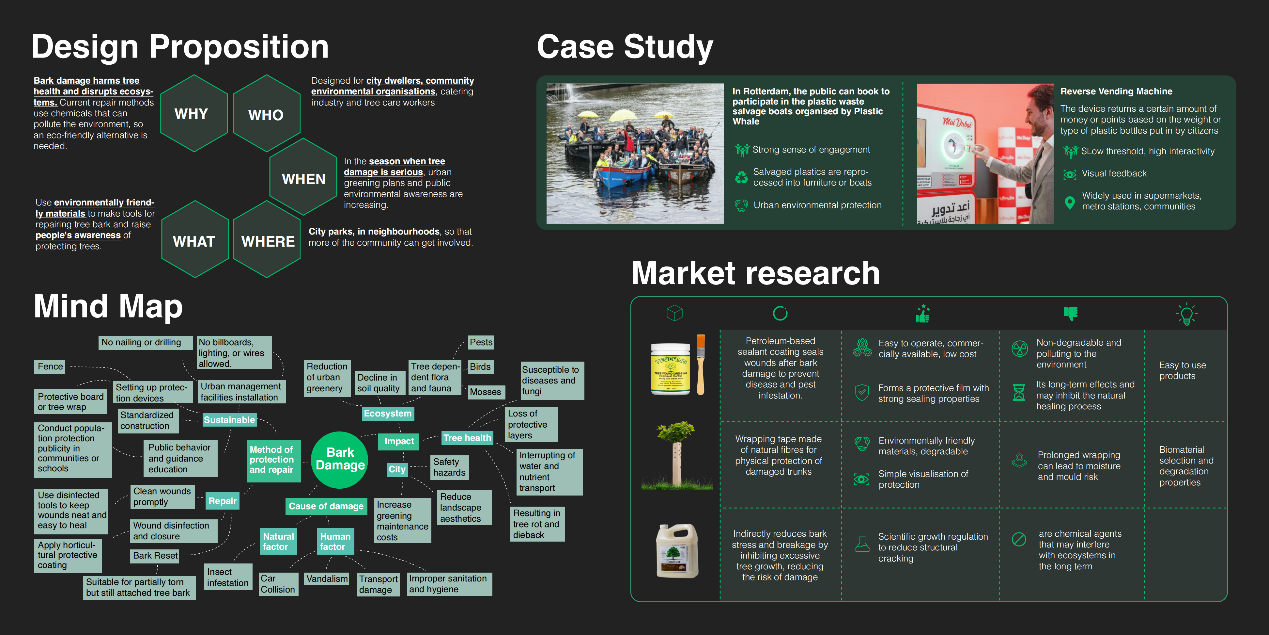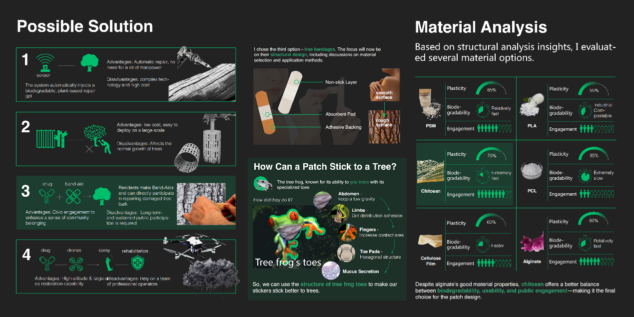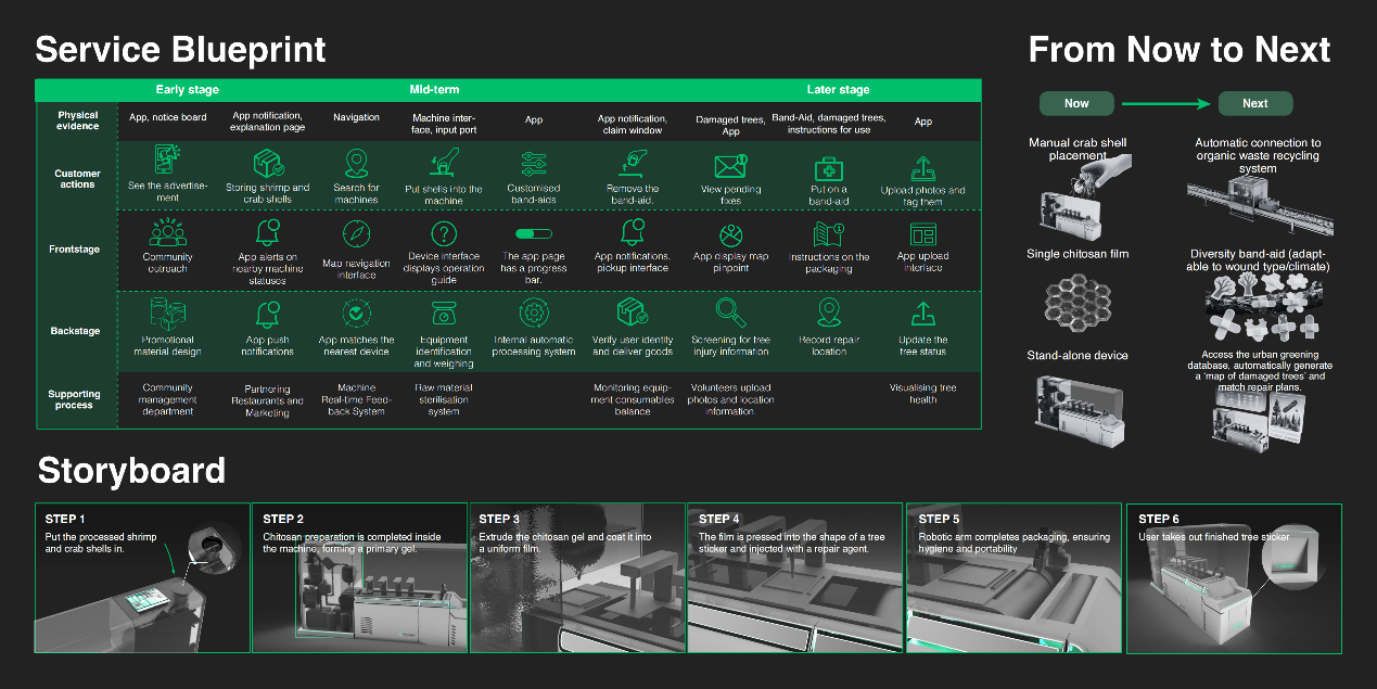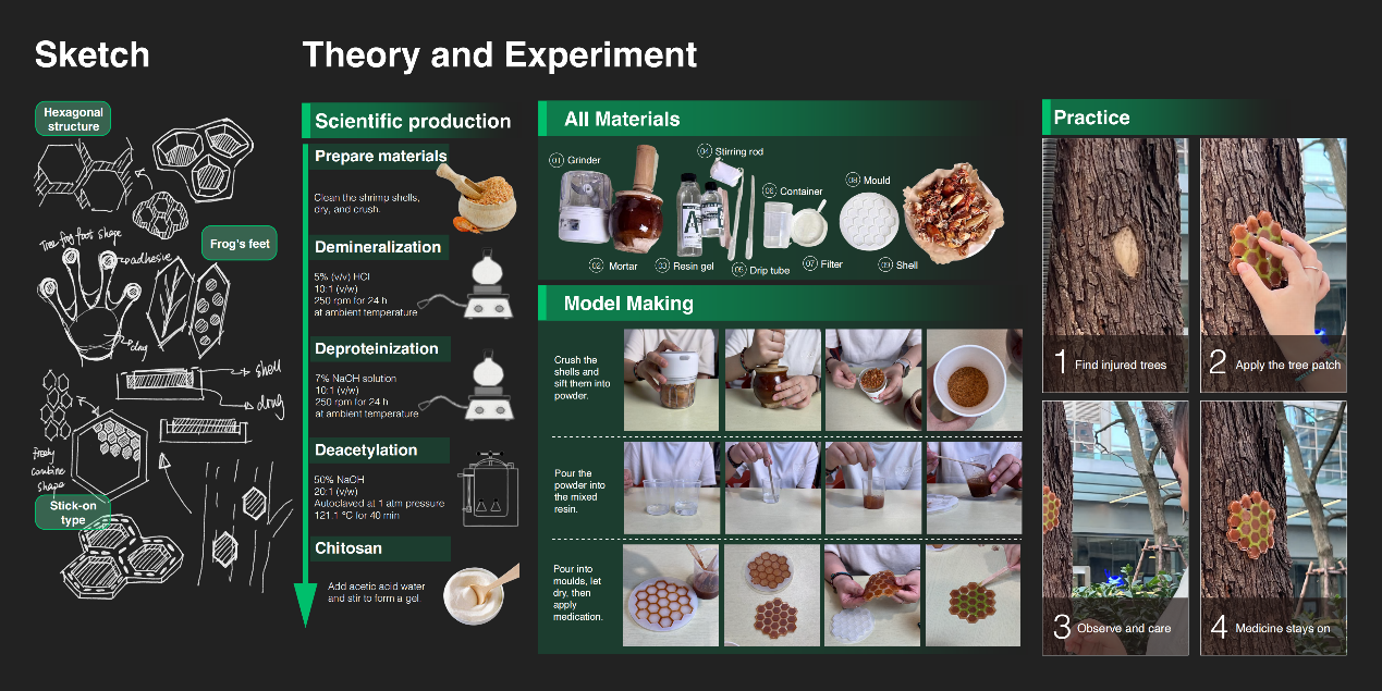 作品说明: 作品灵感源自东方“天人合一”的哲思,将自然视为有生命的共同体。城市中的树木常因施工或人为破坏而受伤,树皮破损会导致真菌、虫害入侵,影响生态循环;同时,大量蟹虾壳等餐饮废弃物被丢弃,造成浪费。本设计尝试将两者结合,以“医树如医人”的观念,创造出可贴附树皮的创可贴。材料取自蟹虾壳提炼的壳聚糖,具备抗菌、防护与可降解特性,既能守护树木伤口,也回应了循环利用的理念。作品还配合一台公共机器,居民可将日常废弃物转化为修复贴片,并亲手为树木疗伤,形成“人与自然共治”的公共实践。它既是一种生态修复工具,也是一种文化隐喻:通过小小的贴片,让人重新思考人与环境的关系,在东方美学语境中呈现出温和而深远的共生姿态。