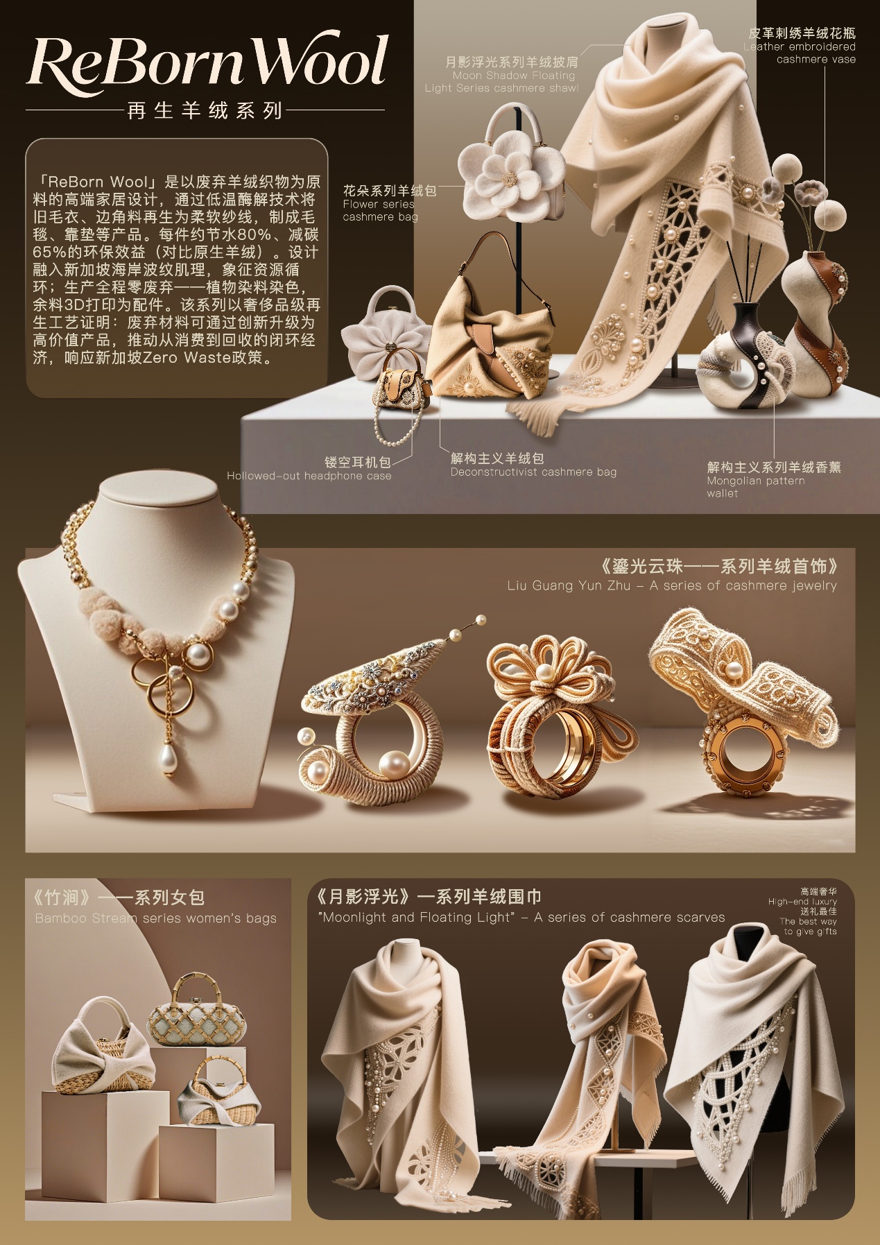 作品说明: 《ReBorn Wool》系列是以废弃羊绒织物为原料的高端家居设计,通过低温酶解技术将旧毛衣、边角料再生为柔软纱线,制成毛毯、靠垫等产品。其节水80%、减碳65%的环保效益(对比原生羊绒)。生产全程零废弃——植物染料染色,余料3D打印为配件。该系列以奢侈品级再生工艺证明:废弃材料可通过创新升级为高价值产品,推动从消费到回收的闭环经济,响应新型时尚环保的设计趋势。