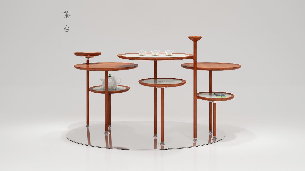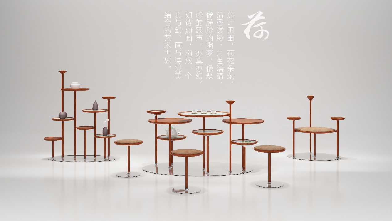 作品说明:作品“荷”灵感来源于朱自清的《荷塘月色》中描述的:莲叶田田,荷花朵朵,清香缕缕,月色溶溶,像朦胧的幽梦,像飘渺的歌声,亦真亦幻,如诗如画,构成一个真与幻、画与诗完美结合的艺术世界;以荷为原型打破传统家具固有的形态,荷叶高低错落体现作品的灵动与美感,精简于形、秀气雅致、灵性四溢,设计与艺术相结合。使用材料为原木、真皮、金属、岩板并巧妙地融入了电磁炉和手机无线快充,多种材质的搭配碰撞让空间效果更富延展性。运用现代的材质及工艺引领时尚前沿,去演绎传统中国文化的经典精髓。