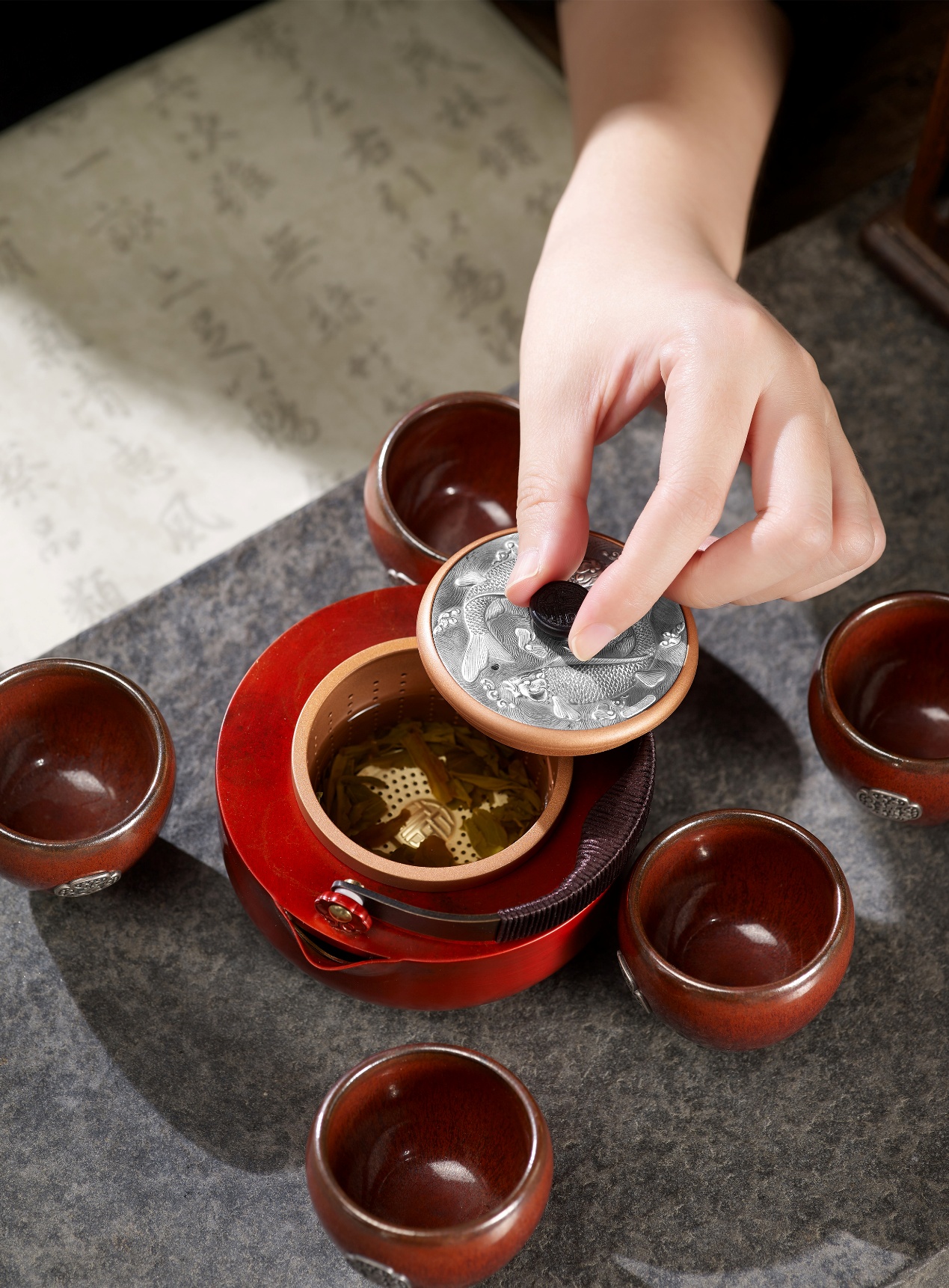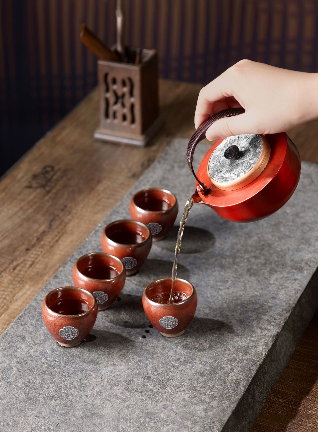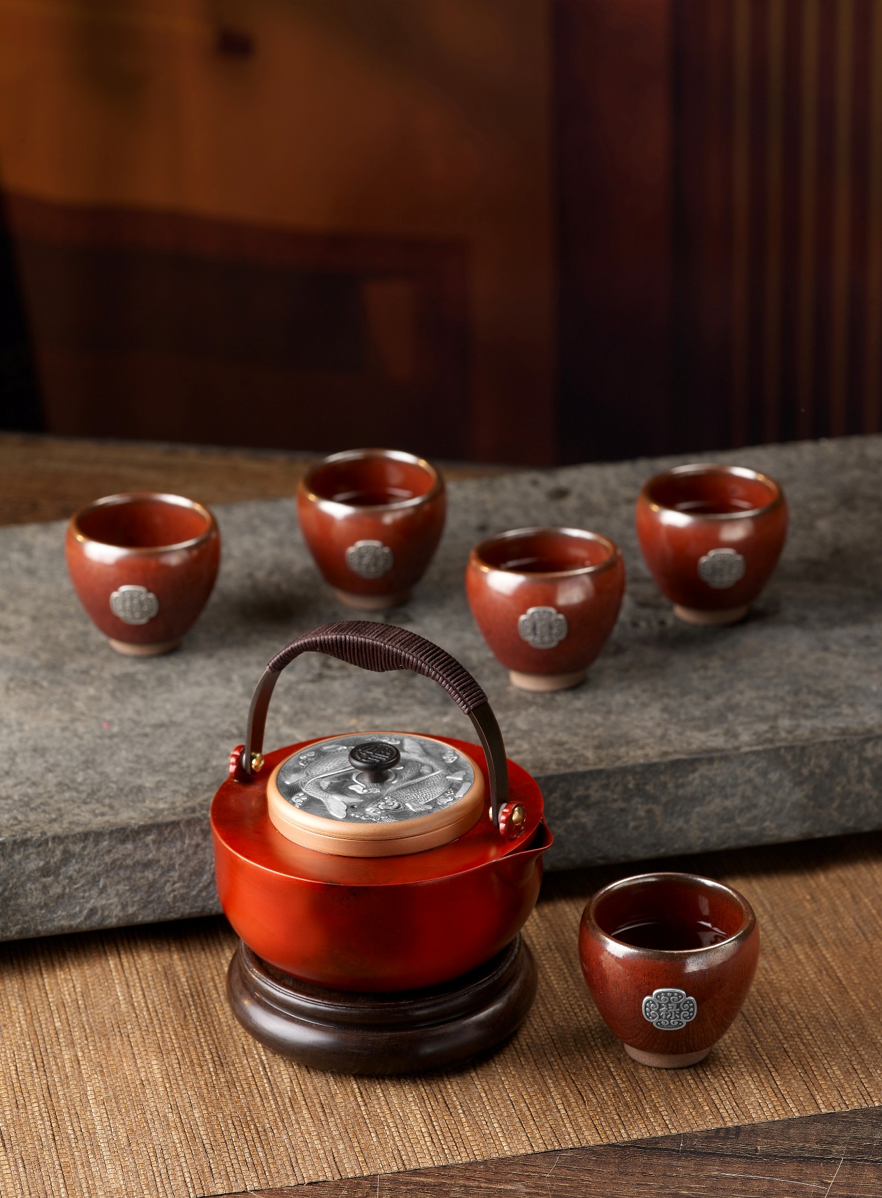 配置五只柿红建盏,外壁饰錾刻五福如意银片,寓意五福临门,鸿福大展。