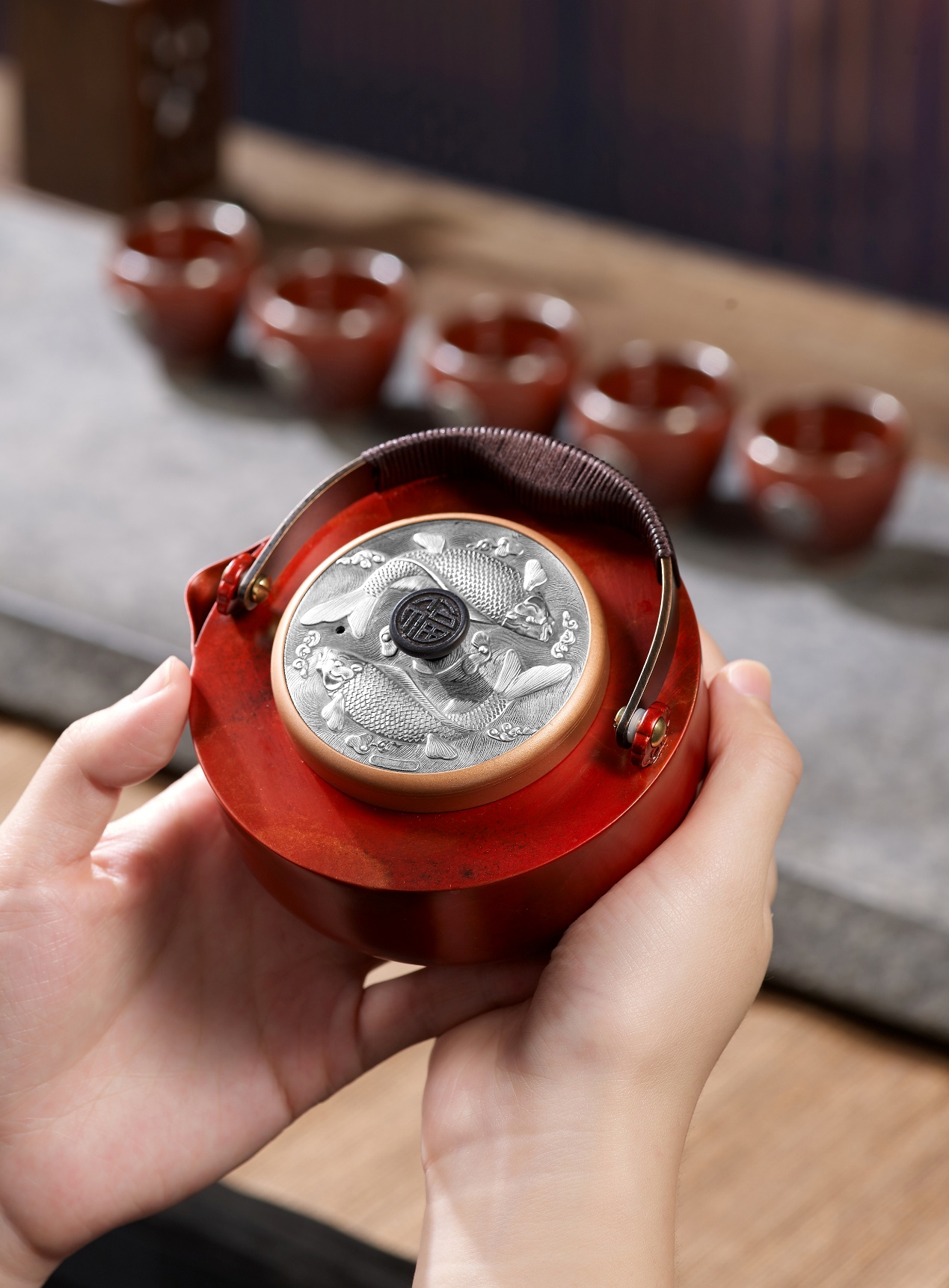 壶身高温热着富贵朱红,融金、黑两色,吉庆悦目,抗氧化;