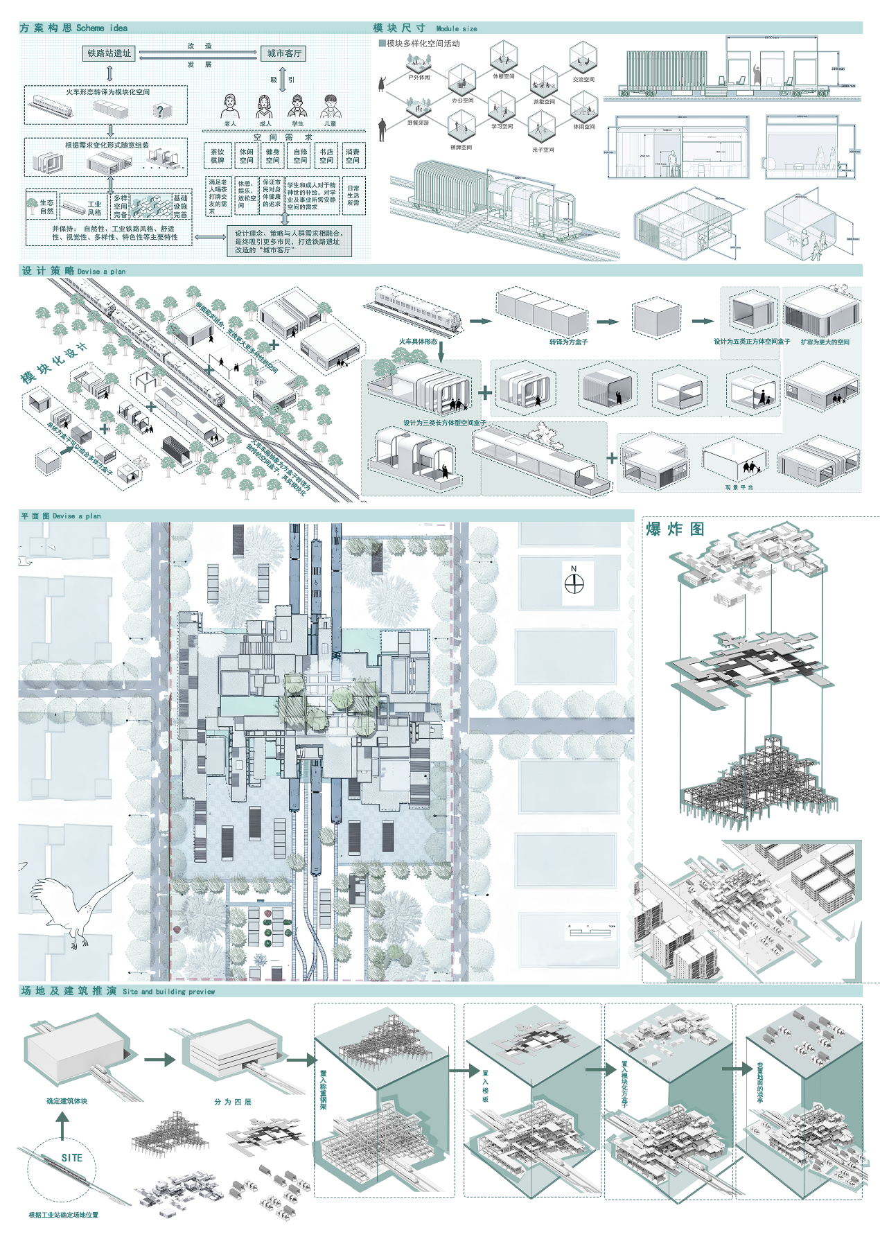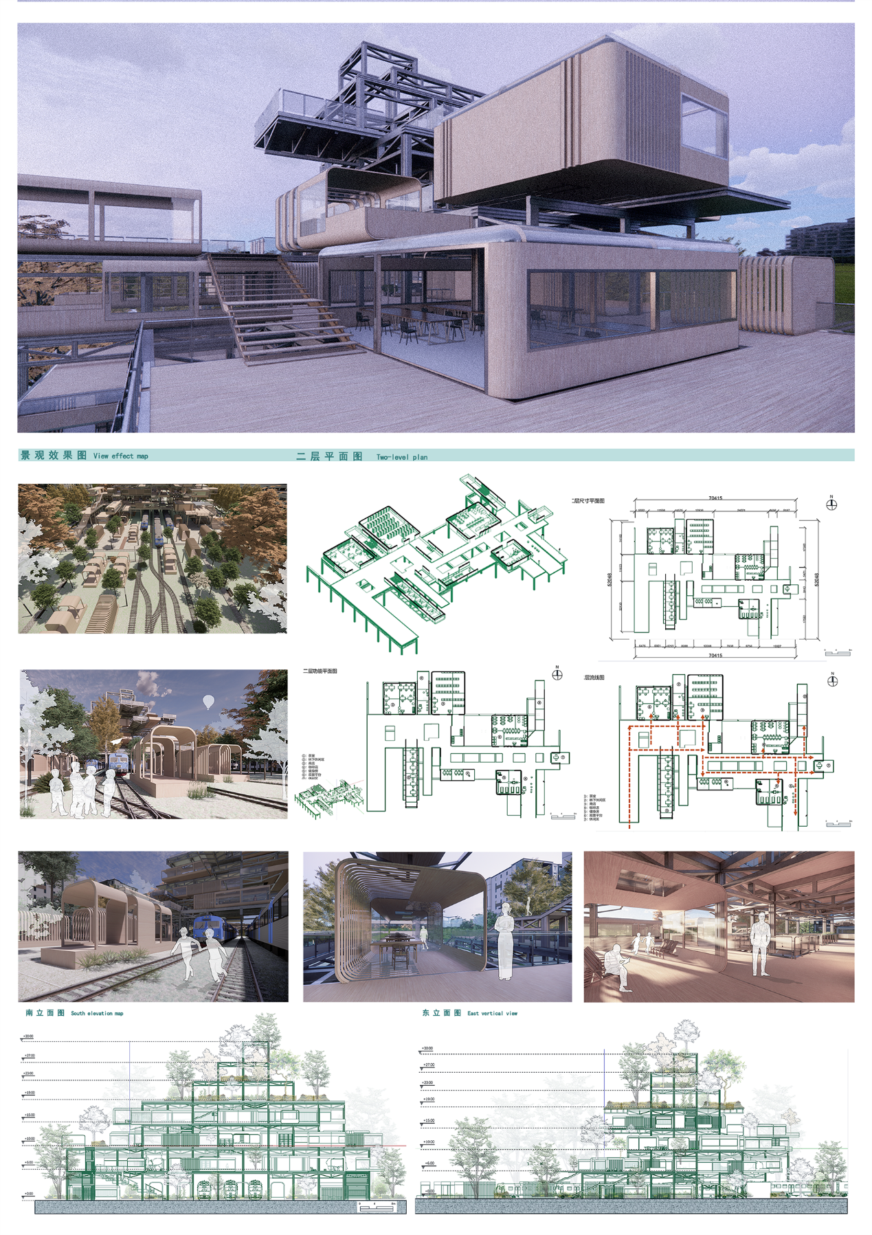 作品说明:深圳罗湖区草埔清河村的铁路遗址曾经是经济发展区,是内地联系香港的中转站,是一座城市发展的印记,但在时代的浪潮下逐渐落寞、被遗忘。但是罗湖区铁路遗址保存完好且保留最原始形态的火车头并形成了区域内网红打卡点,所以本次方案的选址选于此,并结合当地现状结合特有的地区特色,分析其所需要的不同功能,结合城市客厅的概念,通过模块化设计,实现铁路遗址改造与生态环境相结合的多维度的、互通互融的绿色开放环境,打造废弃铁路站改造建筑休闲综合体的设计。