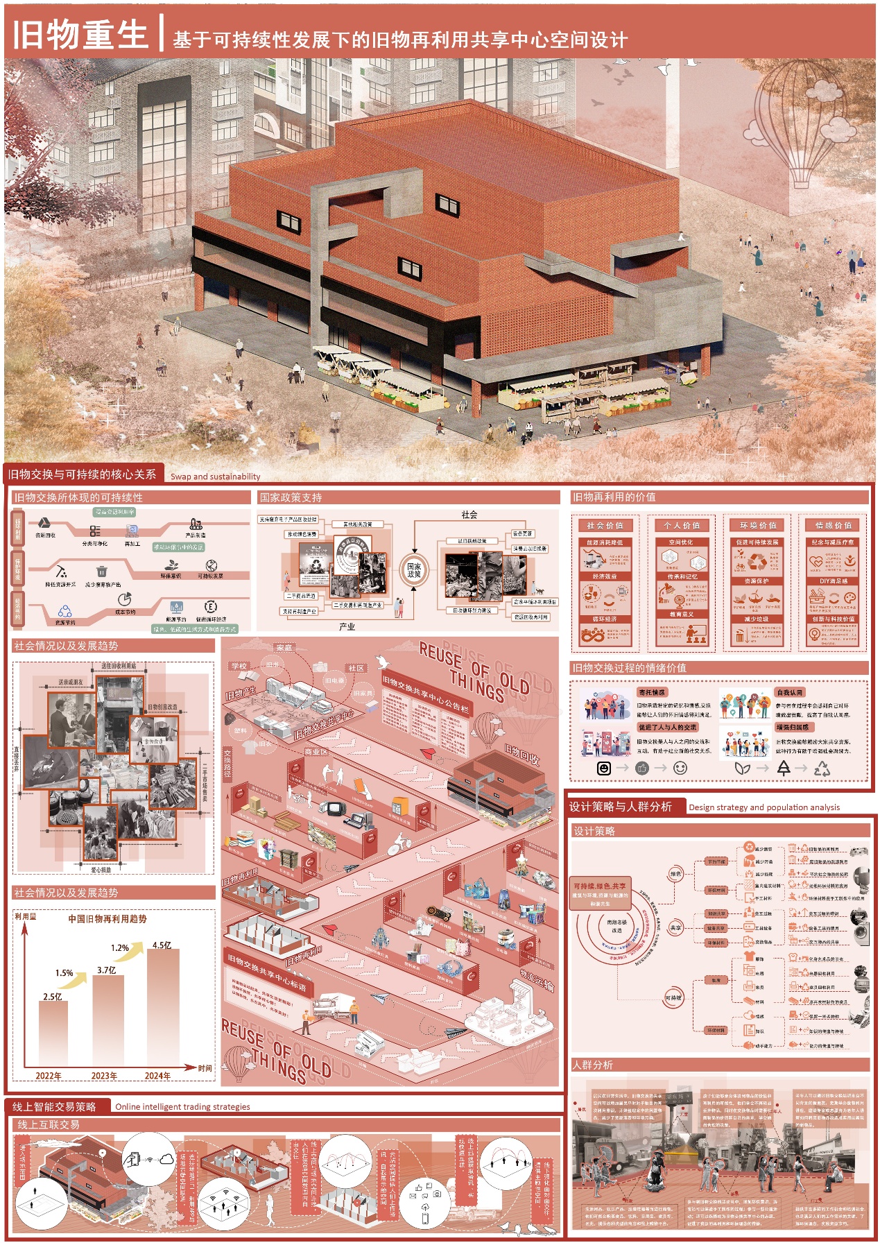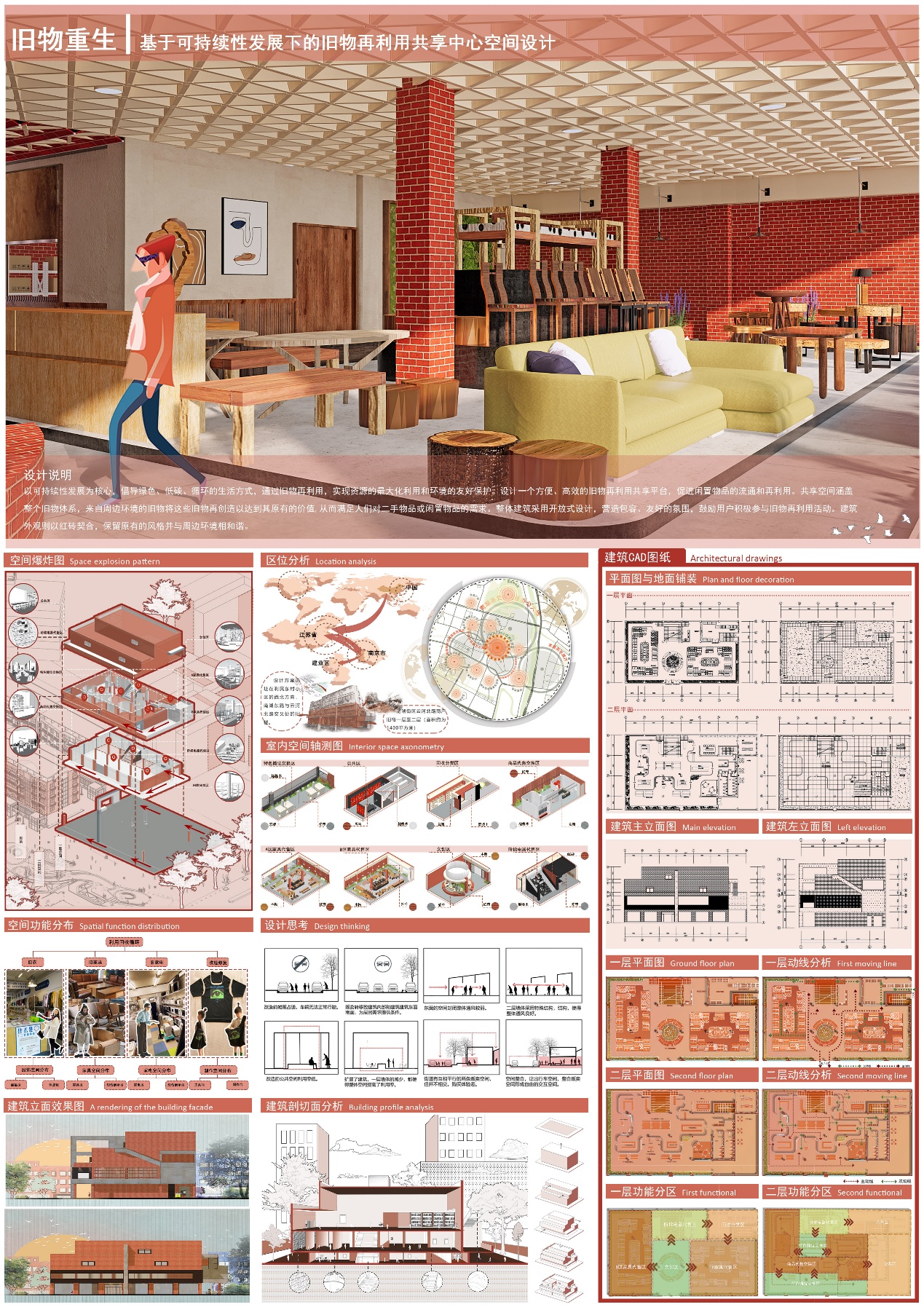 作品说明:以可持续性发展为核心,倡导绿色、低碳、循环的生活方式,通过旧物再利用,实现资源的最大化利用和环境的友好保护,设计一个方便、高效的旧物再利用共享平台,促进闲置物品的流通和再利用。共享空间涵盖整个旧物体系,来自周边环境的旧物将这些旧物再创造以达到其原有的价值,从而满足人们对二手物品或闲置物品的需求,整体建筑采用开放式设计,营造包容、友好的氛围,鼓励用户积极参与旧物再利用活动。建筑外观则以红砖契合,保留原有的风格并与周边环境相和谐。