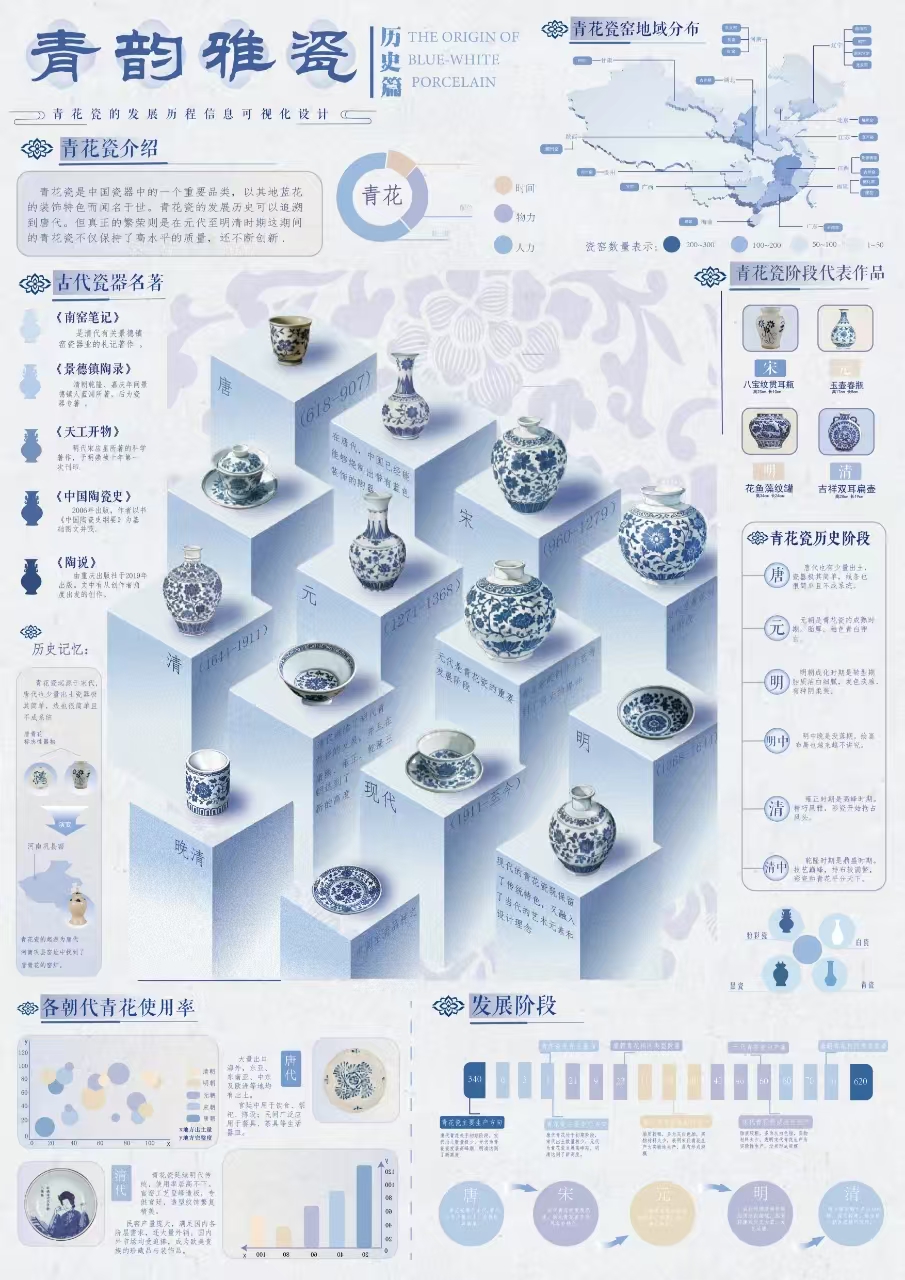 作品说明:青花瓷信息可视化设计以传统元素为基石,融合现代信息设计逻辑,通过色彩、图案、器型的创意转化,将复杂文化、工艺信息结构化呈现。既保留青花瓷的文化基因,又以直观、交互形式适配当代传播需求,助力受众在视觉体验中读懂青花瓷的历史厚度、工艺精度与文化广度,实现传统文化的创新表达与有效传承 。