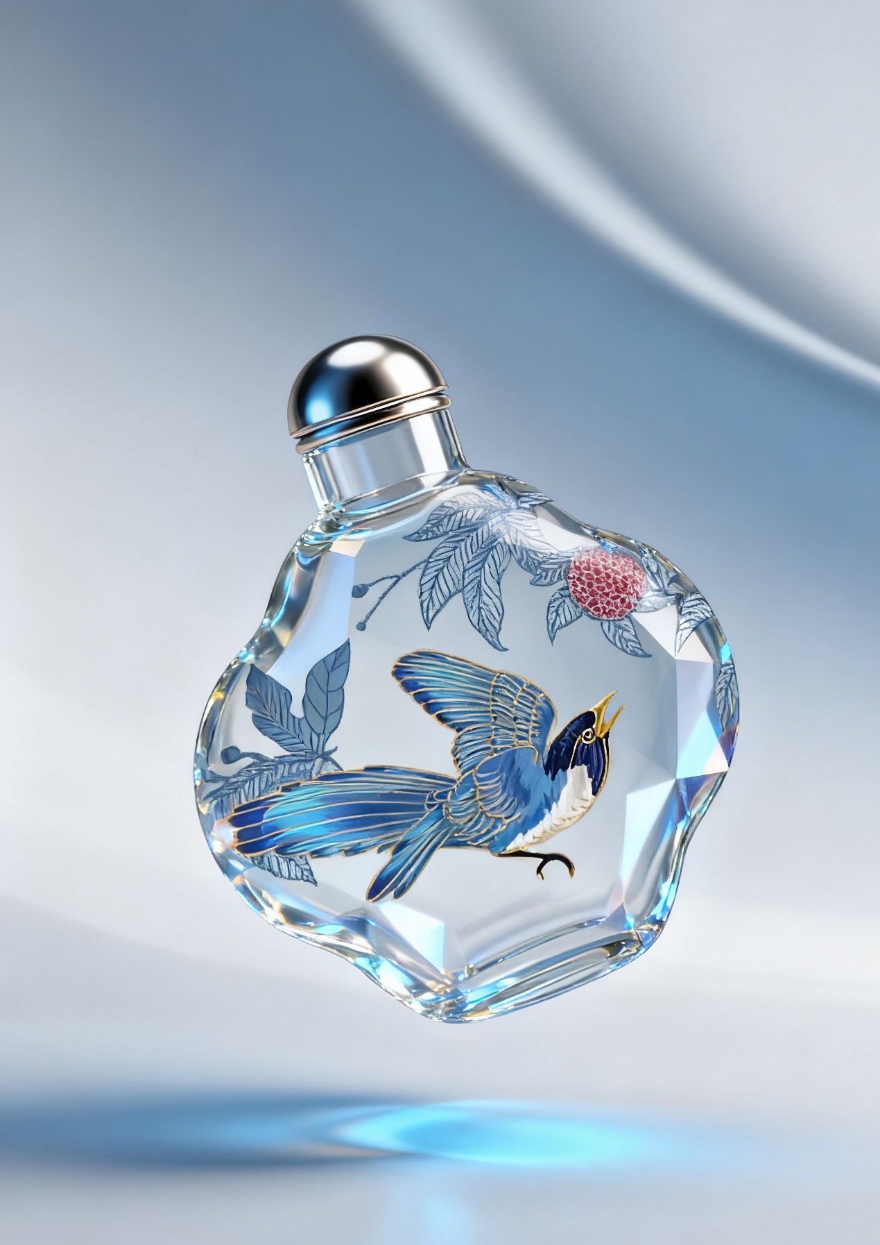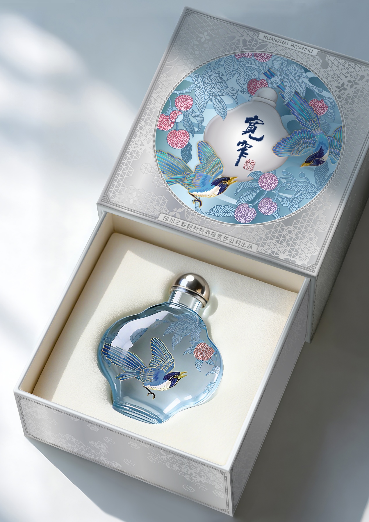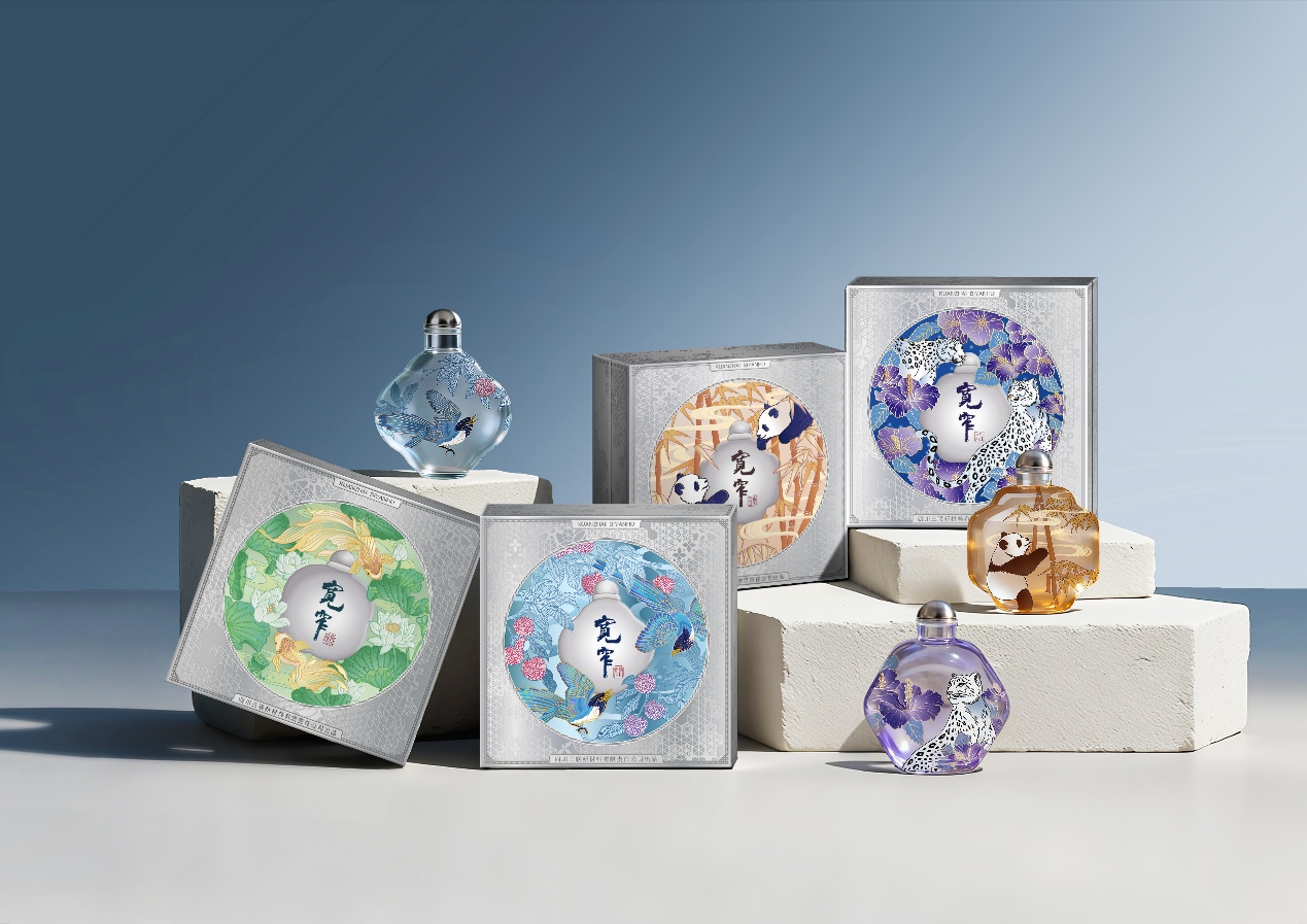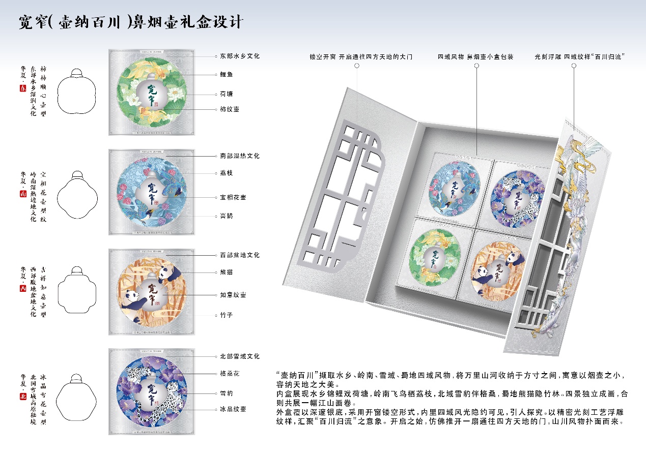 作品说明:宽窄“壶纳百川”鼻烟壶包装,创意源于中华文化“海纳百川”的包容气度。撷取水乡、岭南、雪域、蜀地四域风物,将万里山河收纳于方寸之间,寓意以烟壶之小,容纳天地之大美。
