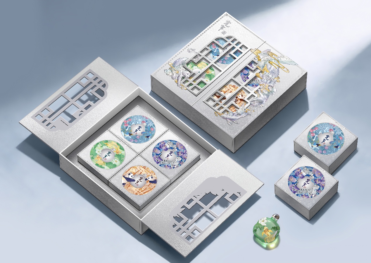 内盒:刻画四方灵韵,水乡锦鲤戏荷塘,岭南飞鸟栖荔枝,北域雪豹伴格桑,蜀地熊猫隐竹林。四景独立成画,合则共展一幅江山画卷。