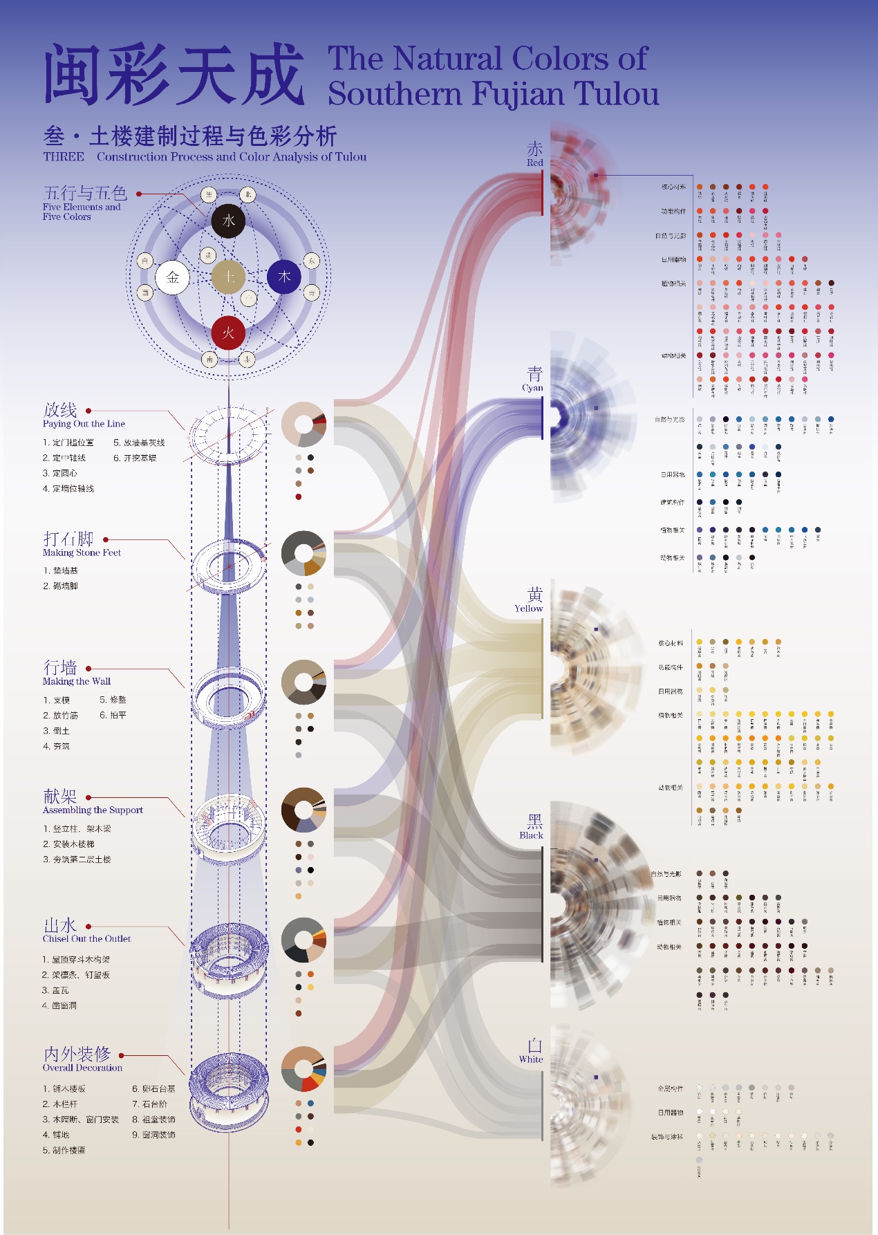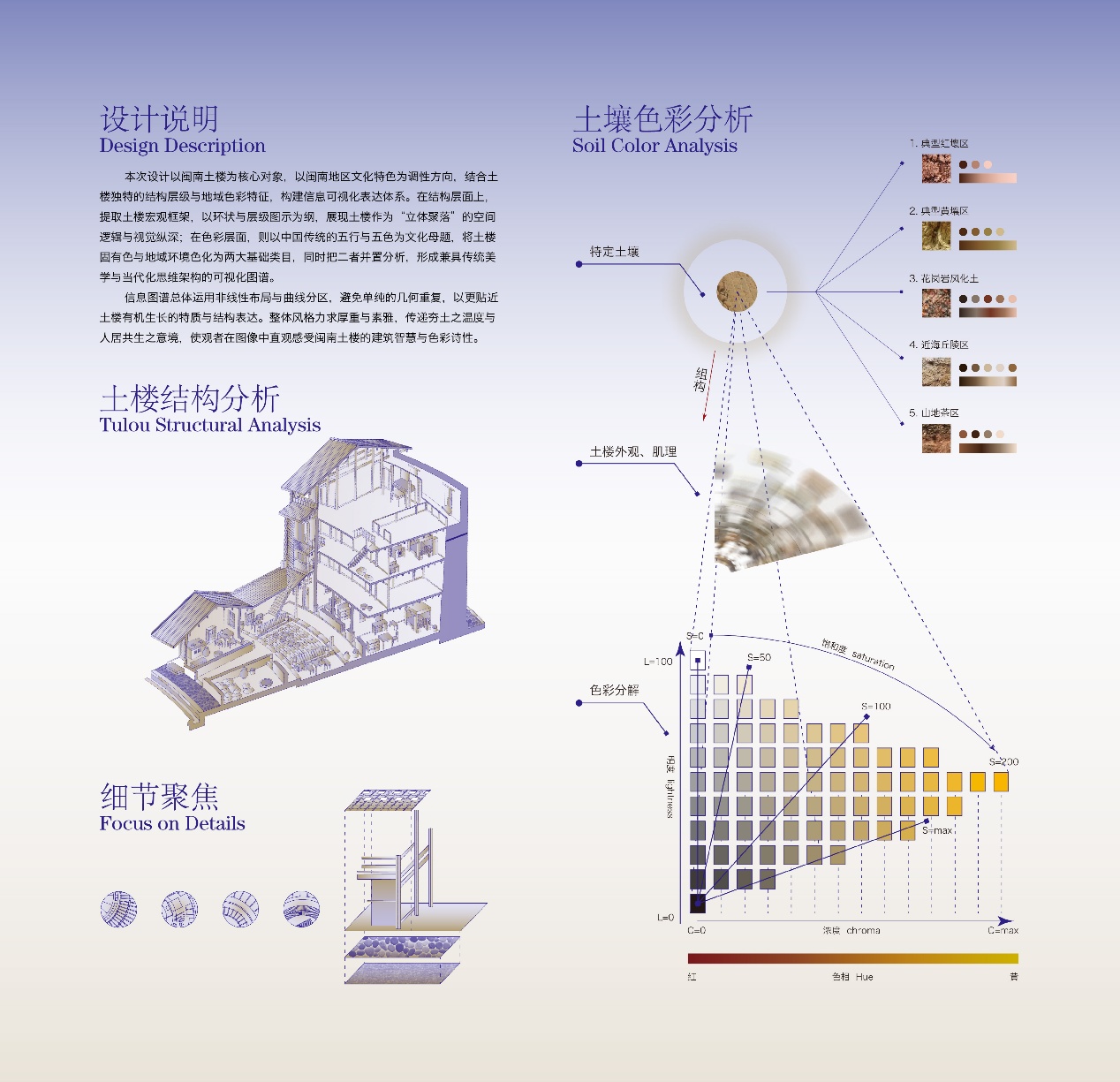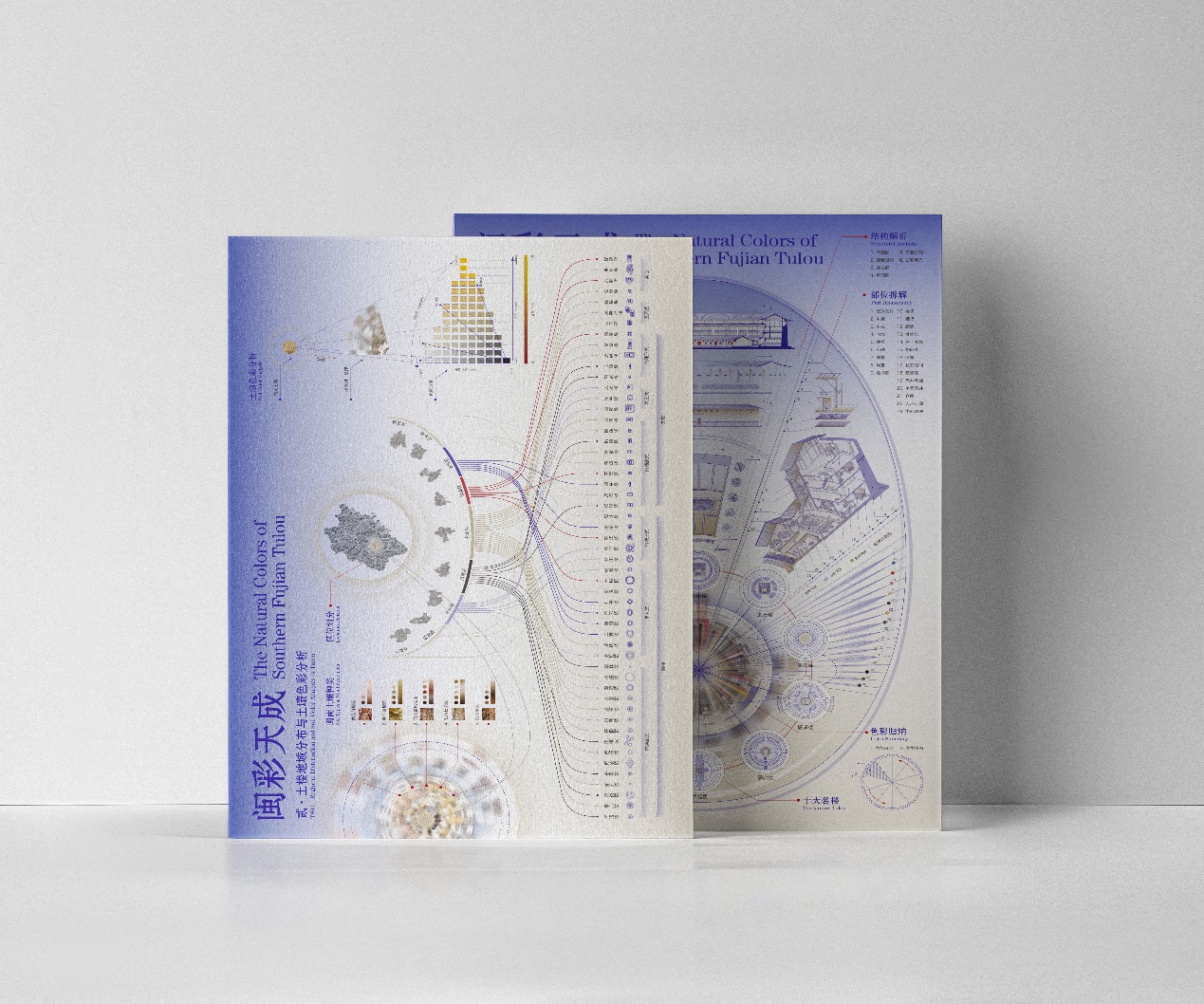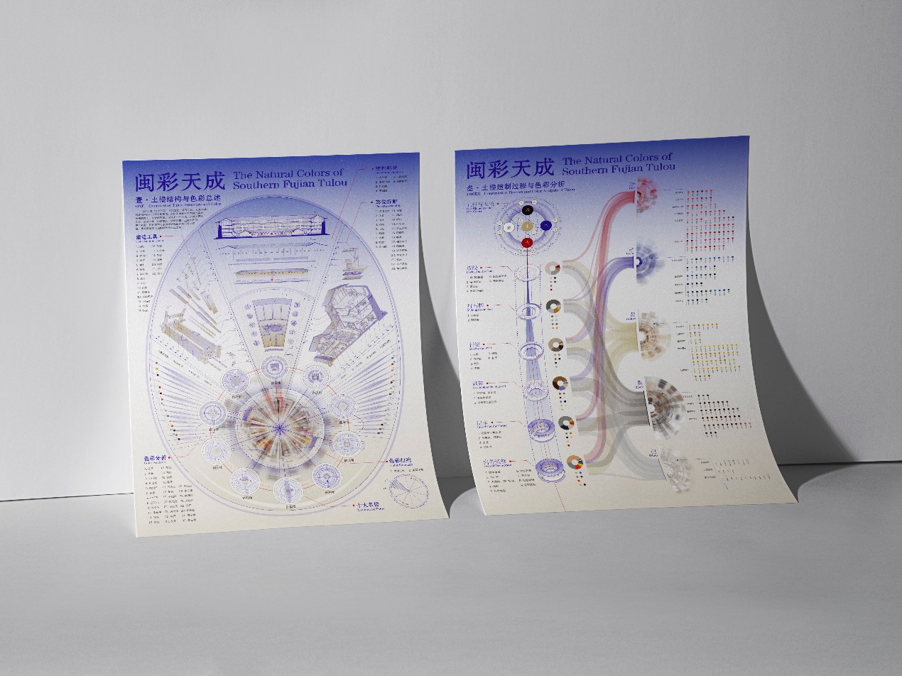 作品说明:本次设计以闽南土楼为核心对象,以闽南地区文化特色为调性方向,结合土楼独特的结构层级与地域色彩特征,构建信息可视化表达体系。在结构层面上,提取土楼宏观框架,以环状与层级图示为纲,展现土楼作为“立体聚落”的空间逻辑与视觉纵深;在色彩层面,则以中国传统的五行与五色为文化母题,将土楼固有色与地域环境色化为两大基础类目,同时把二者并置分析,形成兼具传统美学与当代化思维架构的可视化图谱。