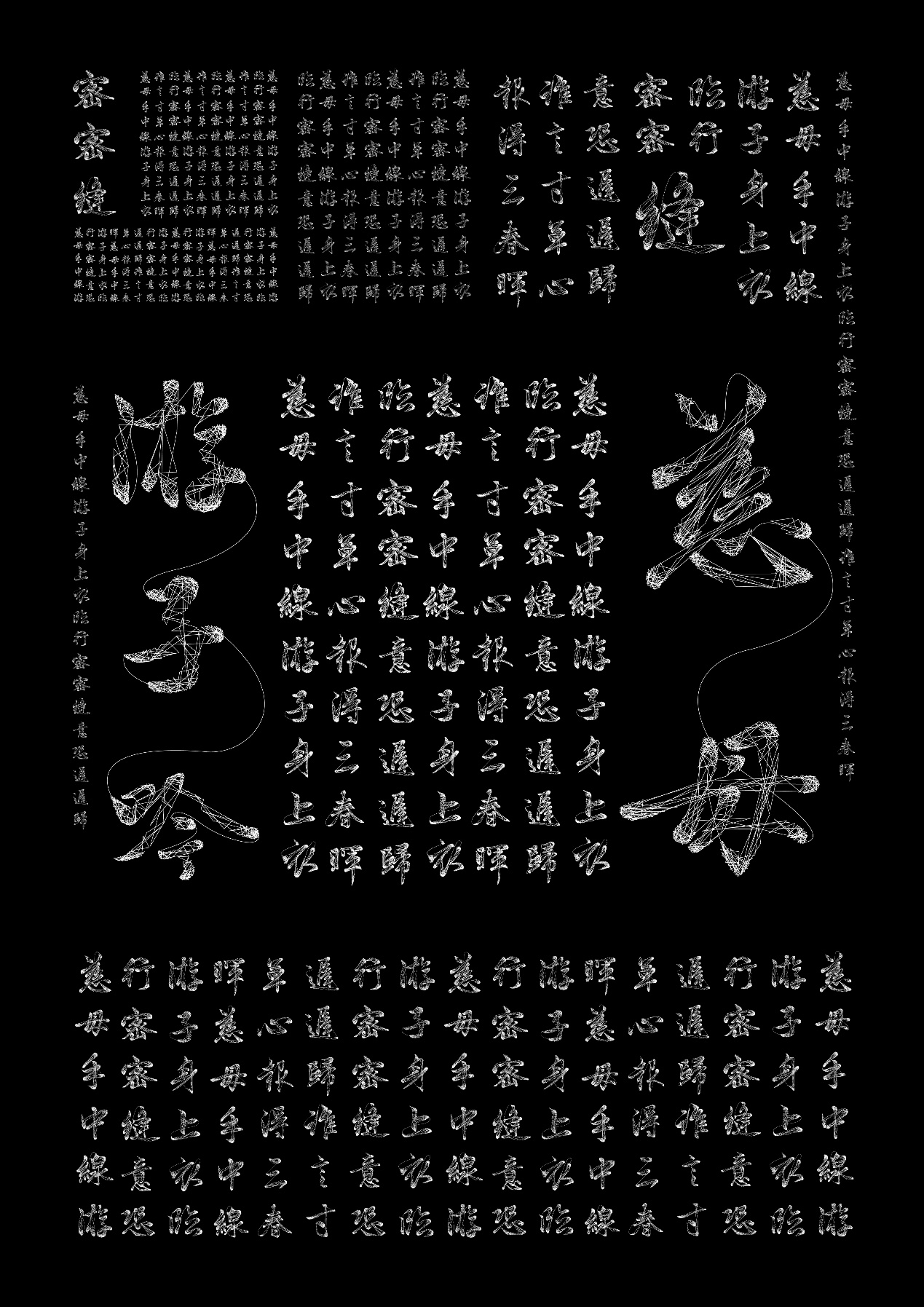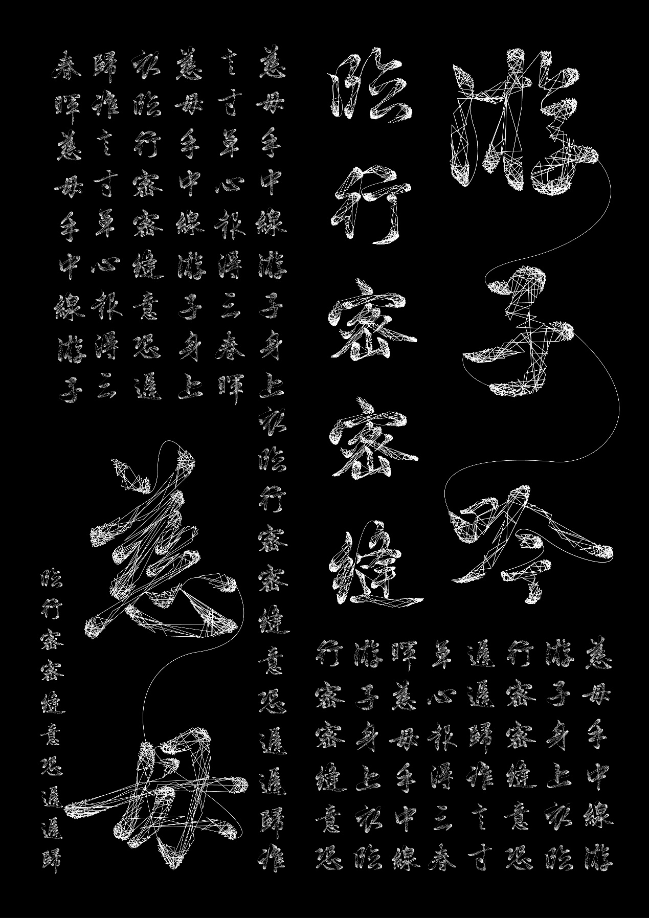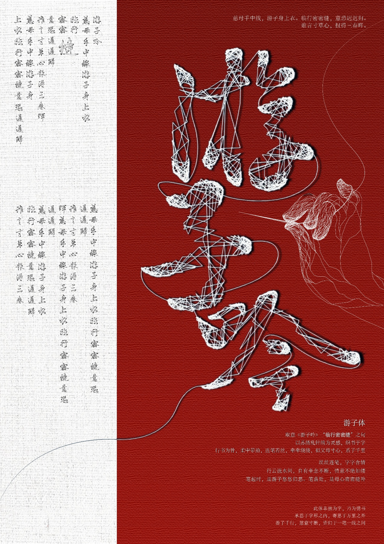作品说明:本字体以《游子吟》中“临行密密缝”为灵感,融合苏绣中的乱针绣技法,寄托父母对游子深切牵挂之情。字体以行书为骨,线为体,采用连笔设计与疏密线条表达书写节奏与情感起伏,呈现出中国汉字的筋骨之美与行云流水般的一气呵成。