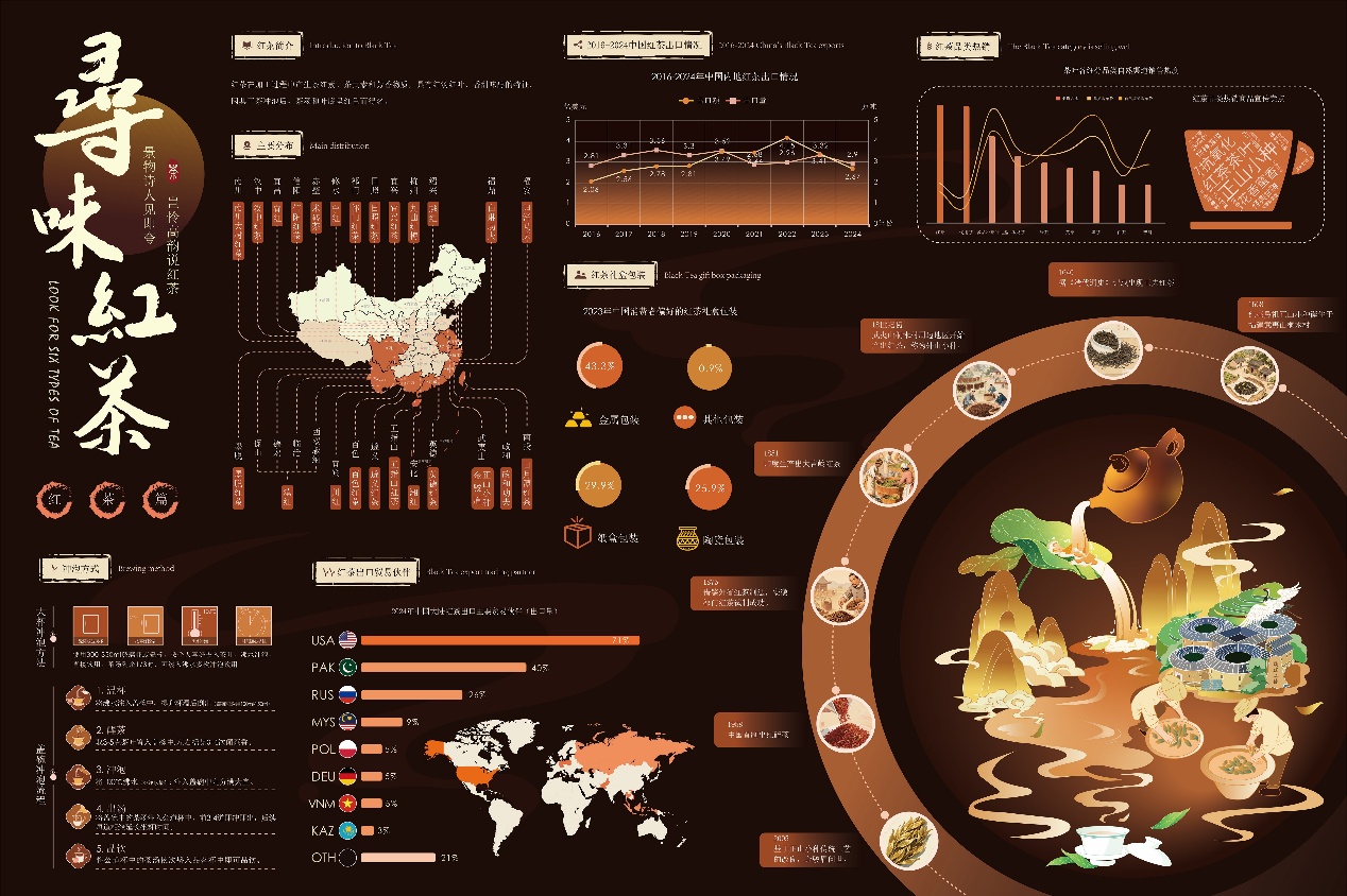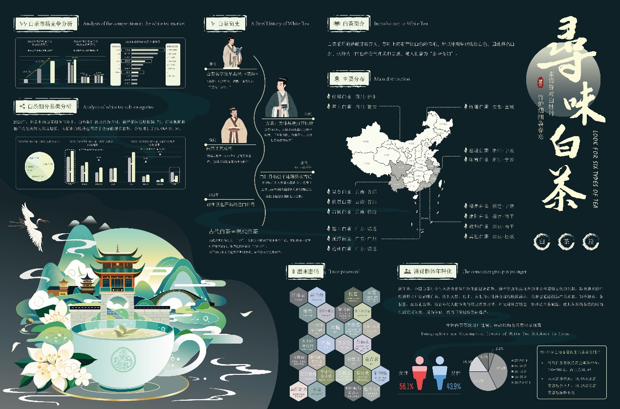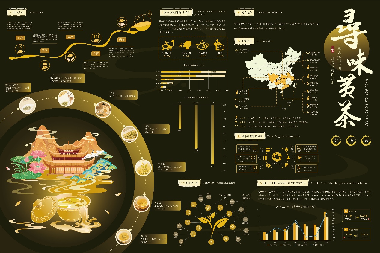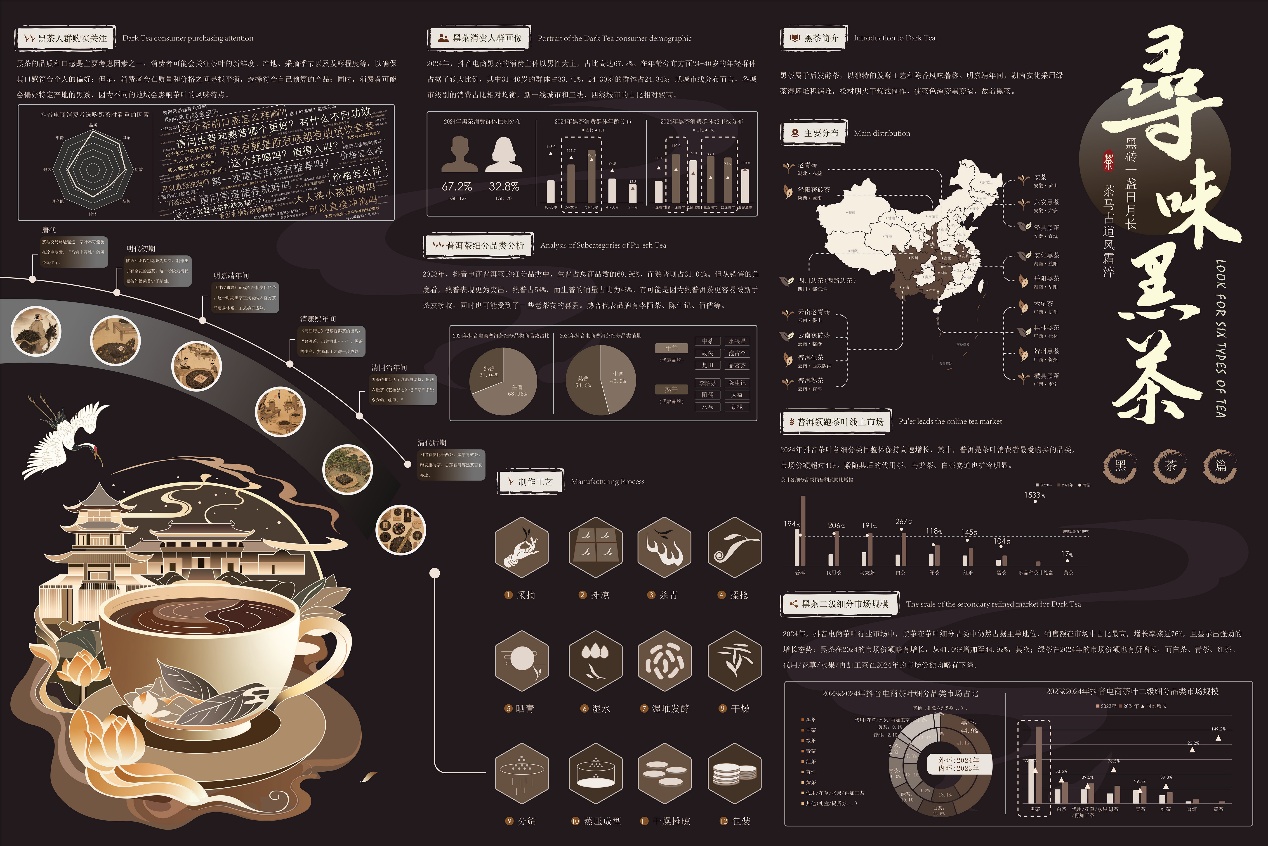 作品说明:中国茶文化的历史可以追溯到约五千年前,具有深厚的文化底蕴和广泛的社会影响,本次设计旨在通过系统梳理六大茶类的历史、产地、工艺及文化特征,结合视觉设计手段,以现代设计语言呈现传统茶文化,将庞杂的茶类知识转化为直观、易懂的视觉语言,提升公众认知,促进其创造性转化与创新性发展。