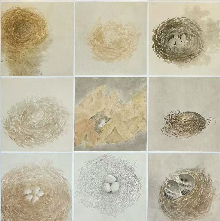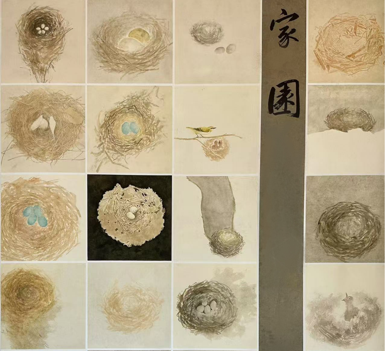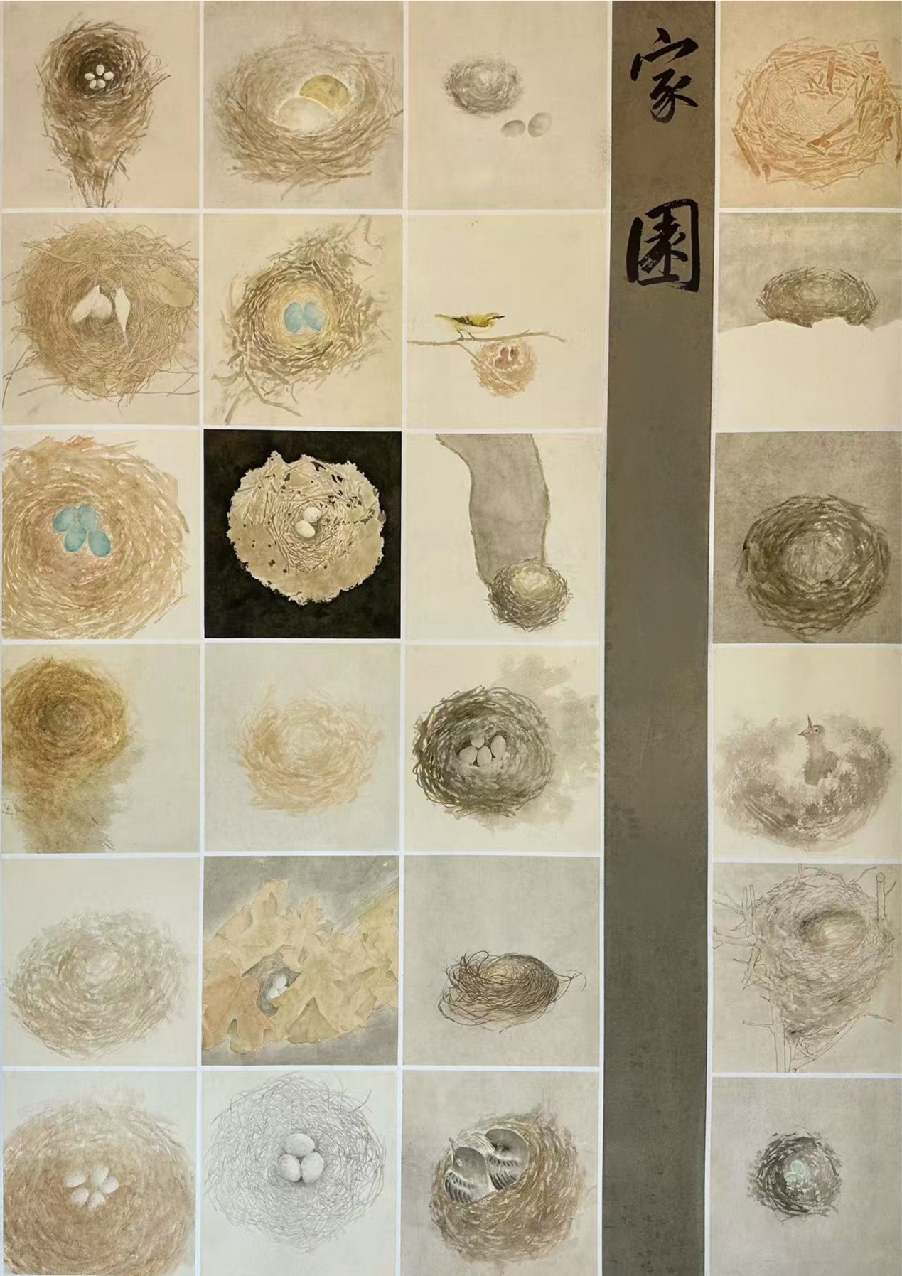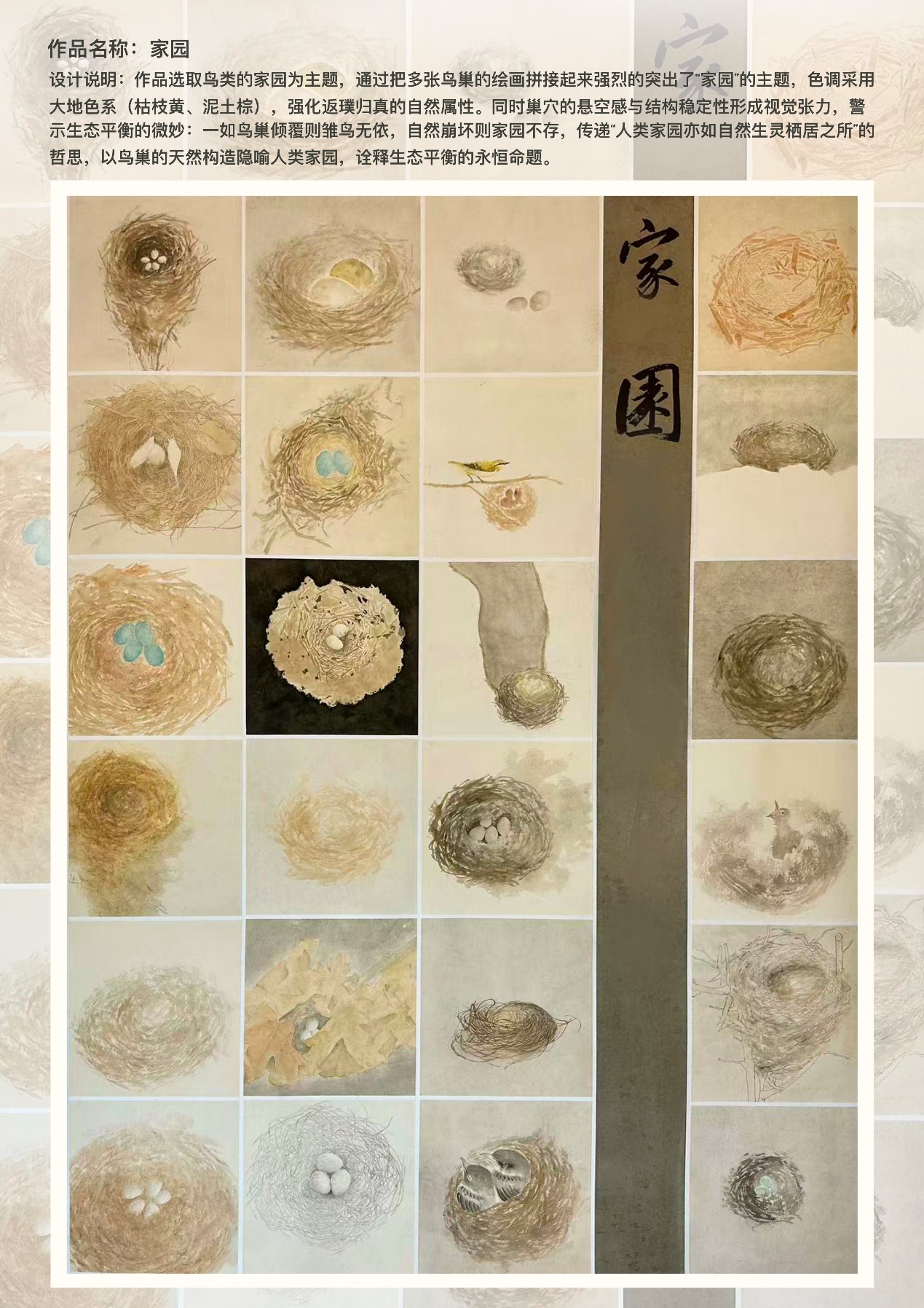 设计说明:该国画作品通过把多张鸟巢的绘画拼接起来强烈的突出了“家园”的主题,色调采用大地色系(枯枝黄、泥土棕),强化返璞归真的自然属性。同时巢穴的悬空感与结构稳定性形成视觉张力,警示生态平衡的微妙:一如鸟巢倾覆则雏鸟无依,自然崩坏则家园不存,传递“人类家园亦如自然生灵栖居之所”的哲思,以鸟巢的天然构造隐喻人类家园,诠释生态平衡的永恒命题。